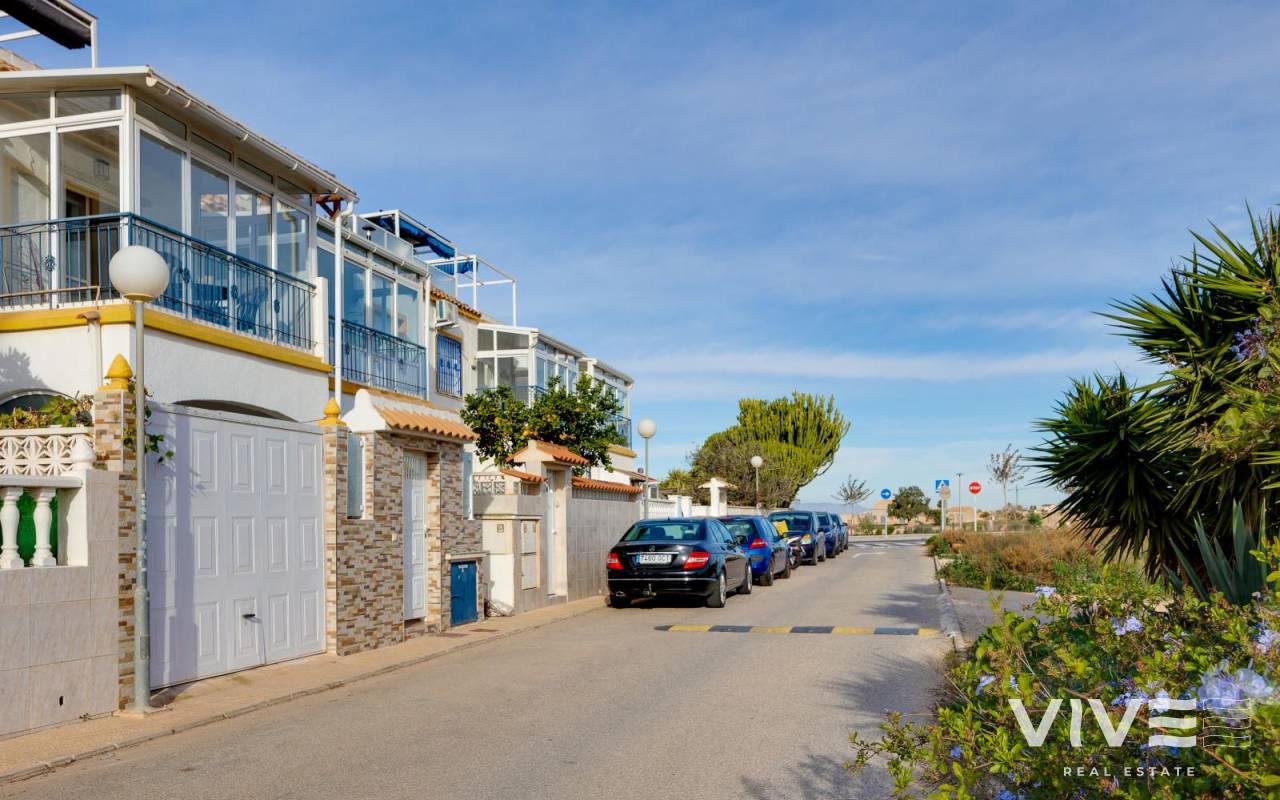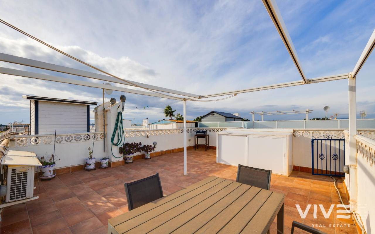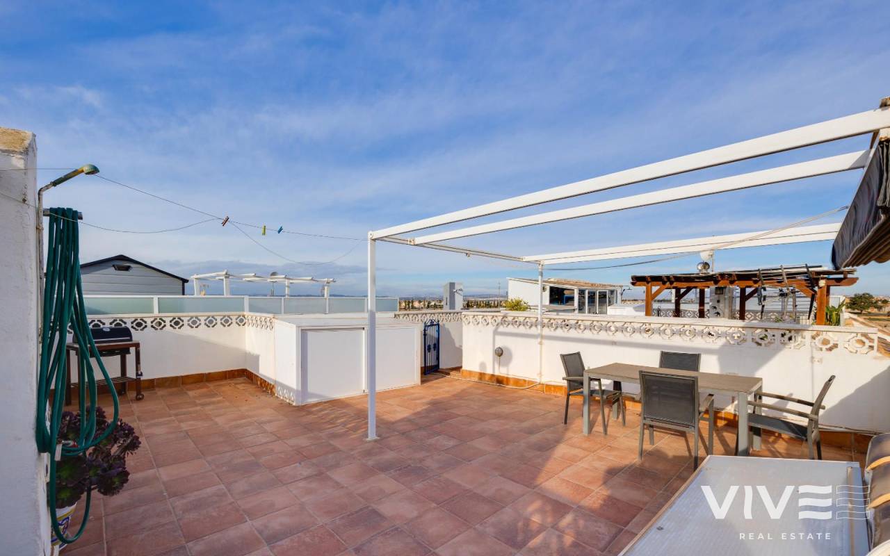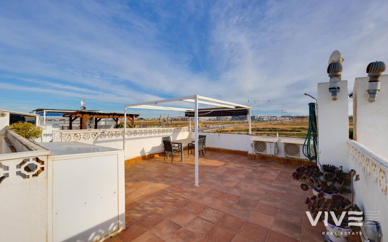 Charmante Dachgeschosswohnung in Jardín del Mar, in der Nähe von Carrefour und dem Einkaufszentrum Habaneras. Diese ruhige und gut erreichbare Wohngegend von Torrevieja zählt zu den begehrtesten in der Region. Die Wohnung verfügt über drei Schlafzimmer, ein helles Wohn-Esszimmer, eine voll ausgestattete Küche, ein Badezimmer und eine Terrasse, die sich ideal für den Alltag eignet. Das Highlight ist das großzügige private Solarium – ein vielseitiger Raum, in dem Sie das ganze Jahr über die Sonne genießen, eine gemütliche Chill-out-Ecke (mit Grill oder Whirlpool) einrichten und sich so perfekt zum Entspannen in privater Atmosphäre oder zum Empfangen von Freunden einrichten können. Die Wohnung befindet sich in einem gepflegten Wohngebiet, in der Nähe von Supermärkten, Parks und öffentlichen Verkehrsmitteln und nur wenige Minuten vom Stadtzentrum und den Stränden entfernt. Sie bietet Komfort, eine großartige Lage und einen wirklich außergewöhnlichen Außenbereich.