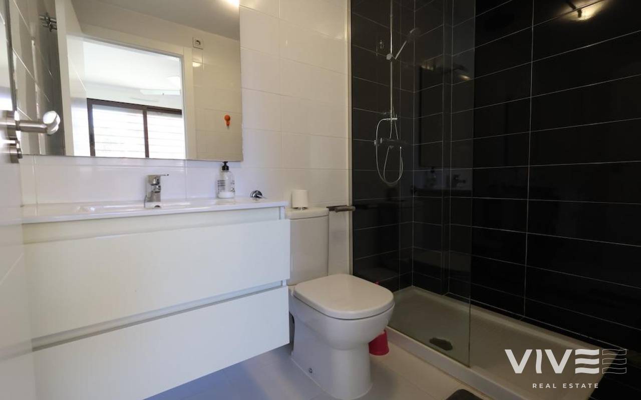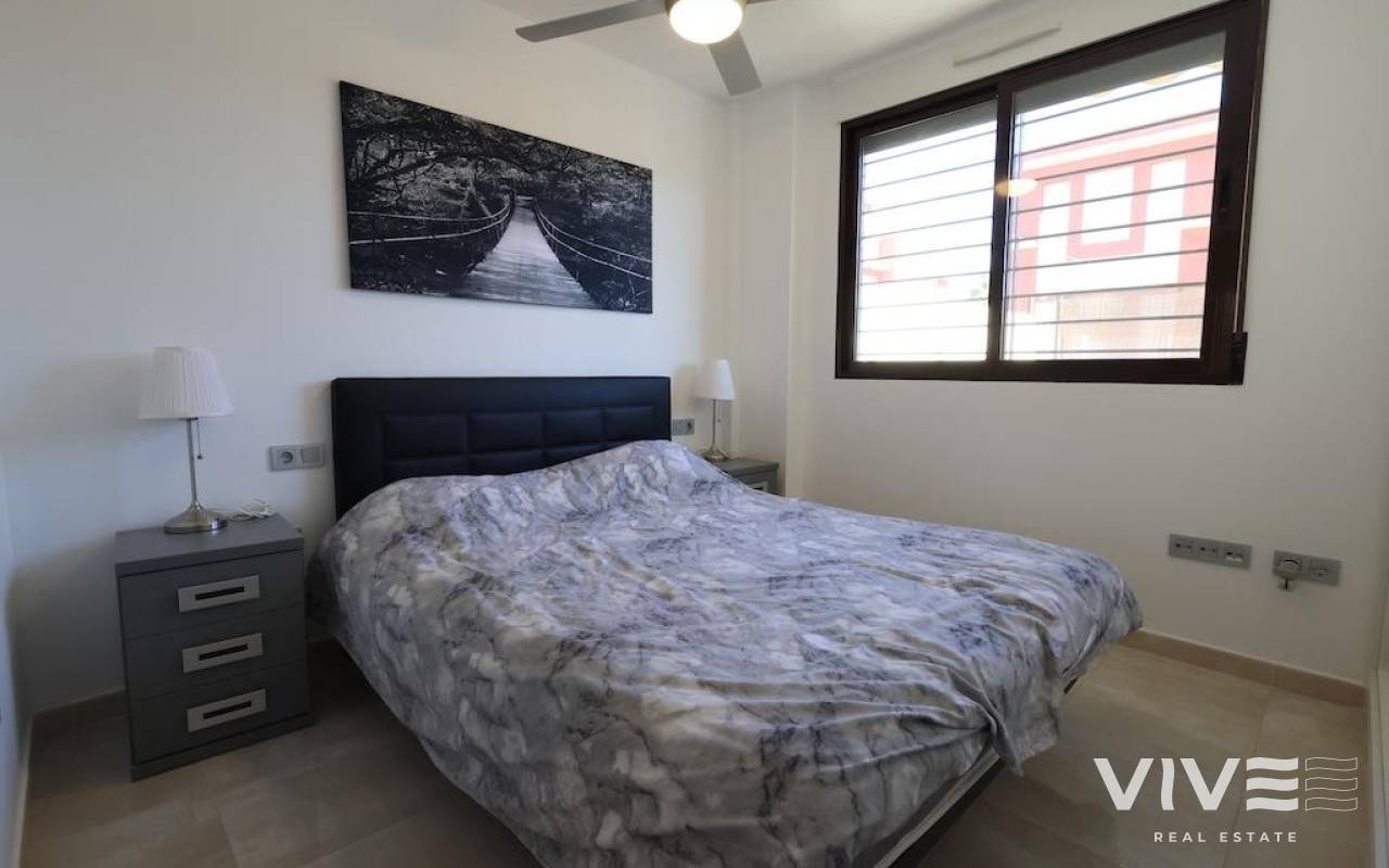 Lomas de Cabo Roig, Bungalow im Erdgeschoss mit großem Garten (30 m2), Wohnzimmer (64 m2) mit 2 Schlafzimmern, 2 Badezimmern, offener Küche zum Wohnzimmer, Terrasse neben dem Gemeinschaftspool, das Wohnzimmer wird möbliert verkauft und der Außenbereich ist klimatisiert.
