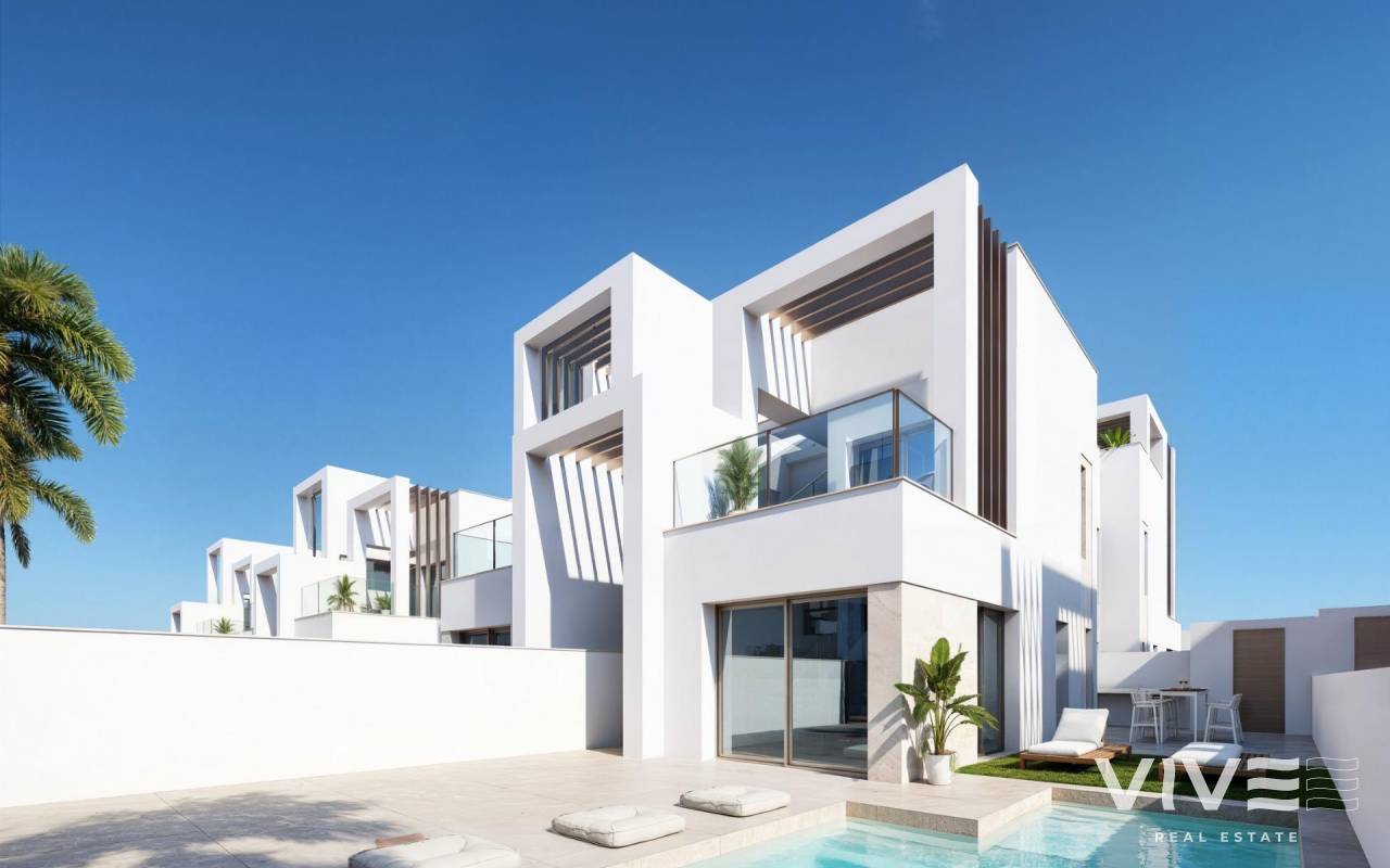 Neubau-Villen mit privatem Pool in Serena Golf-Los Alcazares Boutique-Kollektion moderner Häuser in Meeresnähe Entdecken Sie eine exklusive Boutique-Siedlung mit 37 modernen Vier- und Doppelhaushälften in La Serena Golf in Los Alcazares an der wunderschönen Costa Calida. Diese modernen Häuser sind für Käufer konzipiert, die Privatsphäre, Sonnenschein und einen Lebensstil im Freien suchen, nur 300 Meter vom warmen Wasser des Mar Menor entfernt. Los Alcazares ist eine charmante Küstenstadt, die für ihre lange Promenade, ihre Sandstrände und ihre entspannte mediterrane Atmosphäre bekannt ist. Die Gegend genießt mehr als 300 Sonnentage im Jahr und bietet ausgezeichnete Restaurants, Geschäfte, Yachthäfen und Sportanlagen. Ihre Lage zwischen dem Meer und dem Golfplatz macht sie zu einem der begehrtesten Ziele in der Region, sowohl für Dauerwohnsitze als auch für Ferienhäuser. Moderne Villen mit privatem Pool und Außenbereich Jede Immobilie verfügt über ein privates Grundstück mit eigenem Swimmingpool und bietet somit die perfekte Umgebung, um das mediterrane Klima das ganze Jahr über zu genießen. Die Häuser verfügen über 3 Schlafzimmer und 2 oder 3 Badezimmer sowie Gästetoiletten und bieten komfortable und funktionale Wohnräume, die ideal für Familien oder Gäste sind. Die Villen sind so konzipiert, dass sie das Leben im Freien in den Vordergrund stellen. Neben dem Pool gibt es einen Grillbereich und eine Gästetoilette im Außenbereich, ideal für die Unterhaltung von Freunden und Familie. Das Solarium auf dem Dach bietet zusätzlichen Platz zum Entspannen in der Sonne und verfügt über eine Solardusche mit Vorinstallation für einen Whirlpool und eine Sommerküche. Parkplätze sind sowohl auf dem privaten Grundstück als auch in einer zugewiesenen Tiefgarage vorhanden. Hochwertige Ausstattung und moderne Funktionen Die Häuser sind mit modernen Materialien und hochwertigen Spezifikationen gebaut, die auf Komfort und Stil ausgelegt sind. Voll ausgestattete Küche mit Geräten in weißer Glasoptik Badezimmer mit hinterleuchteten Spiegeln, Duschwänden und Waschtischen Motorisierte Fensterläden Grundausstattung für die Beleuchtung Voll installierte Klimaanlage Diese Ausstattungsmerkmale sorgen für ein komfortables Wohngefühl, unabhängig davon, ob die Immobilie als Hauptwohnsitz oder als Ferienhaus genutzt wird. Annehmlichkeiten im Resort-Stil und ausgezeichnete Lage Die Eigentümer haben außerdem Zugang zu gemeinsamen Einrichtungen im Resort-Stil, die mit einer benachbarten Wohnanlage geteilt werden. Zu diesen Annehmlichkeiten gehören Landschaftsgärten, ein gemeinschaftlicher Pool im Lagunenstil, ein Spa-Bereich, ein Fitnessstudio und eine Sauna. Die Lage bietet einfachen Zugang zu Stränden, Golfplätzen und nahe gelegenen Städten. Strand Mar Menor 0,3 km La Serena Golf neben der Wohnanlage Stadtzentrum von Los Alcazares 2 km Cartagena 22 km Murcia 40 km Internationaler Flughafen Murcia 30 km Flughafen Alicante Elche 90 km Das flache Wasser des Mar Menor ist das ganze Jahr über ideal zum Schwimmen, Segeln, Paddel-Surfen und für andere Wassersportarten. Sichern Sie sich Ihren mediterranen Lebensstil in Los Alcazares Diese neu gebauten Villen bieten die perfekte Kombination aus Strand, Golf und modernem Komfort an der Costa Calida. Kontaktieren Sie uns noch heute, um weitere Informationen zu erhalten oder einen Besichtigungstermin zu vereinbaren und sichern Sie sich Ihr neues Zuhause im Serena Golf in Los Alcazares.