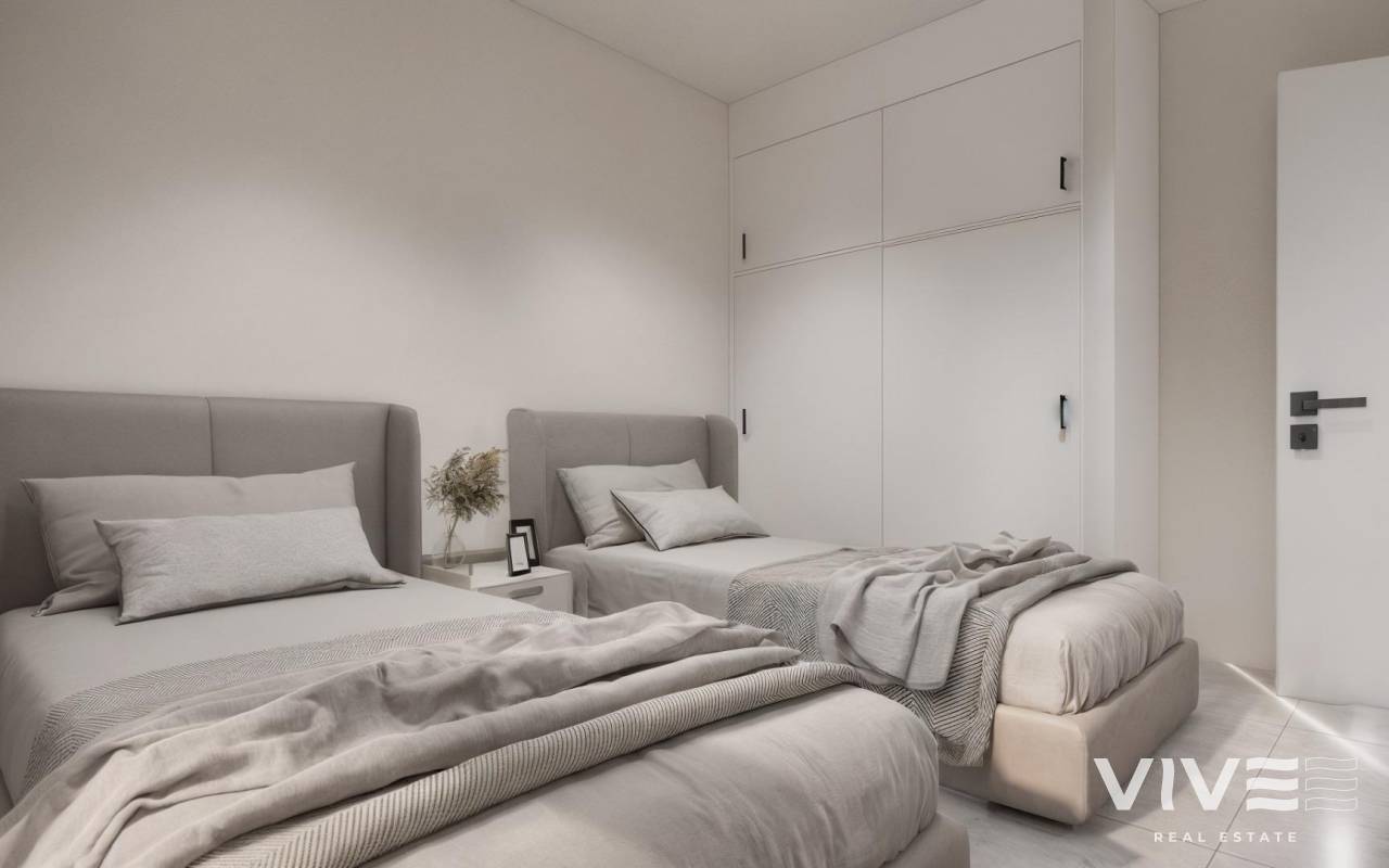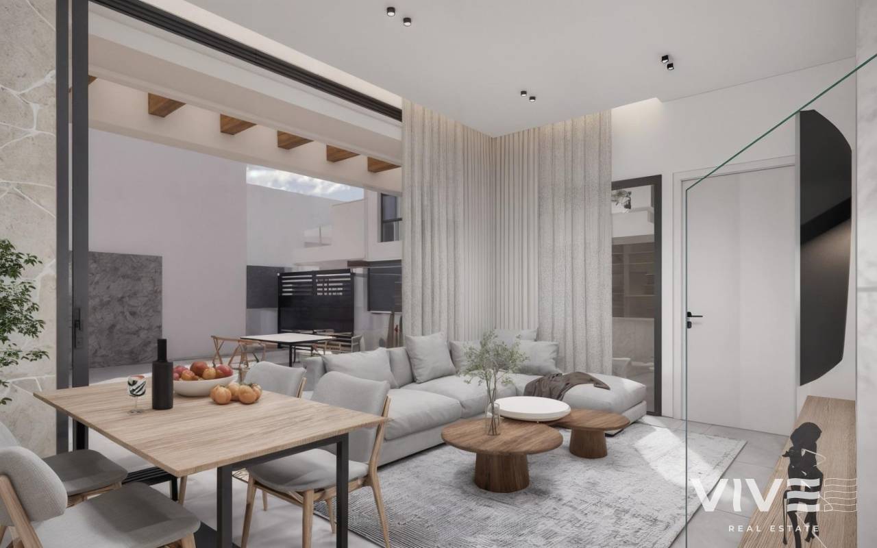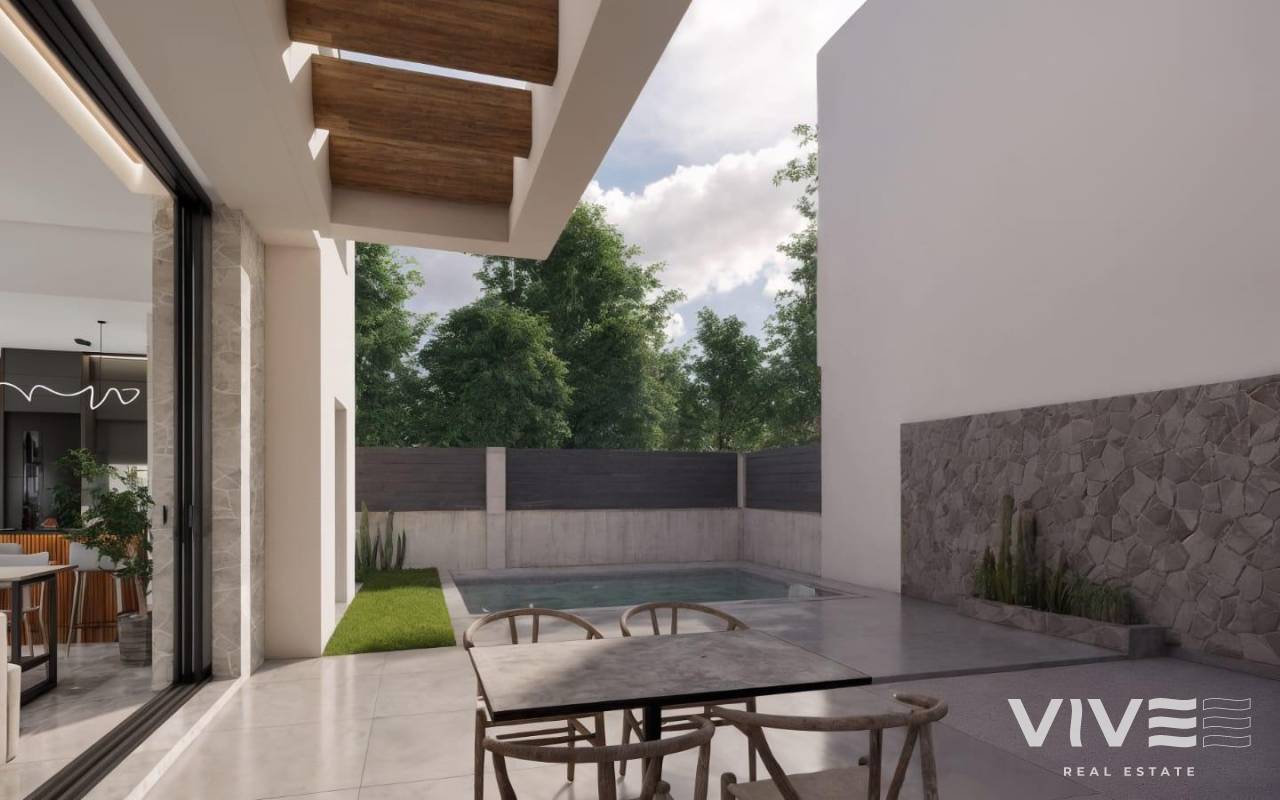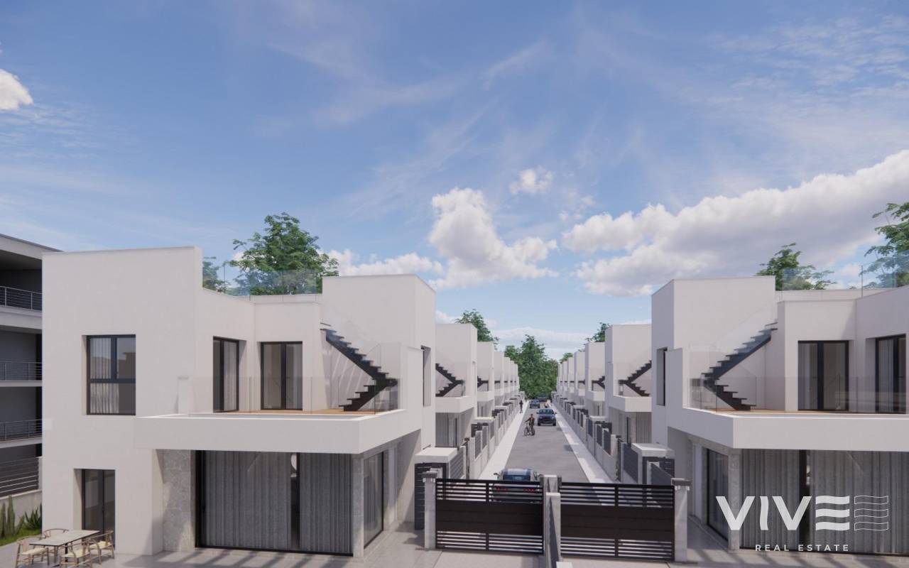 Moderne, neu gebaute Villen in La Herrada Los Montesinos mit privatem Swimmingpool Exklusives Wohnprojekt in ruhiger Lage Diese exklusive Wohnanlage mit 16 modernen Villen befindet sich in der prestigeträchtigen Wohngegend La Herrada in Los Montesinos und bietet Privatsphäre, Komfort und eine ausgezeichnete Lebensqualität. La Herrada ist bekannt für seine ruhige Wohnatmosphäre, die Nähe zu allen Annehmlichkeiten des täglichen Lebens und seine privilegierte Lage zwischen den berühmten Salinen von Torrevieja und La Mata. Es ist ein idealer Ort für diejenigen, die einen entspannten und gesunden mediterranen Lebensstil im Süden der Costa Blanca suchen. Zeitgenössisches Design mit optimierten Innenräumen Jede Villa verfügt über 130 m² gut aufgeteilte Wohnfläche auf zwei Etagen, die so gestaltet sind, dass sie natürliches Licht und Funktionalität maximieren. Die auf Grundstücken ab 250 m² erbauten Immobilien bieten großzügige Außenbereiche, die sich perfekt zum Sonnenbaden, Unterhalten oder Entspannen am privaten Pool eignen. Komfortable Aufteilung auf zwei Etagen Das Erdgeschoss verfügt über einen offenen Wohnbereich mit einer voll integrierten Küche und direktem Zugang zum Garten und Poolbereich. Auf dieser Etage befinden sich außerdem zwei Schlafzimmer, ein komplettes Badezimmer und ein praktischer Waschraum. Im Obergeschoss befinden sich zwei geräumige Schlafzimmer, jedes mit eigenem Badezimmer, eines davon en-suite. Beide Schlafzimmer haben Zugang zu einer 28 m² großen offenen Privatterrasse. Für diejenigen, die noch mehr Platz im Freien wünschen, gibt es gegen Aufpreis ein optionales Solarium auf dem Dach. Hochwertige Ausstattung und moderne Funktionen Die Villen verfügen über eine hochwertige Ausstattung wie Badezimmermöbel, Spiegel, Duschwände und Fußbodenheizung in allen Badezimmern. Es gibt eine Vorinstallation für eine Klimaanlage, ein motorisiertes Eingangstor für Fahrzeuge, einen privaten Parkplatz auf dem Grundstück und einen geschlossenen Zugang zur Wohnanlage über eine private interne Straße. Erstklassige Lage in der Nähe wichtiger Annehmlichkeiten und Sehenswürdigkeiten Die Strände von Guardamar und Torrevieja sind 9 km entfernt La Marquesa Golf, La Finca Golf und Vistabella Golf sind weniger als 5 km entfernt Der Flughafen Alicante ist 29 km entfernt Naturparks, Salinen, Radwege und Wanderwege in der Umgebung Komfortables Wohnen im Herzen der Costa Blanca Diese neu gebauten Villen in Los Montesinos bieten die perfekte Kombination aus modernem Komfort, natürlicher Umgebung und ausgezeichneter Erreichbarkeit. Ob Sie einen dauerhaften Wohnsitz oder ein Ferienhaus suchen, diese Wohnanlage bietet Ihnen alles, was Sie brauchen, um einen ruhigen und komfortablen mediterranen Lebensstil zu genießen. Kontaktieren Sie uns noch heute, um einen Besichtigungstermin zu vereinbaren und sich Ihr neues Zuhause in La Herrada zu sichern.