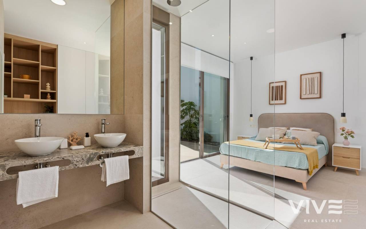 Neue Villen und Wohnungen in Los Alcázares Entdecken Sie eine neue Wohnanlage in Los Alcázares, Murcia, mit 16 modernen Apartments und Penthäusern mit 2 oder 3 Schlafzimmern sowie 8 exklusiven Villen. Diese Wohnanlage vereint zeitgenössisches Design, hohe Qualität und Funktionalität in perfekter Weise. Die unschlagbare Lage bietet einen atemberaubenden Blick auf den La Serena Golf und das Mar Menor. Luxuriöse Villen mit modernen Annehmlichkeiten Die Villen verfügen über 3 geräumige Schlafzimmer, 2 Bäder, eine in das Wohnzimmer integrierte offene Küche, Einbauschränke, eine große Terrasse, einen privaten Pool und einen Parkplatz. Einige Einheiten verfügen auch über einen Keller, und ein Solarium ist als Option erhältlich. Erstklassige Lage am Golfplatz von La Serena Die Wohnanlage befindet sich im Herzen des prestigeträchtigen Golfplatzes La Serena, der für seine einzigartige Kombination aus Seen und üppigem Grün bekannt ist, und bietet einen ruhigen Lebensstil. Der Golfplatz ist strategisch so angelegt, dass 16 der 18 Löcher mit Wasserflächen ausgestattet sind, was den Golfern ein anspruchsvolles, aber angenehmes Erlebnis bietet. Einzigartig ist, dass der Golfplatz nur wenige Gehminuten vom Stadtzentrum von Los Alcázares entfernt liegt und somit die perfekte Mischung aus Ruhe und Erreichbarkeit der örtlichen Dienstleistungen bietet. Interessante Punkte in der Nähe La Serena Golf: 0 km Strand Mar Menor: 1 km Flughafen Murcia: 25 km Cartagena: 21 km Lokales Einkaufszentrum: 4 km Flughafen Alicante: 55 km