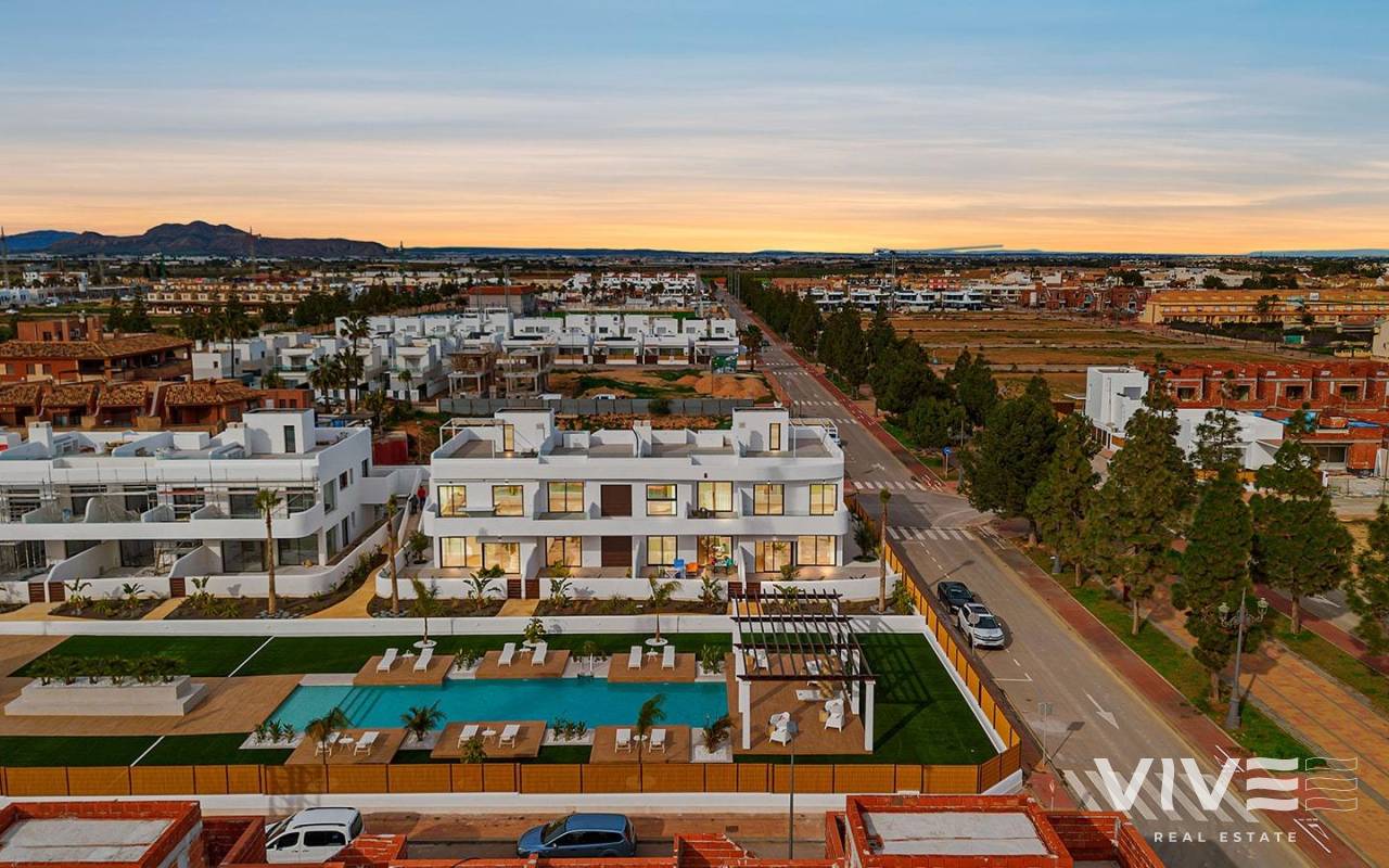 Neubau-Wohnkomplex in der Nähe von Serena Golf und Mar Menor in Los Alcazares Modernes Wohnen an der Costa Calida Entdecken Sie diesen attraktiven Neubau-Wohnkomplex in Los Alcazares, einer der beliebtesten Küstenstädte an der Costa Calida. Nur 500 m von den Stränden des Mar Menor und nur wenige Gehminuten vom Stadtzentrum entfernt, bietet diese Wohnanlage eine hervorragende Kombination aus Leben an der Küste, Golfumgebung und alltäglicher Bequemlichkeit. Los Alcázares ist bekannt für seine entspannte Atmosphäre, seine langen Promenaden, sein warmes, flaches Wasser und eine große Auswahl an Restaurants, Geschäften und Dienstleistungen, die das ganze Jahr über geöffnet sind. Moderne Apartments, die auf Komfort ausgelegt sind Die Wohnanlage besteht aus 29 modernen Wohnungen mit 2 oder 3 Schlafzimmern, die mit klaren architektonischen Linien und hochwertigen Oberflächen gestaltet sind. Käufer können zwischen Wohnungen im Erdgeschoss mit privatem Garten und Terrasse, Wohnungen in den mittleren Etagen mit großzügigen Terrassen oder Penthäusern mit privater Terrasse und Dachsolarium mit freiem Blick wählen. Viele der Immobilien bieten einen Blick auf den Serena Golfplatz und das Mar Menor und schaffen so ein ruhiges und angenehmes Wohnumfeld. Alle Wohnungen sind so konzipiert, dass sie ein Maximum an Tageslicht und Funktionalität bieten, wodurch sie sich ideal als Dauerwohnsitz, Ferienhaus oder Investitionsobjekt eignen. Hochwertige Ausstattung und Gemeinschaftsbereiche Jede Immobilie verfügt über einen privaten Parkplatz und einen Abstellraum. Die Ausstattung ist auf Komfort und Energieeffizienz ausgelegt und umfasst doppelt verglaste Fenster mit thermischer Trennung, die Vorinstallation einer Klimaanlage, ein aerothermisches System für Warmwasser, elektrische Rollläden in den Schlafzimmern und eine komplette Innen- und Außenbeleuchtung. Die Badezimmer sind komplett mit Möbeln, Spiegeln und Duschwänden ausgestattet. Die Bewohner können attraktive Gemeinschaftsbereiche mit Landschaftsgärten und einem Gemeinschaftspool genießen, die sich perfekt zum Entspannen und Genießen des mediterranen Klimas eignen. Ausgewählte Blöcke sind für zusätzlichen Komfort mit Aufzügen ausgestattet. Erstklassige Lage zwischen Golfplatz und Meer Diese Wohnanlage genießt eine privilegierte Lage neben Serena Golf, einem der renommiertesten Golfplätze der Region, und nur einen kurzen Spaziergang vom ruhigen Wasser des Mar Menor entfernt. Die Gegend ist ideal zum Schwimmen, Segeln, Paddeln und für andere Wassersportarten das ganze Jahr über. Zu den wichtigsten Entfernungen gehören die Strände von Mar Menor in 0,5 km Entfernung, Serena Golf direkt neben der Anlage, das Stadtzentrum von Los Alcazares in 2 km Entfernung, Cartagena in 22 km Entfernung und die Stadt Murcia in 40 km Entfernung. Der Flughafen Murcia Corvera ist etwa 30 km entfernt und der Flughafen Alicante etwa 90 km. Ein ideales Zuhause oder eine ideale Investitionsmöglichkeit Mit seiner ausgezeichneten Lage, seinem modernen Design und der Nähe zum Golfplatz und zum Meer bietet dieser neue Wohnkomplex in Los Alcazares eine hervorragende Gelegenheit für einen außergewöhnlichen Lebensstil an der Costa Calida. Kontaktieren Sie uns noch heute, um weitere Informationen zu erhalten oder einen privaten Besichtigungstermin zu vereinbaren und sich Ihr neues Zuhause am Mar Menor zu sichern.
