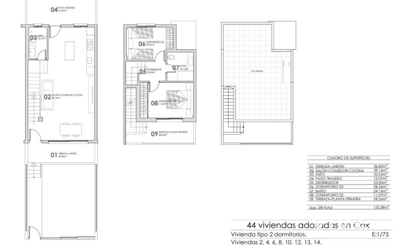 Neubau-Stadthäuser zum Verkauf in Cox - 44 moderne Häuser mit großartigen Annehmlichkeiten Entdecken Sie eine neue Wohnanlage mit 44 modernen Stadthäusern in Cox, Alicante. Diese Häuser sind in 2- und 3-Schlafzimmer-Grundrissen erhältlich und verfügen jeweils über ein privates Solarium, Terrassen, Innenhöfe und einen privaten Parkplatz. Die Wohnanlage bietet Zugang zu Gemeinschaftsbereichen, darunter ein Gemeinschaftsschwimmbad, das eine ideale Umgebung zum Entspannen schafft. Erstklassige Lage mit hervorragender Verkehrsanbindung Diese Wohnanlage liegt nur 40 km vom internationalen Flughafen Alicante entfernt, was die Anreise einfach und bequem macht. Cox ist gut an die großen Städte angebunden: Orihuela ist nur 8 km entfernt, Elche 20 km, Alicante 48 km und Murcia 25 km. Golfliebhaber werden die nahe gelegenen Golfplätze wie La Finca (12 km) und Vistabella (14 km) zu schätzen wissen. Einfacher Zugang zu wichtigen Straßen Cox verfügt über eine gute Anbindung an die Autobahn AP-7 und die Autovía del Mediterráneo (A-7) sowie an lokale Routen in die umliegenden Gebiete wie Granja de Rocamora und Callosa de Segura. Die Stadt und die umliegenden Gebiete haben über 35.000 Einwohner und bieten einen ruhigen und doch lebendigen Lebensstil. Lokale Annehmlichkeiten und Attraktionen Den Bewohnern steht ein breites Spektrum an lokalen Annehmlichkeiten zur Verfügung, darunter Geschäfte, Schulen, Sporteinrichtungen, medizinische Zentren und ein schneller Zugang zu den Stränden der Costa Blanca, wie Guardamar del Segura und Torrevieja. Enthaltene Merkmale Jedes Haus verfügt über einen angelegten Garten, LED-Beleuchtung, elektrische Rollläden, eine Vorinstallation für Solarzellen, Einbauschränke, eine Sicherheitstür, eine voll ausgestattete Küche mit Silestone-Arbeitsplatten und vieles mehr.