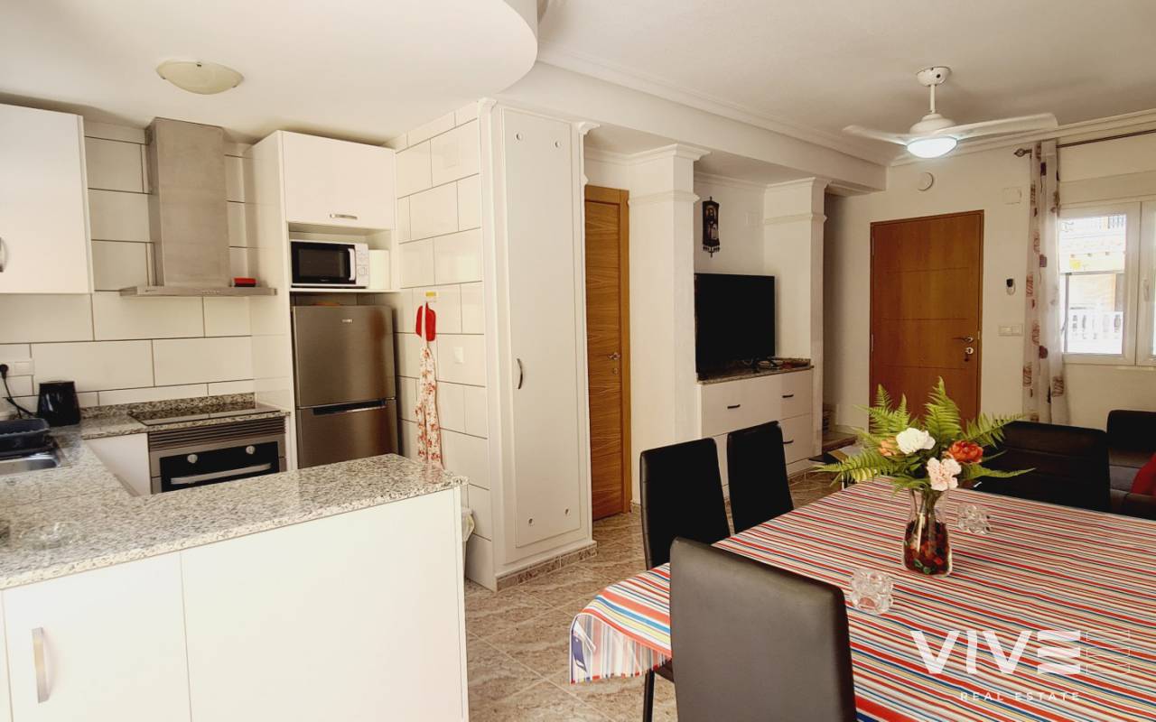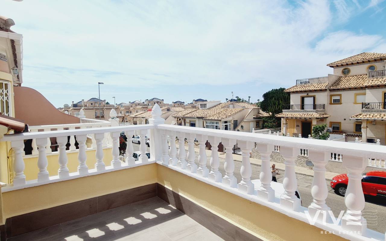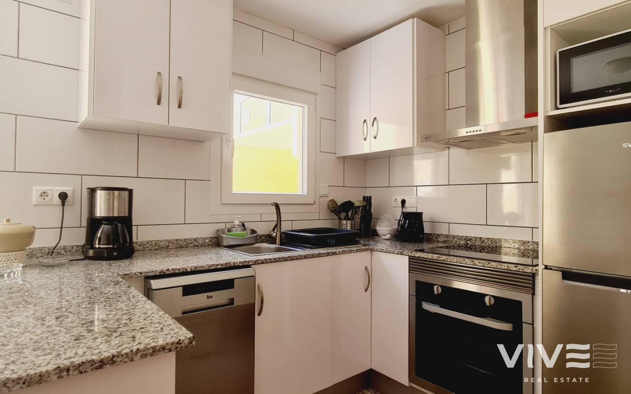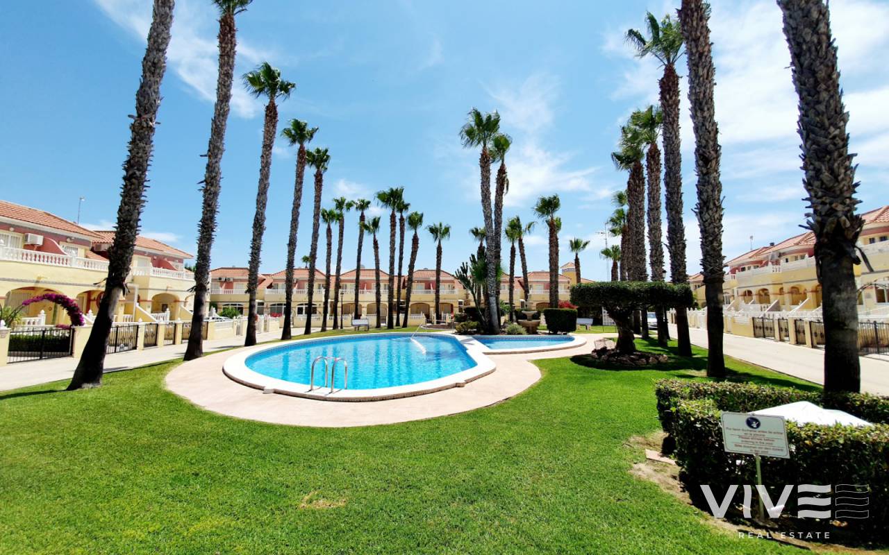 Granito ist ein Bungalow mit grosser Vorterrasse und Porche, es hat 2 Schlafzimmer, ein Bad und ein GästeWC. Der grosse Wohnraum hat eine Essecke und die volleingerichtete Küche nebenan. Eine hintere Terrasse ist als Nutzraum eingerichtet. Das Wohnzimmer hat einen Flachbildschirmfernseher und freies Wlan, ebenfalls ein GästeWC findet sich hier. Das ganze Haus hat Klimaanlage. Im oberen Stockwerk sind die beiden Schlafzimmer, ein Doppeltes mit schönem Balkon vorweg und ein Einzelschlafzimmer, dazu ein Badezimmer. BBQ ist vorhanden genau wie Gartenmöbel. Der Ausblick ist auf den Garten/ Terrasse. Die Anlage hat einen Gemeinschaftspool und eine schöne Gartenanlage. Das Einkaufszentrum La Zenia Boulevard ist 1 km entfernt und der nächstgelegene Flughafen ist San Javier in 20 km Entfernung.
