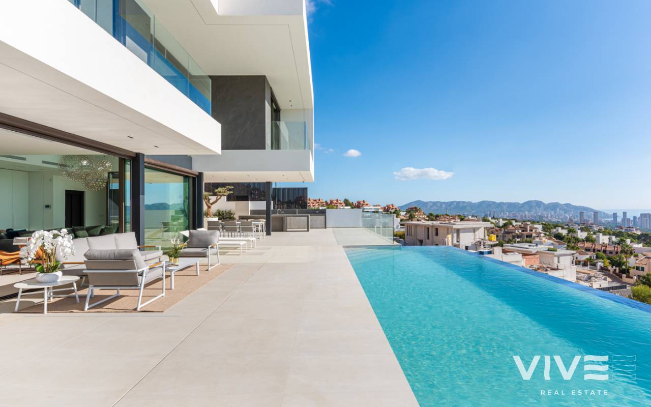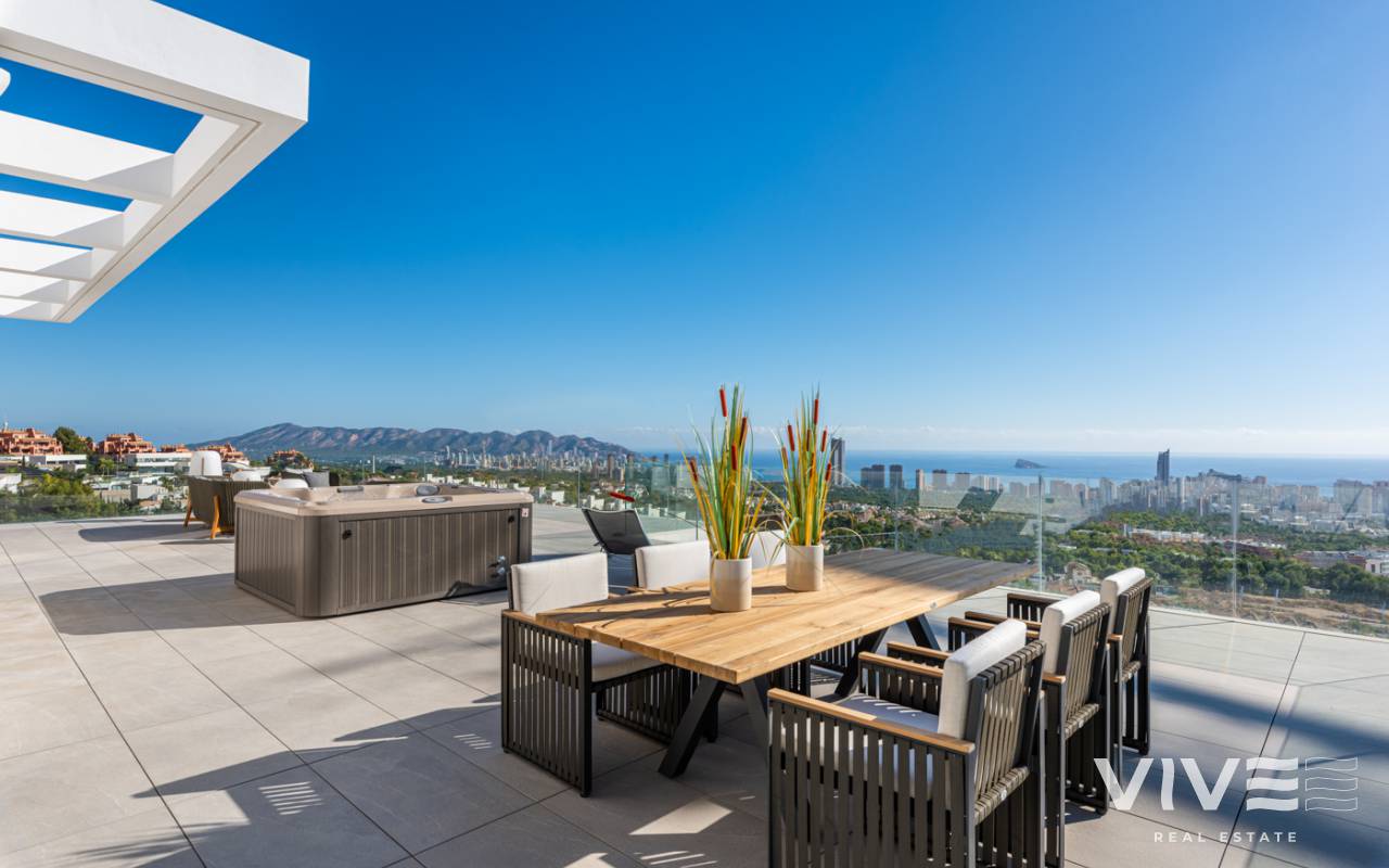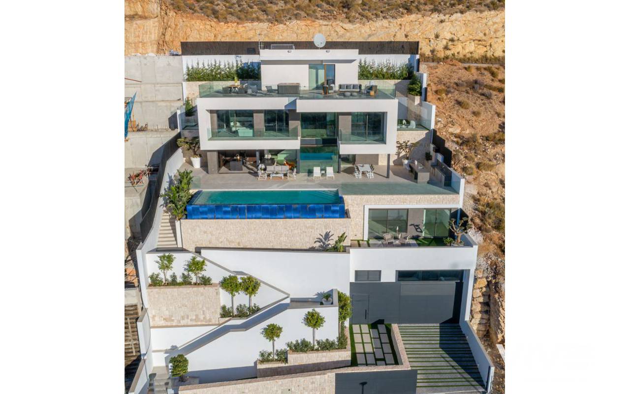 Neubau von 5 exklusiven und unabhängigen Luxusvillen in der besten Gegend von Sierra Cortina. Aufgrund seiner Lage auf dem Gipfel des Berges haben Sie von hier aus den besten Blick auf die gesamte Bucht von Benidorm. Das voll verglaste Erdgeschoss verfügt über ein großes Wohn-Esszimmer, eine Küche, eine Waschküche, eine Gästetoilette und durch seine riesigen Fenster eine perfekte Integration mit dem Außenbereich, wo eine große Terrasse, eine Veranda, ein Garten, ein Grill und ein wunderschöner Infinity-Pool Ihnen erlauben, sich zu entspannen und eine Traumlandschaft zu betrachten. Im ersten Stock gibt es 3 Schlafzimmer, alle mit eigenem Bad und Einbauschränken. Alle drei Schlafzimmer haben Zugang zu Terrassen mit schönem Meerblick. Im Obergeschoss befindet sich eine wunderbare 160 m2 große Terrasse mit der Möglichkeit, einen herrlichen Whirlpool einzurichten, ein Entspannungsbereich, in dem Sie unvergessliche Momente genießen können. Außerdem gibt es 2 Stockwerke unter dem Erdgeschoss. Eine davon kann als Gästehaus genutzt werden. Diese Etage verfügt auch über eine Terrasse mit spektakulärer Aussicht. Und schließlich gibt es eine Etage auf Straßenniveau, von der aus Sie das Haus betreten können, mit genügend Platz für bis zu 4 Fahrzeuge. Für maximalen Komfort sind alle Etagen durch einen Aufzug verbunden. Diese Villen sind exklusiv wegen ihrer Aussicht, Lage, Süd-Ost-Ausrichtung, mit den besten Qualitäten auf dem Markt, und ausgestattet mit Designermöbeln in der Küche und Bädern, Elektrogeräten und LED-Beleuchtung außen. Gelegen in der Gemeinde Finestrat, 10 Minuten von Benidorm entfernt, im Herzen der Costa Blanca und umgeben von wichtigen Städten wie Alicante, Benidorm, Elche, Altea und Calpe. Der internationale Flughafen Elche-Alicante ist über die Autobahn leicht zu erreichen, so dass Sie in 30 Minuten alle wichtigen europäischen Hauptstädte erreichen können. Finestrat ist eine malerische Küsten- und gleichzeitig Berggemeinde, die die Stille der felsigen und grünen Natur der hohen Gipfel des Puig Campana mit der kosmopolitischen Anziehungskraft ihrer Cala verbindet, deren Strand mit goldenem Sand und kristallklarem Wasser ein Schatz ist, der von Wohngebieten umgeben ist.