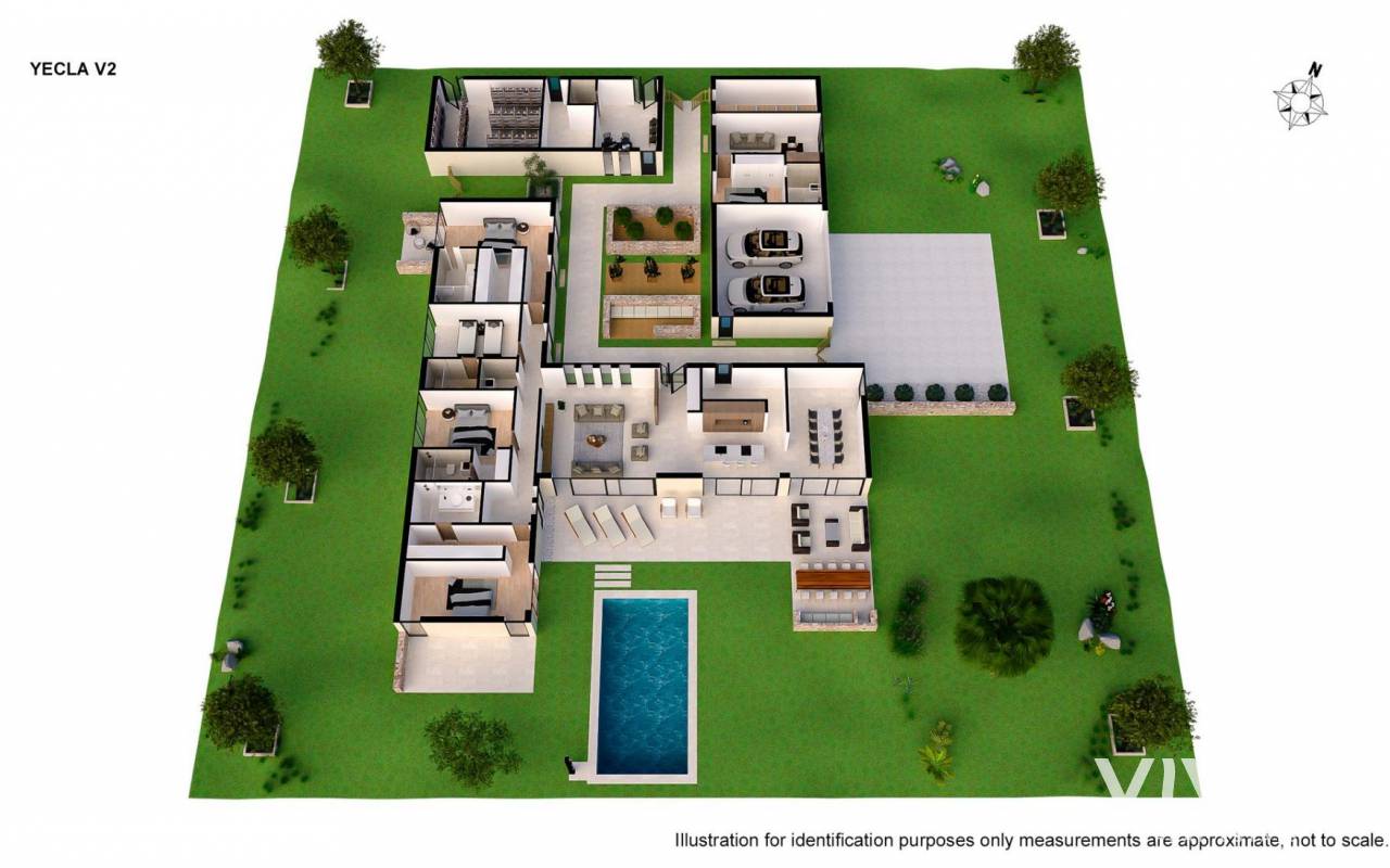 VILLA DE OBRA NUEVA EN YECLA, MURCIA Exclusiva villa de lujo de nueva construcción situada dentro de un hermoso viñedo en Yecla, Murcia. El proyecto ofrece modernas villas de estilo cortijo construidas en parcelas de 20.000 m2, con olivos y un viñedo con una producción de hasta 10.000 kg de uva, lo que permite producir su propio vino. Se ofrecen diferentes modelos de distribución, aunque también es posible realizar un diseño totalmente personalizado. Los modelos estándar presentan una amplia casa en una sola planta con 6 dormitorios, 5 baños, espacios abiertos llenos de vida, donde el "interior" y el "exterior" se funden perfectamente y predomina la luz natural. La zona de día tiene un diseño abierto, combinando cocina, comedor y salón en un gran espacio con grandes ventanales que dan acceso a la zona exterior con amplias terrazas, al jardín y a la piscina privada. El patio interior en el centro de la casa representa la perfecta integración de la arquitectura con el entorno natural. Toda la casa incluye materiales de alta calidad al estilo de un cortijo tradicional español con un toque moderno; destacando un alto aislamiento térmico y acústico y eficiencia energética A, materiales nobles y naturales, como la madera y la piedra natural, en combinación con estuco, hormigón y vidrio para una perfecta integración en el entorno natural. Además, incluye 2 plazas de aparcamiento, una piscina y un jardín personalizable según m2 y tipo de cosecha. Una casa que se adapta a todo el mundo y que es altamente sostenible en cuanto al uso del agua, el consumo de energía (paneles solares) y el aislamiento térmico, entre otras cosas. Una ubicación única con mucha privacidad que permite estar en contacto directo con la naturaleza y disfrutar de un estilo de vida saludable y ecosostenible, pero a sólo 15 minutos en coche del centro de Yecla. Una de las ciudades más importantes de la provincia de Murcia, que cuenta con todos los servicios necesarios para el día a día, así como una amplia oferta cultural y gastronómica. Es el entorno ideal para excursionistas, ciclistas de montaña y otros aficionados a las actividades al aire libre. La zona está muy bien comunicada por carretera, pudiendo llegar a Murcia y Alicante en poco más de 1 hora. Yecla, uno de los destinos más excepcionales de la Región, está situada en el extremo norte, o mejor dicho, en el extremo noreste. Esta es una tierra de montañas, buen vino, historia, cultura y leyendas. No es de extrañar que escritores españoles como Azorín o Pío Baroja quedaran fascinados tras conocerla.