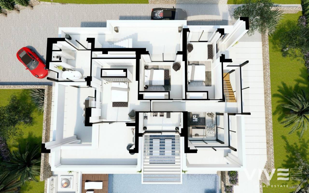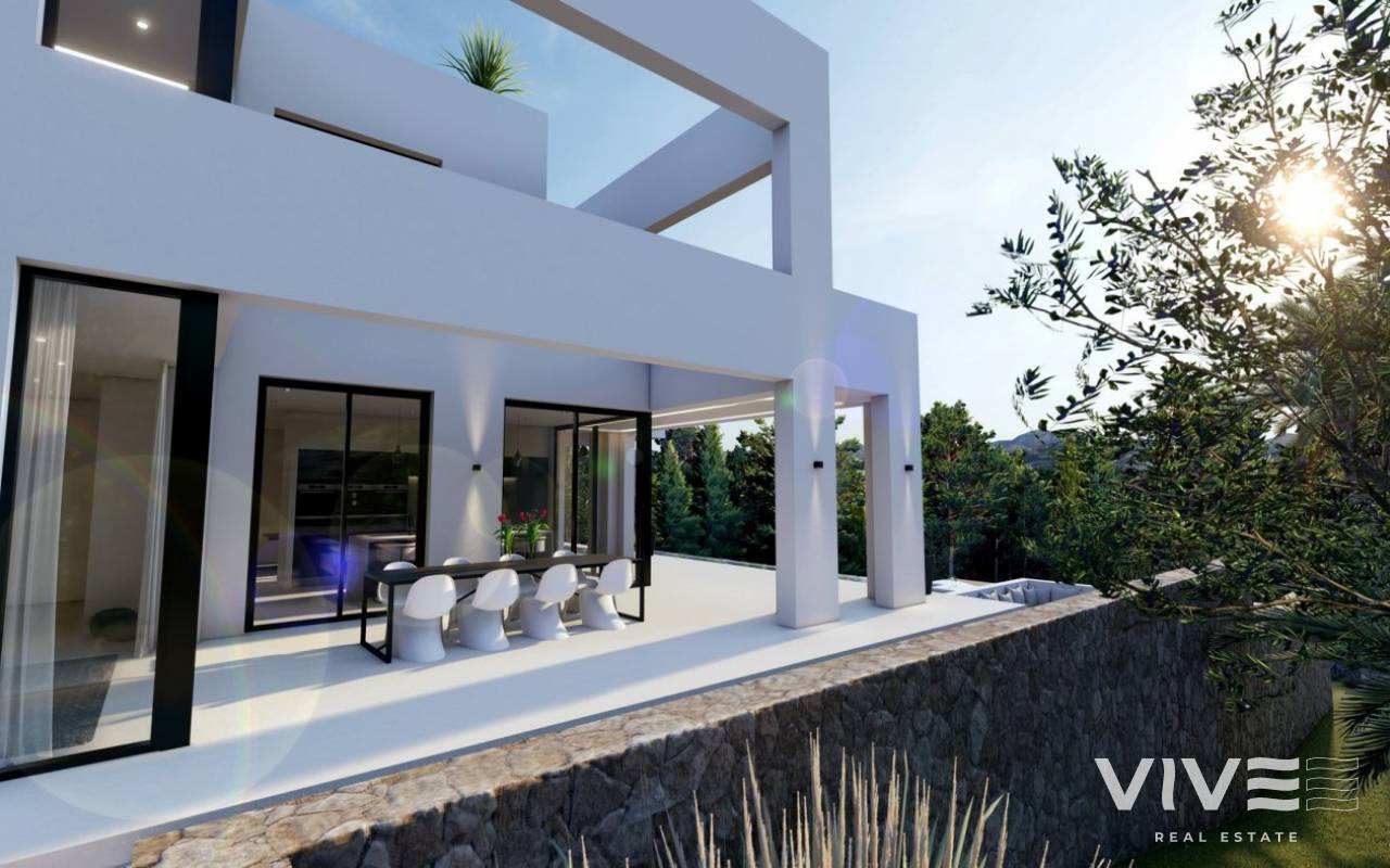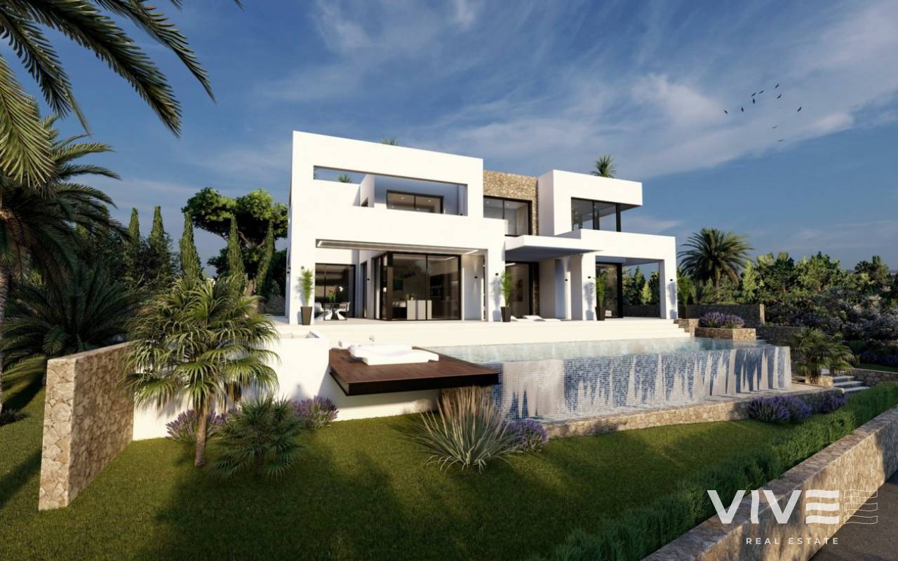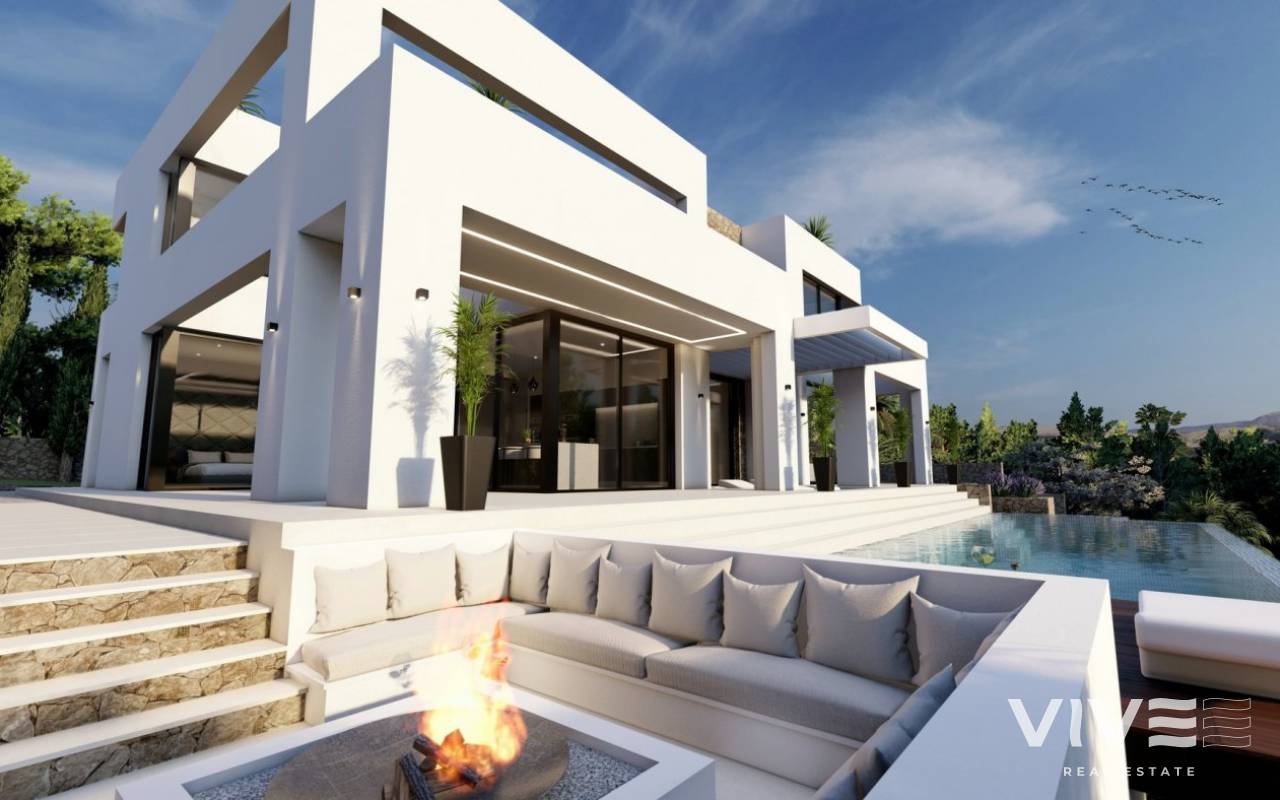 VILLA DE NUEVA CONSTRUCCIÓN EN BENNISA Villa de lujo de nueva construcción en venta en Benissa, Costa Blanca. Villa de lujo en Benissa, arquitectura moderna con piscina infinita 13x4,5m. Esta villa está construida en una gran parcela plana con vistas al mar. Tiene 4 dormitorios y 4 baños, solarium de 197m2, sótano de 205m2. También dispone de parking exterior para 2 vehículos, con pavimento de hormigón impreso, cubierto con un toldo de vela de diseño. Desde el parking se accede a la planta baja a través de una puerta de entrada a la vivienda con cristal lateral fijo de seguridad. De ahí pasamos al gran salón con doble altura en el que se encuentra la escalera de diseño de viga de acero, con peldaños de madera flotantes y barandilla de cristal que da acceso a la primera planta. En la planta baja hay un aseo de invitados, un gran lavadero con acceso a la terraza exterior, un dormitorio con armarios empotrados y baño en suite y una gran cocina cerrada. Toda la planta baja tiene ventanas de suelo a techo que dan mucha luz y acceso a grandes terrazas y a la piscina. En la primera planta hay 3 dormitorios y 2 baños, todos con acceso a terrazas, una de ellas con escalera exterior que lleva al solarium de 197m2. Todos los dormitorios tienen armarios empotrados. Desde todas las habitaciones de la primera planta se accede a una gran terraza y jardín con espectaculares vistas y piscina infinita, así como a una zona chill out con chimenea exterior en el jardín. El sótano tiene una gran zona diáfana donde se puede construir una sala de cine, gimnasio, etc. En el equipamiento de esta villa destacamos las últimas tecnologías instaladas en toda la casa. Como el sistema de domótica controlado por voz y desde la APP del móvil para el sistema de alarma. Instalación completa de conductos de aire acondicionado. Todos los mecanismos necesarios para la instalación de la climatización por zonas, generada por la tecnología del aire, en la planta baja y en la planta piso. Posibilidad de conectar Airzone con el sistema inteligente de la vivienda y con Alexa. Instalación de suelo radiante eléctrico en planta baja y primera. Sistema de ventilación mecánica en baños y cocina, renovación de aire y extracción de humos. Generación de agua caliente sanitaria mediante sistema de Aerotermia, en unidades compactas. Pavimento de gres porcelánico en todo el interior de la vivienda. En las zonas húmedas, como los suelos de las duchas, los mismos serán del tipo antideslizante. Asimismo, se colocarán baldosas antideslizantes en exteriores y solarium. En la cocina, isla y encimera acabadas en Silestone en tono gris, con panel de cristal en la zona frontal de la encimera en tonos a juego. Cocina totalmente equipada de primera marca Küchenhouse, Parcélanos o similar. Baños totalmente equipados con grifería de alta calidad. Video portero. Instalación de iluminación interior con halógenos LED integrados, iluminación indirecta con barras LED empotradas en techos y marcos, en pasillos y otras estancias. Conexiones preparadas para la instalación de lámparas colgantes en salón y cocina. Iluminación exterior perimetral consistente en apliques LED de diseño en fachada exterior y aparcamiento, e iluminación de suelo en zonas de terraza y piscina. Paisajismo compuesto por zonas de césped natural y plantas autóctonas de la zona (olivos, palmeras, naranjos, limoneros...). Vallado de la parcela con muro de bloque revestido de mampostería de piedra seca. La villa se encuentra en una de las zonas residenciales más bonitas de la Costa Blanca. Las localidades de Calpe, Benissa y Moraira ofrecen un litoral extraordinariamente atractivo y de gran interés paisajístico y ecológico, con una costa accidentada con numerosas playas y calas escondidas. Benissa se encuentra entre Valencia y la ciudad de Alicante. El aeropuerto de Manises en Valencia está a una hora y el de L'Altet en Alicante a 50 minutos en coche. Ambos aeropuertos son importantes aeropuertos internacionales a los que llegan un gran número de compañías aéreas de bajo coste.