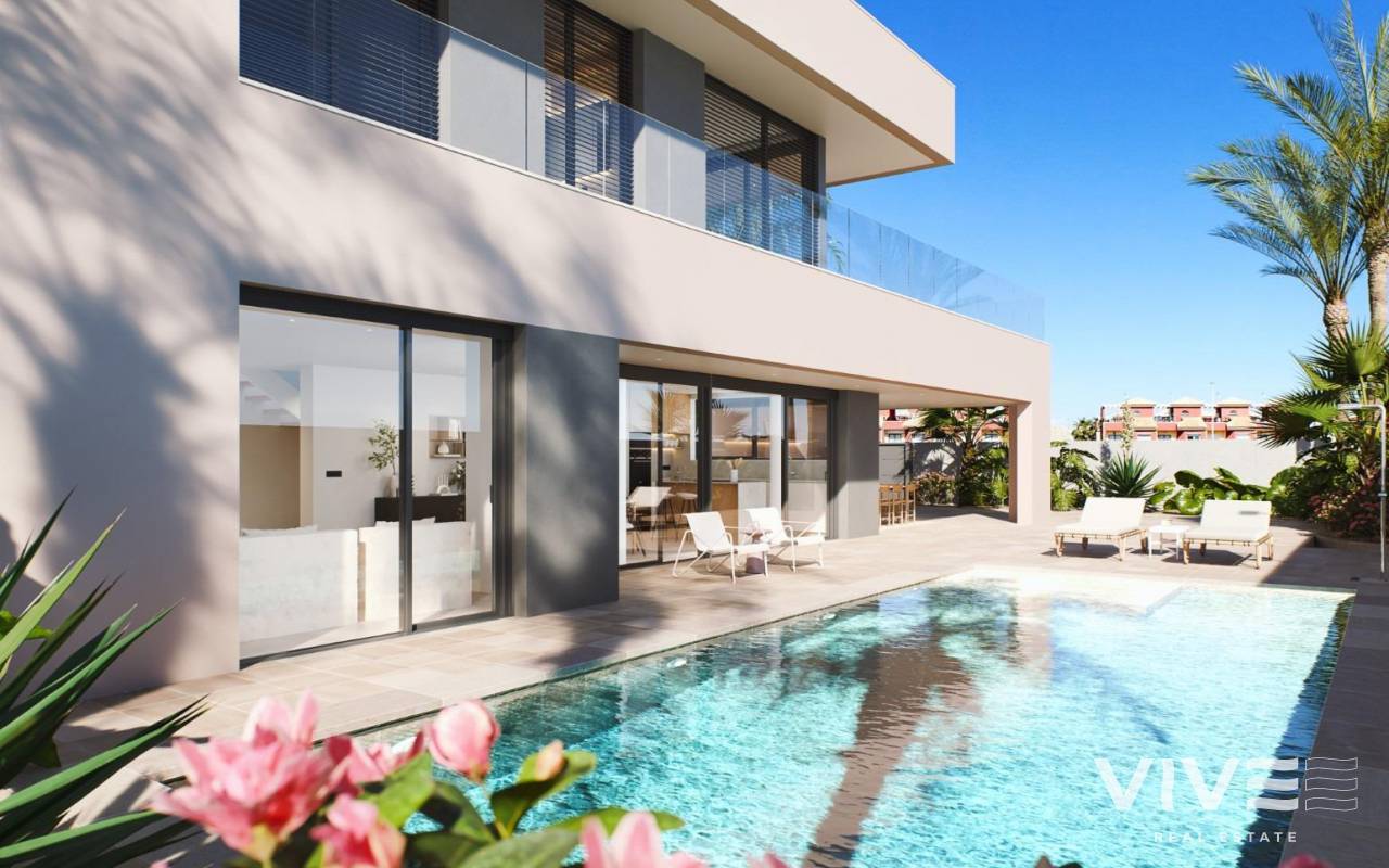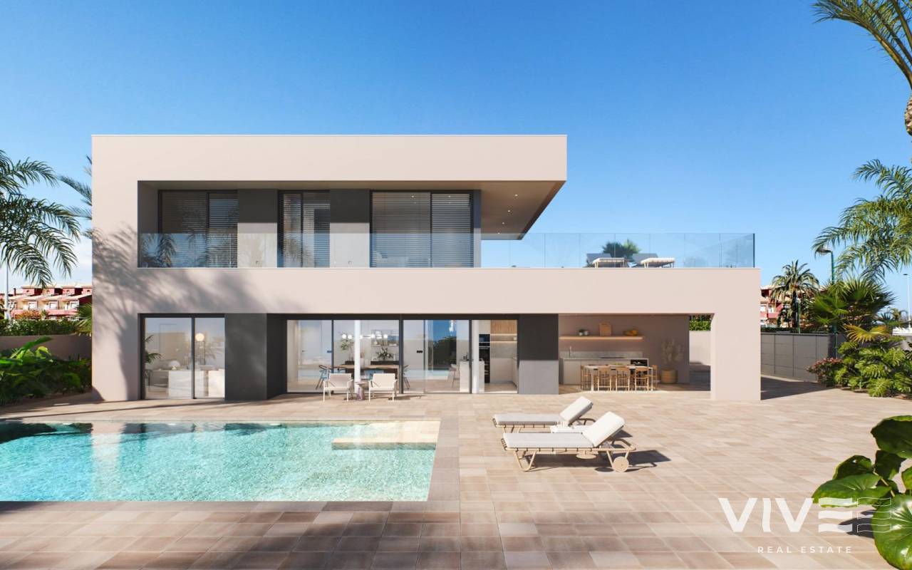 VILLA DE OBRA NUEVA EN TORRE DE LA HORADADA Moderna villat de obra nueva cerca de la playa de Higuericas en Torre de la Horadada. Villa consta de una parcela de 618 m², con 344 m² construidos. Villa dispone de 5 dormitorios: dos de ellos con baño completo y vestidor. Cocina amueblada con materiales de primera calidad a elegir por el propietario, incluyendo electrodomésticos, siguiendo un concepto abierto con el comedor rodeado de grandes ventanales que proporcionan durante todo el día una agradable luminosidad y acceso directo a la piscina y zonas ajardinadas privadas totalmente terminadas. Aire acondicionado (frío/calor) por conductos incluido. Cuidando hasta el más mínimo detalle en los acabados, utilizando materiales de la más alta calidad, diseño personalizado y lujo sin olvidar el máximo confort, conseguimos el disfrute de la vivienda tanto en verano como en el suave invierno, haciéndola habitable durante todo el año. Además de una zona de garaje cubierto para 2 vehículos y aparcamiento para otro coche. Villa situada a 100m de la playa de Higuericas, en Torre de la Horadada, un paraíso en todos los aspectos, donde podrá disfrutar de la inmensidad del Mar Mediterráneo, del paseo marítimo, de refrescantes baños en el mar, de deportes náuticos, vela, surf, snorkel y a tan solo 8 km de Lo Romero Golf, uno de los 21 campos de golf de la Costa Blanca. A 5 minutos del puerto deportivo de La Torre de la Horadada y a 10 minutos de los puertos deportivos de San Pedro del Pinatar, y de los mejores restaurantes donde disfrutar de la mejor cocina mediterránea. Sin olvidar la proximidad de la autopista AP7 que conecta nuestro residencial con dos aeropuertos con destinos internacionales, a 44 km de Corvera y a 75km de El Altet, Alicante. La población más cercana a la zona donde se ubica la promoción es Pilar de la Horadada, a 1 km, una población tranquila con todo tipo de servicios, colegios, centros de salud, policía, farmacias, etc. También hay dos zonas comerciales cercanas, el Centro Comercial Dos Mares en San Javier, a 5 minutos en coche y La Zenia Boulevard en Orihuela Costa, a 15 minutos en coche.