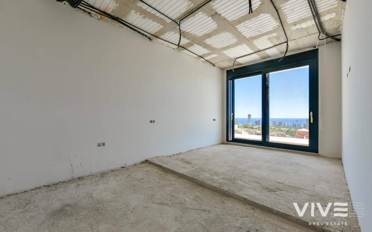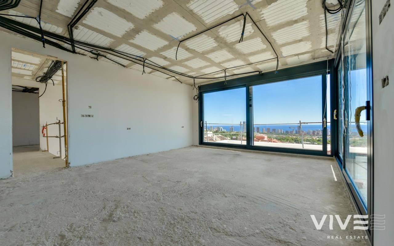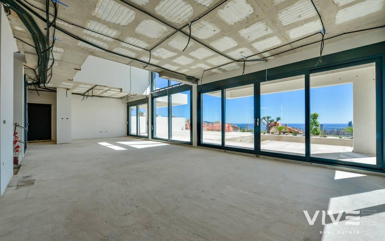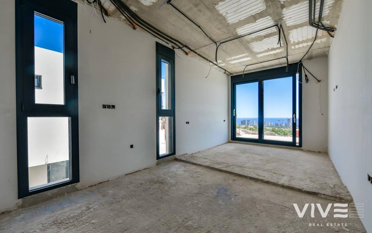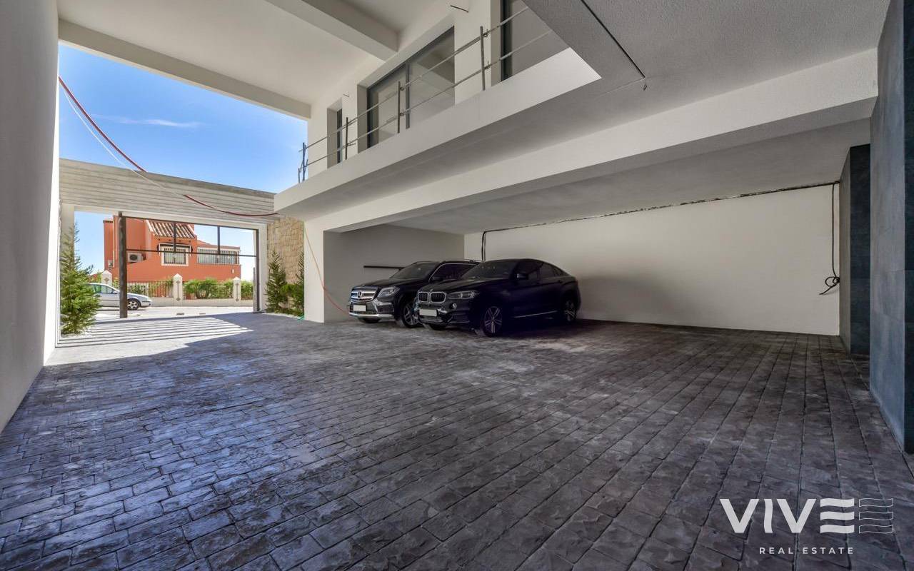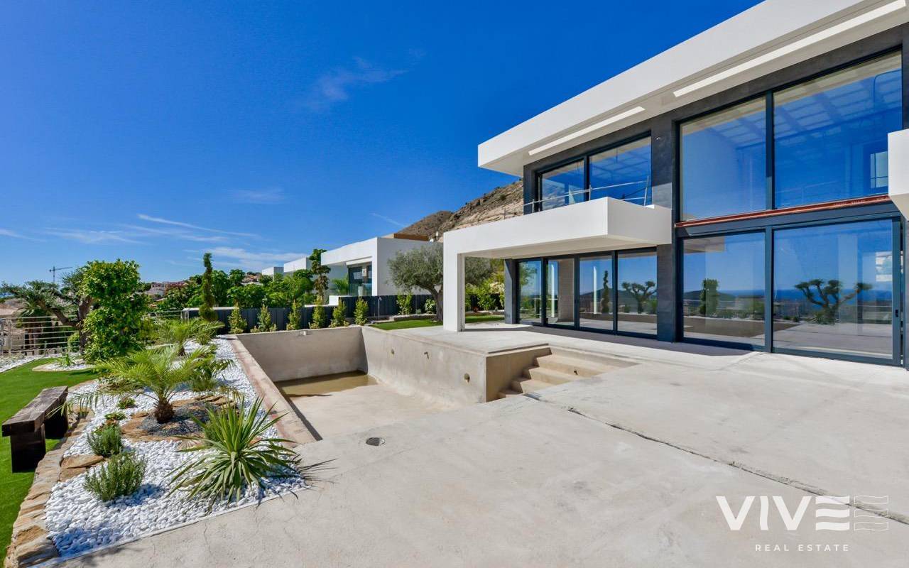 VILLA DE LUJO EN FINESTRAT CON VISTAS AL MAR Villa de lujo de nueva construcción con vistas al mar en Sierra Cortina, Finestrat. Llegando a la Urbanización hay un muro de piedra natural con una altura de 7 metros y las puertas automáticas de acceso al chalet llegando al garaje cubierto a nivel de calle con doble altura, luz natural y jardín con palmeras de diferentes alturas de 180 m2, una sala acristalada de 78 m2 con ascensor, escalera interior, guardarropa y espacio suficiente para poner sillones, convertir este espacio en un despacho o simplemente una sala de espera para visitas. La siguiente planta de 190 m2 de espacio cerrado está situada por debajo del nivel de la parcela pero 3 metros por encima del nivel de la calle y por tanto con luz natural. Se puede acceder a ella por el ascensor o la escalera interior del chalet, o por la escalera exterior del garaje, en este último caso sólo se puede acceder a los pasillos exteriores, al cuarto de instalaciones o a la puerta principal de esta planta, realizando así el mantenimiento de la vivienda sin necesidad de entrar dentro de la casa. Dentro de esta planta encontraremos 4 amplios dormitorios, salón con patio inglés de 17 m2 con la escalera de acceso a la parcela, lavadero, 2 baños, pasillos exteriores de 40 m2 y cuarto de instalaciones. Cuando subimos a la planta principal por 3 accesos vemos un salón de 130 m2 con doble luz, cocina abierta, aseo de invitados, vistas panorámicas al mar, y piscina de 54 m2 de laminado, un precioso jardín y 2 amplias terrazas cubiertas. A la planta de dormitorios accedemos por ascensor o escalera interior donde veremos un Dormitorio Principal de más de 50 m2 con baño en-suite, vestidor y terraza, dos dormitorios de unos 20 m2 cada uno, un baño y la terraza para estos dormitorios. Villa está equipada con Led exterior e interior, calefacción por suelo radiante, domótica, cristales Gamma de alta, aire acondicionado centralizado, persianas automáticas, techos altos y mucho más: Salón- 95 m2 Dormitorios- 8 (principal 52 m2 y secundario 20 m2) Baños- 5 Parcela- 890 м2 Construido- 998 м2 Piscina- 12 X 5 Cuatro Plantas Jardín (20 m2) - totalmente terminado con sistema de riego automático Ascensor (Otis) dentro de la casa Calefacción por suelo radiante Domótica (control de aire acondicionado, suelo radiante, iluminación interior y exterior, persianas) Persianas eléctricas Luces exteriores e interiores marca Siemens Techos altos de hasta 3,20 m de altura Impresionantes vistas al mar Una planta para invitados Calefacción aerotérmica Cocina totalmente equipada con isla Armarios empotrados Suelo de gres porcelánico Pared con piedra natural tallada a mano Garaje para 4 vehículos con puertas automáticas 160 m2 + hall de entrada 78 m2 Parking abierto 37 Chalet situado en el complejo Sierra Cortina, junto a dos campos de golf, parques temáticos, un gran centro comercial y a pocos minutos de las playas de Benidorm. Finestrat situado en la comarca de la Marina Baixa de la Costa Blanca, cerca de la vecina Benidorm y a unos 40 kilómetros de la ciudad de Alicante y del aeropuerto internacional. El pueblo está situado en la ladera del Puig Campana y ofrece hermosas vistas de las montañas, la costa y el mar Mediterráneo.