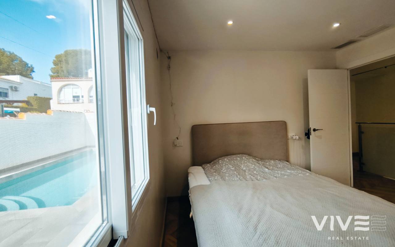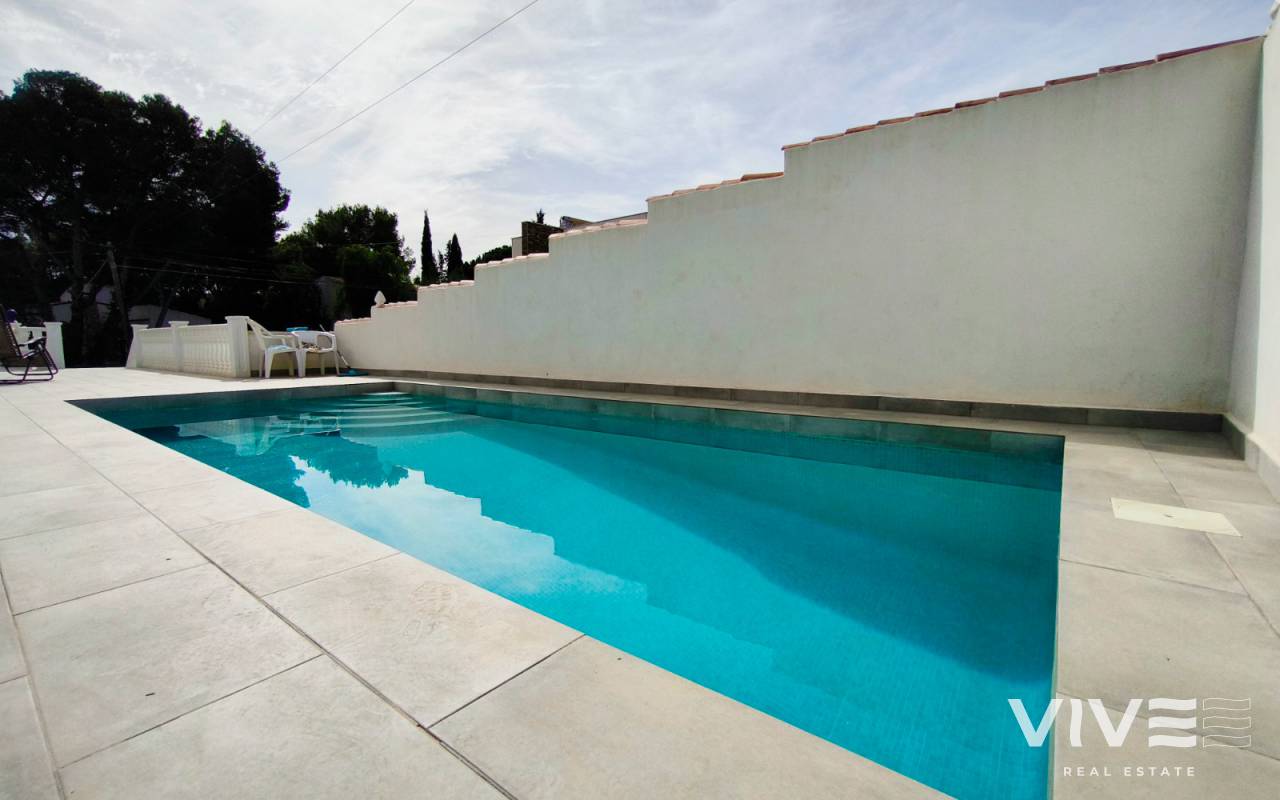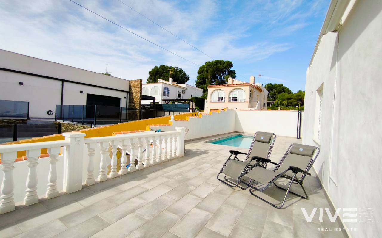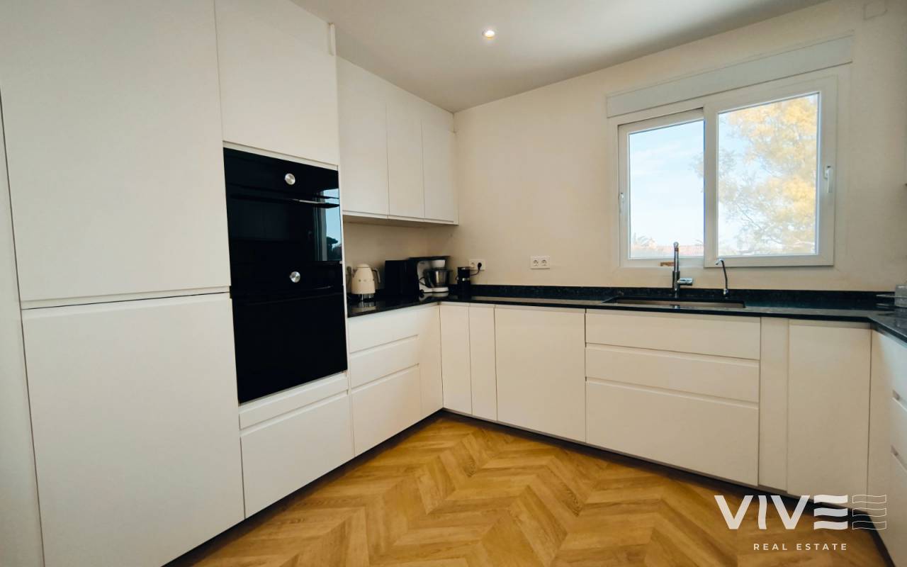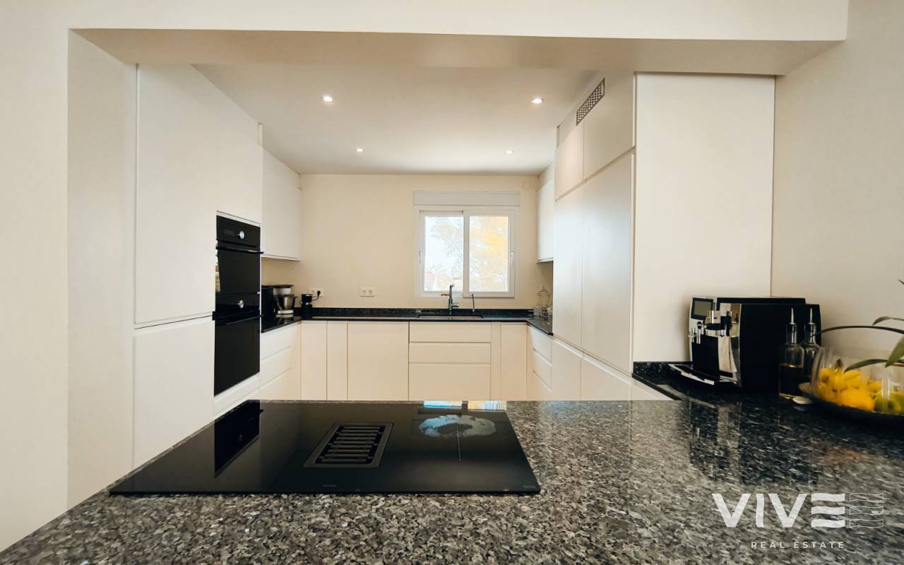 La parcela de 450 m² ofrece un amplio jardín privado, zona de parking, solárium y una espectacular piscina con acceso desde el salòn con terraza de 40 m², donde podrás relajarte y aprovechar al máximo el estilo de vida mediterráneo.