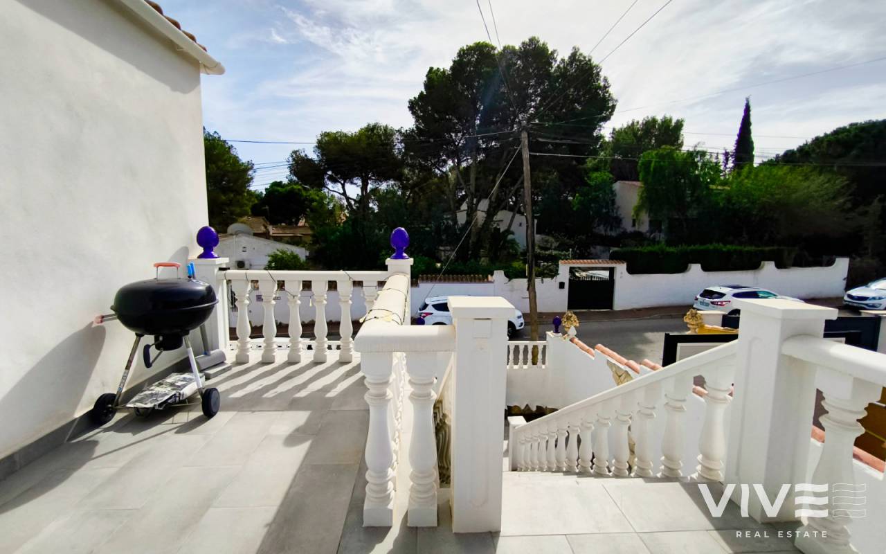 Distribuida en dos plantas, esta casa ofrece amplios espacios llenos de luz gracias a su orientación sur. Dispone de 5 dormitorios y 3 baños, un gran salón y varias terrazas que permiten disfrutar del clima mediterráneo durante todo el año.