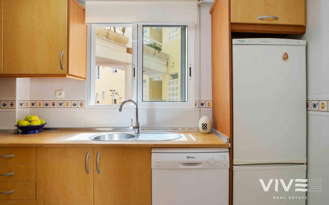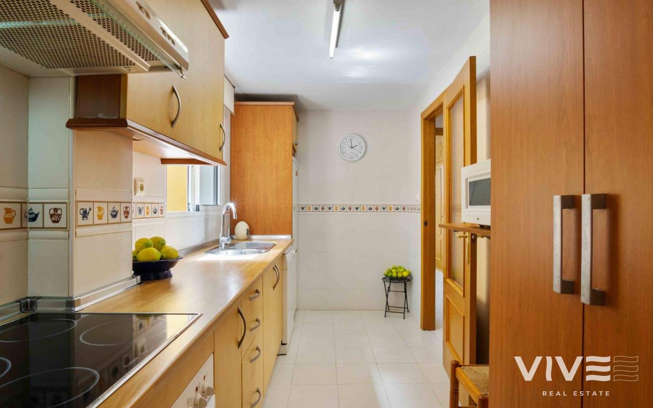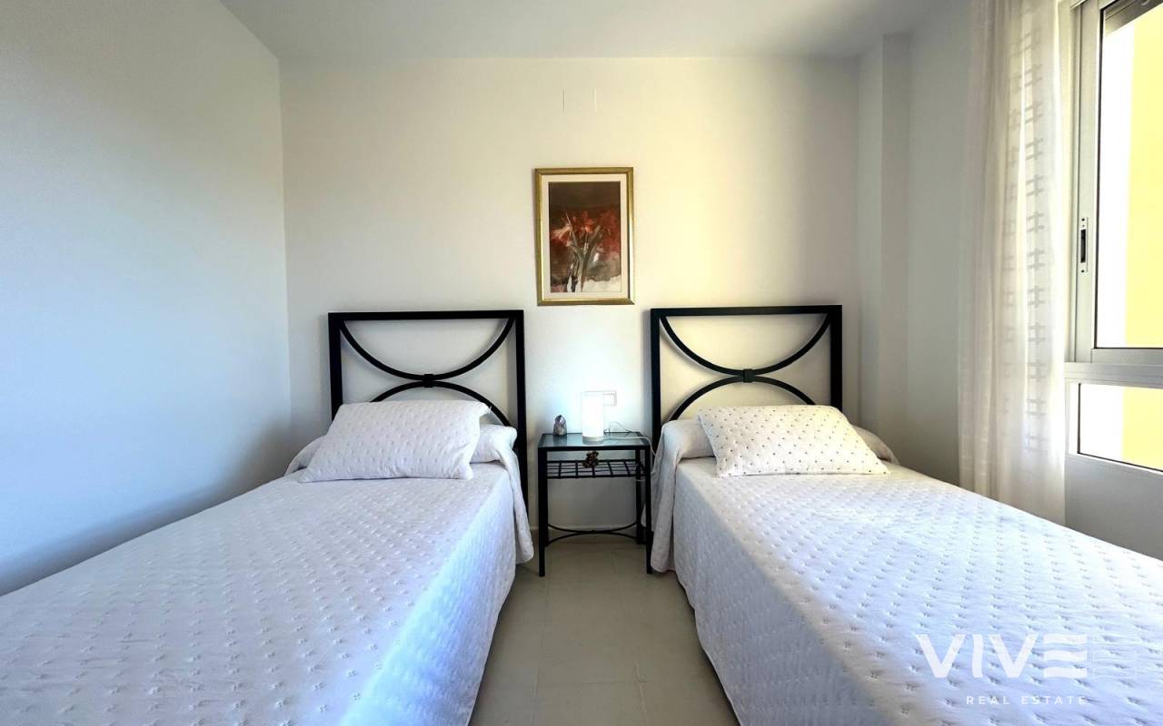Amplio apartamento en Aguamarina, en residencial situado en primera línea. Planta primera, orientación noroeste. La vivienda de 100m2, cuenta con tres dormitorios, dos baños completos (uno en suite), cocina independiente, equipada, salón-comedor y dos terrazas de unos 12m2. Se vende amueblado. El residencial con piscina se encuentra justo encima de la playa de Aguamarina y de Campoamor, con accesos privados directos a la playa. El apartamento dispone de plaza de parking.