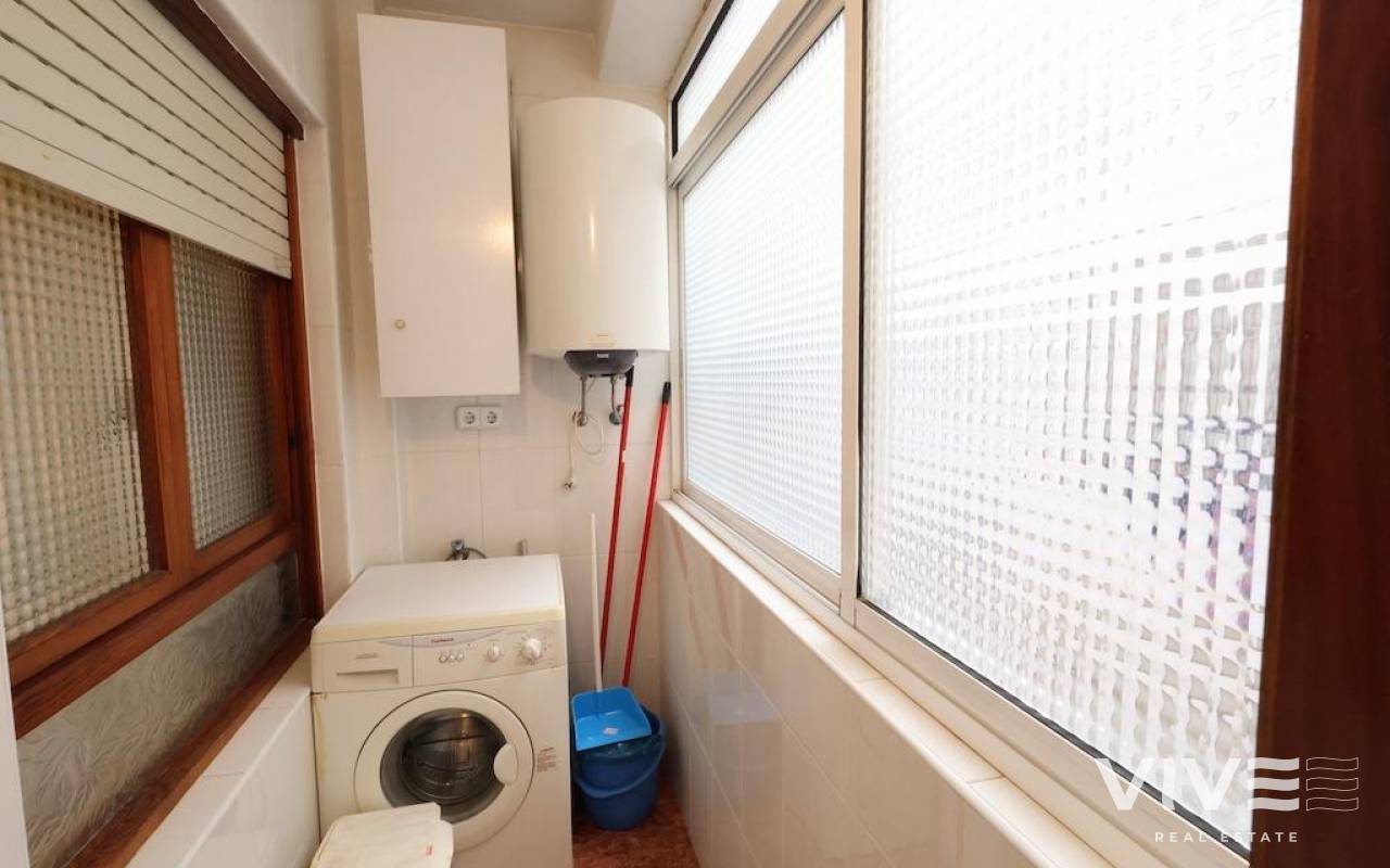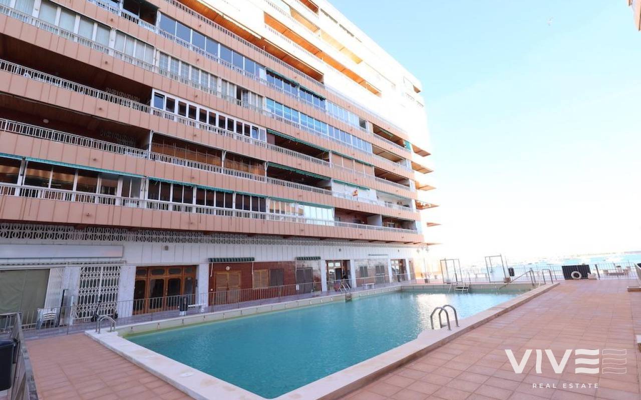 Torrevieja, Residencial Navamares residencial en primera linea de la playa, apartamento en planta 6ª con vistas panorámicas al mar y orientación sur, vivienda de 89 m2 con 3 dormitorios, baño, aseo, cocina independiente con galeria y un gran salón comedor, dispone de una terraza acristalada de 19 m2, la vivienda se vende amueblada y el residencial cuenta con piscina comunitaria.