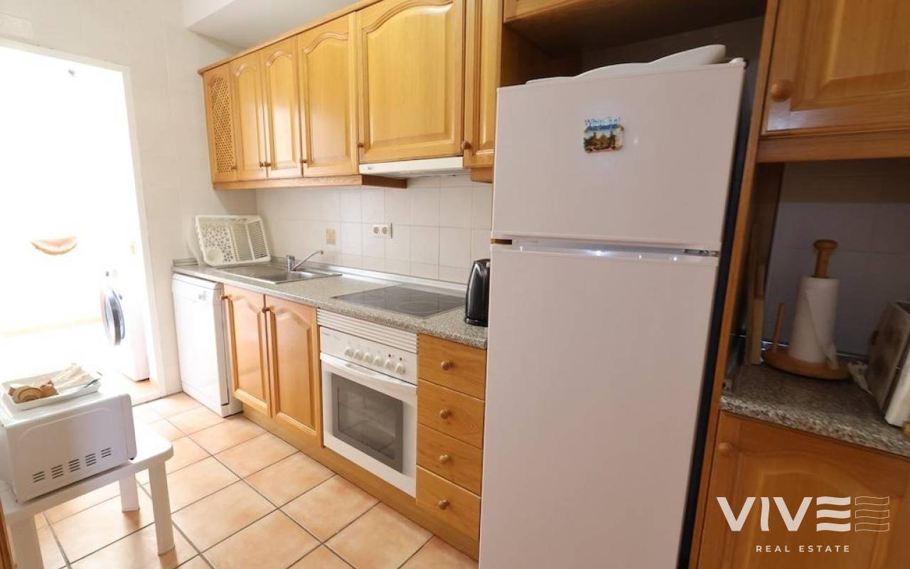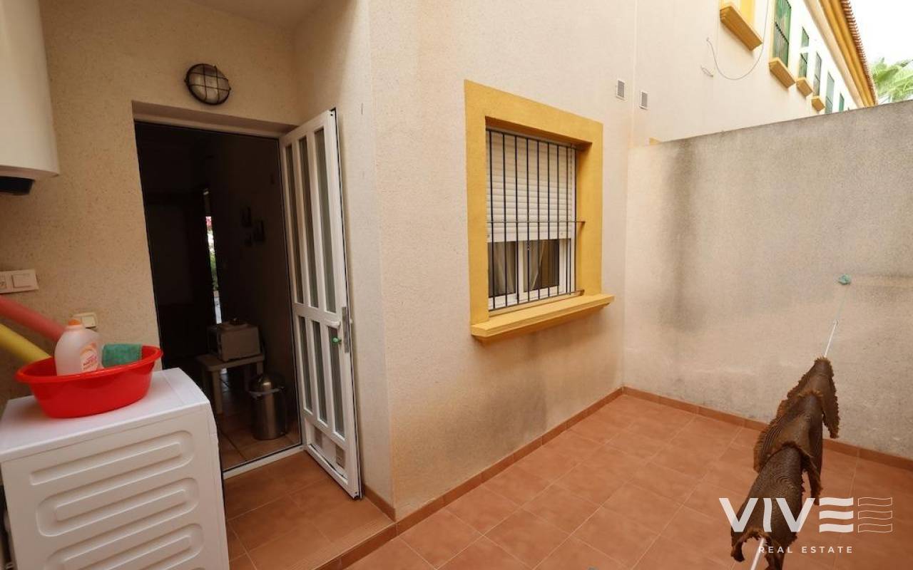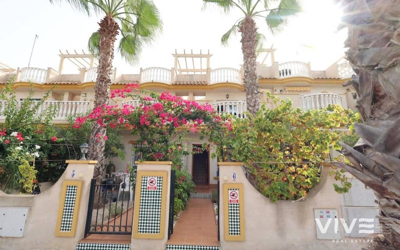 Chalet adosado en el exclusivo residencial Aldeas de Aguamarina, ubicado en Cabo Roig. La vivienda cuenta con una superficie de 72 m2 y se distribuye en 3 dormitorios, uno de ellos en planta baja, 2 baños completos, amplio salón-comedor, y una espaciosa cocina independiente con galería abierta.. . Dispone de dos terrazas, un jardín de 34 m2 con zona de barbacoa ideal para disfrutar al aire libre, y un gran solárium con vistas al mar. Se vende semi-amueblada y en buen estado de conservación.. . El residencial ofrece una preciosa piscina comunitaria y se encuentra a pocos pasos del mar y de todos los servicios. Ideal como residencia habitual o como inversión para alquiler vacacional.