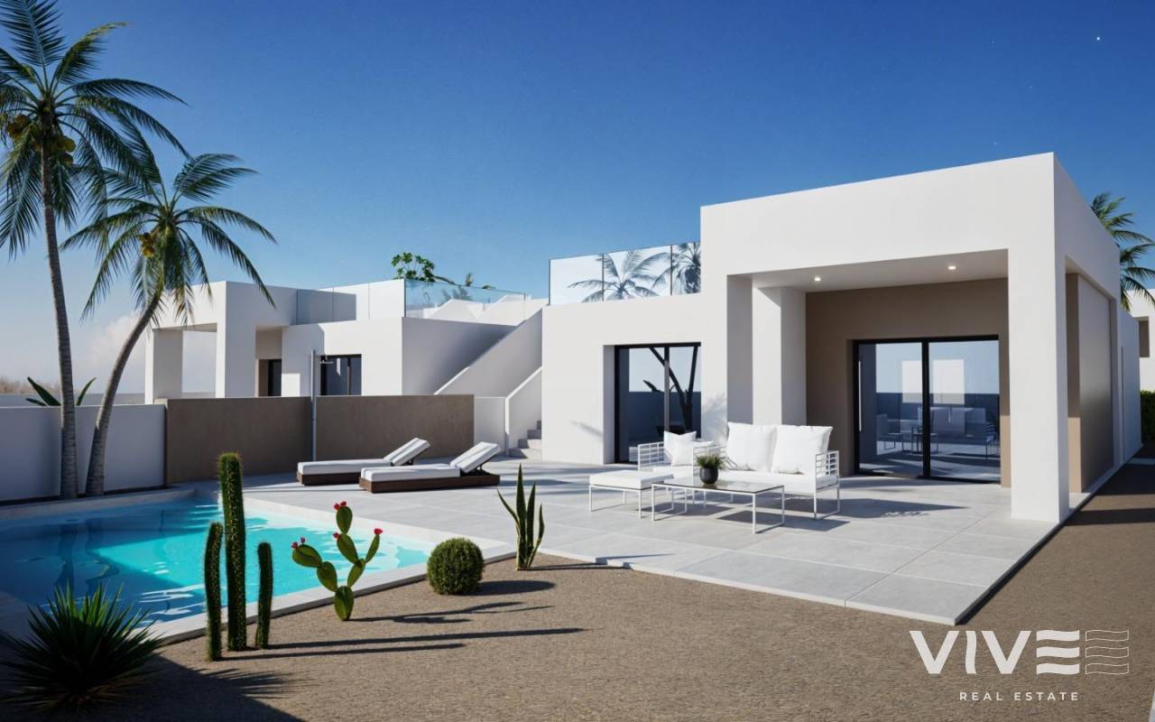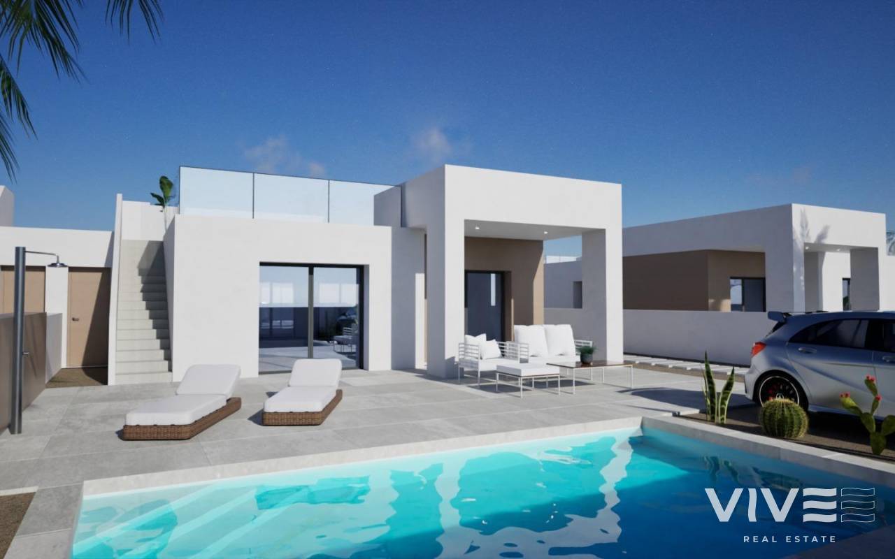 Villas de estilo moderno en La Romana, Alicante Exclusivas viviendas de nueva construcción en un encantador pueblo español Estas villas de nueva construcción de estilo moderno en La Romana están diseñadas para aquellos que buscan paz, comodidad y el auténtico estilo de vida español. Situadas en parcelas de 370 m² en una zona residencial a las afueras del pueblo, las viviendas se encuentran a pocos pasos del centro, donde se puede disfrutar de restaurantes tradicionales, tiendas y todos los servicios diarios. Rodeada de viñedos, almendros y paisajes montañosos, La Romana ofrece un entorno rural único a solo 30 minutos de la costa. Diseño espacioso con comodidades modernas Cada villa ofrece 127 m² de superficie construida distribuidos en 3 dormitorios y 2 baños, incluida una suite principal con baño en suite. La sala de estar y el comedor de planta abierta se integran a la perfección con una cocina amueblada y acceso directo a la terraza y la piscina privada. Otras características adicionales son un trastero/lavadero y un aparcamiento privado dentro de la parcela. Para aquellos que deseen más espacio exterior, existe la opción de añadir un solárium en la azotea con un coste adicional. Características premium incluidas Estas villas están construidas con acabados de calidad y están totalmente equipadas con: Piscina privada de 6 x 3,5 m Aire acondicionado con bomba de calor (instalación y unidad incluidas) Cocina moderna con armarios blancos y encimeras de granito Iluminación LED en toda la casa y en el porche Doble acristalamiento, puertas interiores blancas y armarios empotrados La entrega está prevista para 14 meses después de la reserva, lo que garantiza una vivienda nueva y personalizada. Ubicación ideal en la campiña alicantina La Romana es un pueblo tradicional español en el interior de Alicante, conocido por su acogedora comunidad y su entorno natural. Su ubicación ofrece el equilibrio perfecto entre tranquilidad y accesibilidad: Aspe: 8 km Elche: 18 km Aeropuerto de Alicante: 35 km Playas de la Costa Blanca: 30 km Campos de golf (Font del Llop y Alenda) – 20 km Ciudad de Alicante – 32 km Su estilo de vida mediterráneo le espera Si busca un entorno tranquilo rodeado de montañas, viñedos y encantadores pueblos españoles, pero cerca de la costa mediterránea, estas villas en La Romana son la elección perfecta. Póngase en contacto con nosotros hoy mismo para obtener más información y asegurarse su nueva vivienda en Alicante.