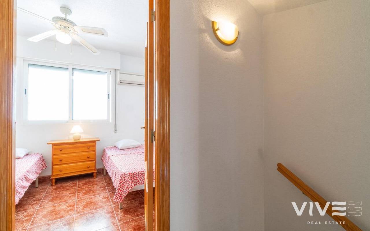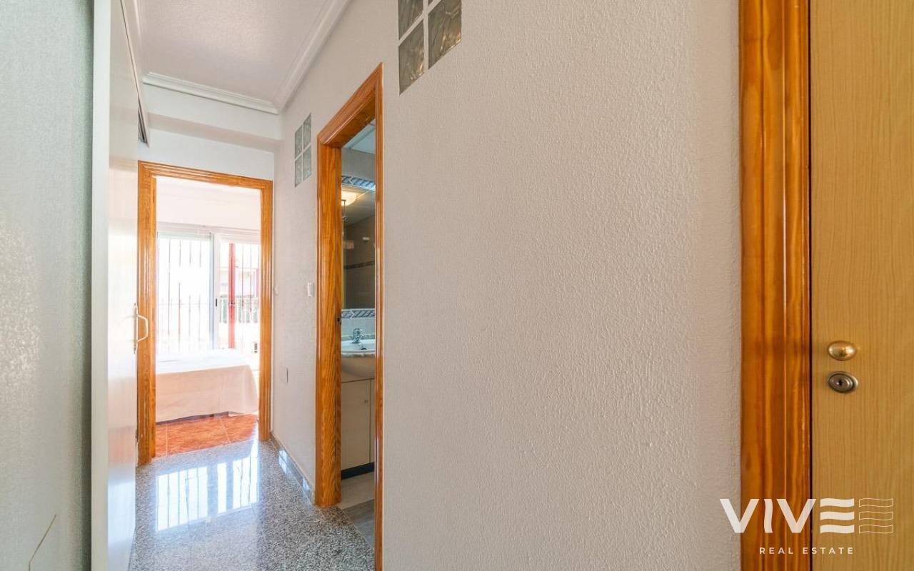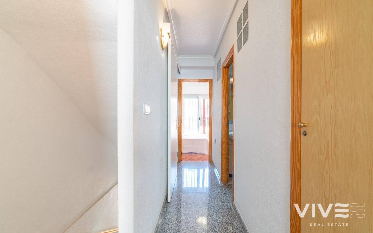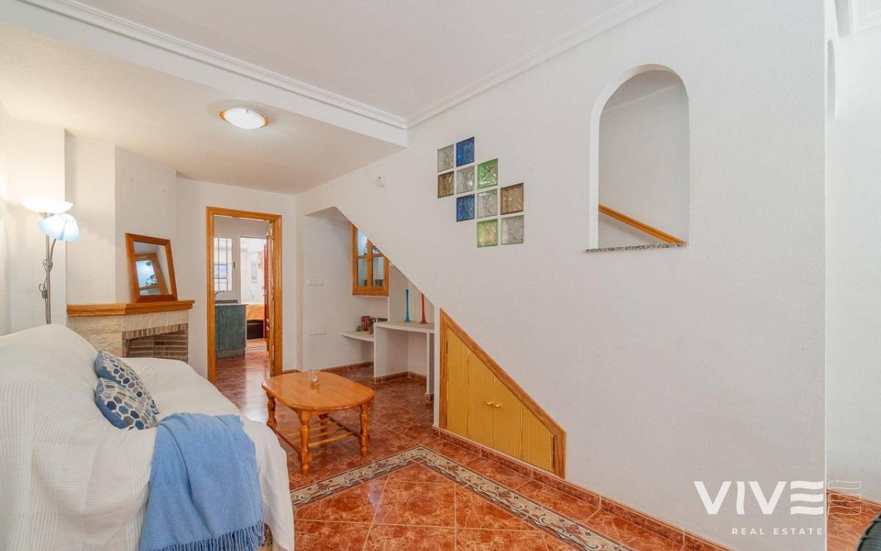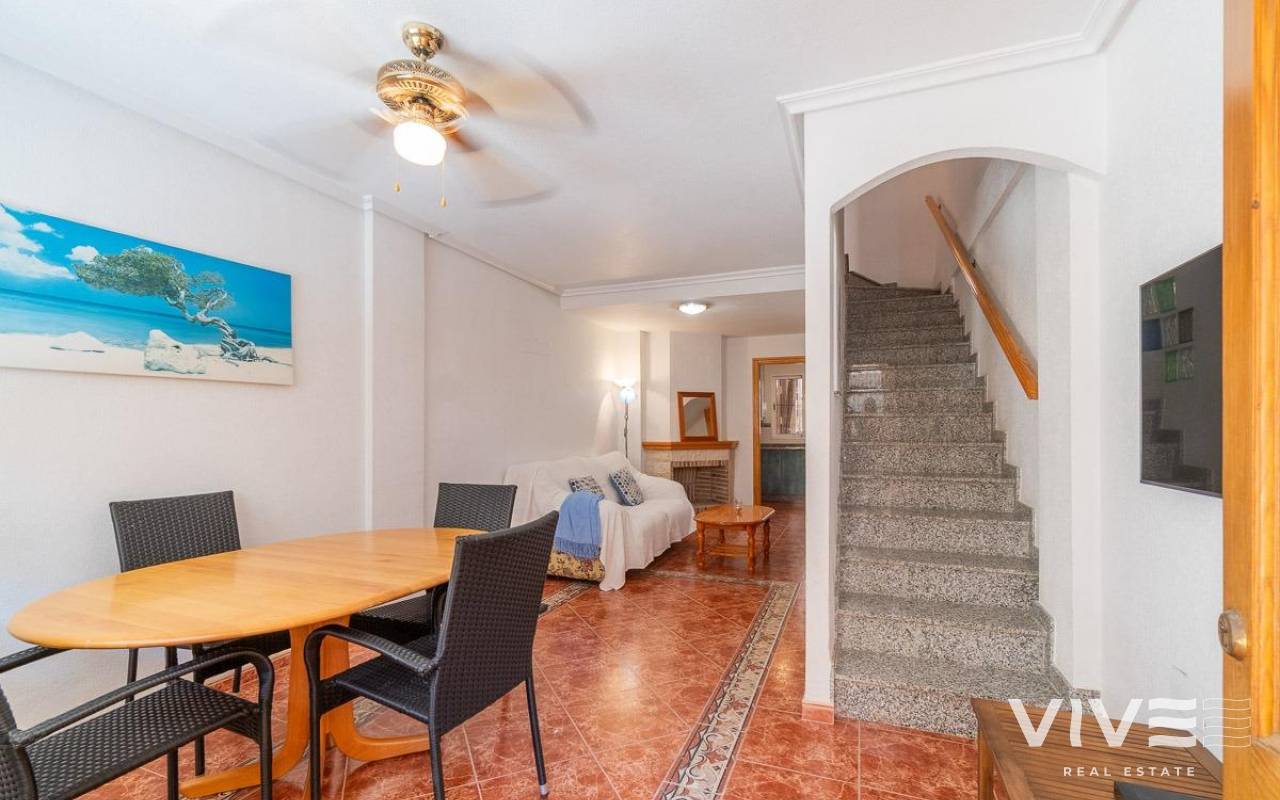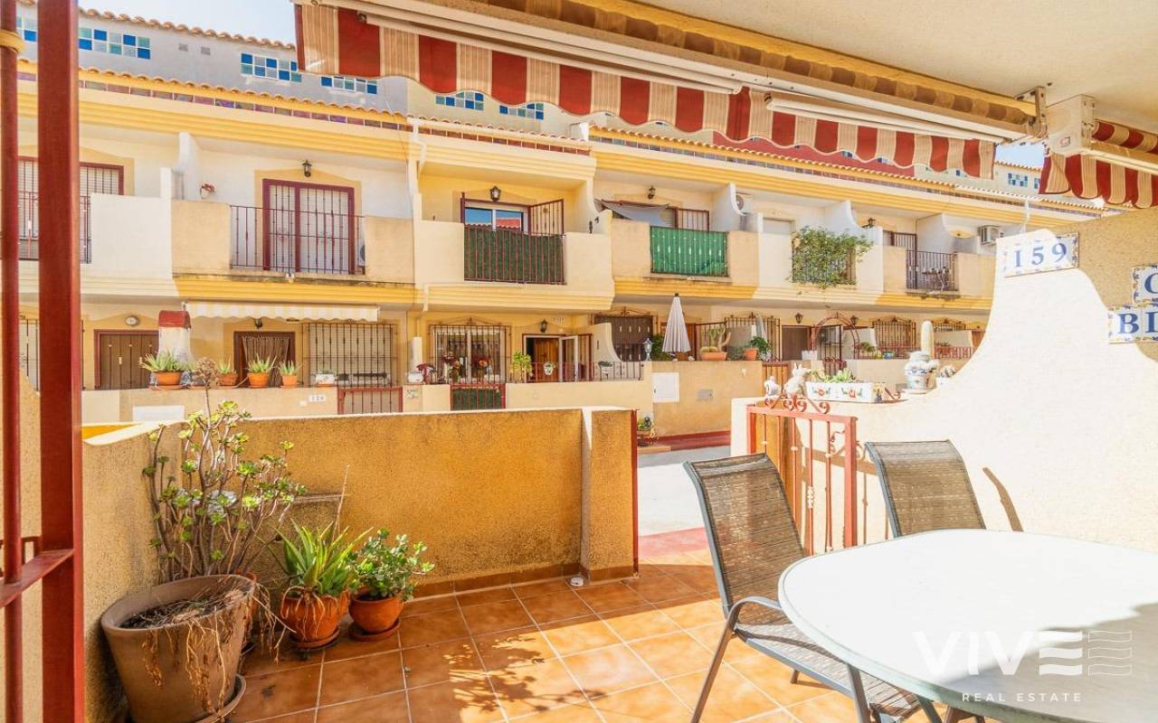En pleno centro de Playa Flamenca, a un paseo del centro comercial Zenia Boulevard, de las playas, de zonas deportivas, de ocio y colegios, se encuentra este precioso y luminoso triplex adosado mirando al Sur.. La vivienda se encuentra dentro de un residencial vallado y con puertas automáticas, con amplias zonas de parking para el coche en las calles de acceso y con zona de piscina comunitaria en su centro, aislada y sin ruido ni tráfico alguno.. Tiene orientación Sur, por tanto con sol prácticamente todo el día y cuenta también con un solarium en su parte trasera para poder descansar a la sombra en pleno verano cuando hace demasiada calor en la parte frontal de la vivienda.. Cuenta con una terraza en su parte delantera a la entrada de la propiedad, para poder tomar el sol todo el año. Se accede a la vivienda que cuenta con un salón-comedor con chimenea, una cocina independiente para poder cocinar con la puerta cerrada y no tener olores ni grasa en el resto de la vivienda, una salida directa desde ésta a un patio cubierto con techo de aluminio y cristal, que puede ser utilizado como salón segundo, como lavadero e incluso como dormitorio de personas que no puedan subir a las plantas superiores ya que cuenta con un cuarto de aseo con ducha.. En planta primera a la que se accede a través de una escalera interior, cuenta con dos dormitorios con armarios empotrados y uno de ellos con balcón, y un cuarto de baño completo con ducha de obra, teniendo en la tercera y última planta superior una tercera habitación abuhardillada con cuarto de baño con ducha perfecta para que niños o adolescentes hagan su vida porque cuenta con un solarium-terraza con salida únicamente desde ésta.. La vivienda está amueblada, tiene todos los electrodomésticos en la cocina y en perfectas condiciones con todo lo necesario para entrar a vivir inmediatamente en ella.. Sea como vivienda vacacional o para vivir todo el año, merece la pena una visita para comprobar sus múltiples ventajas y utilidades. Especialistas en Orihuela Costa