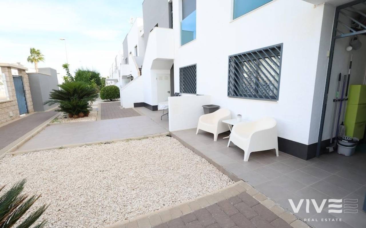 La Zenia, Residencial Oasis Beach II, Bungalow en planta baja y orientación Sur Este de 70 m2 y una terraza acristalada de 13,50 m2, la vivienda dispone de 2 dormitoros uno de ellos en suite, 2 baños, cocina abierta al salón, la vivienda se vende amueblada y con aire acondicionado por conductos, la vivienda se vende con su plaza de garaje subterráneo, el residencial cuenta con grandes zonas ajardinadas y una preciosa piscina, zona infantil de juegos etc...