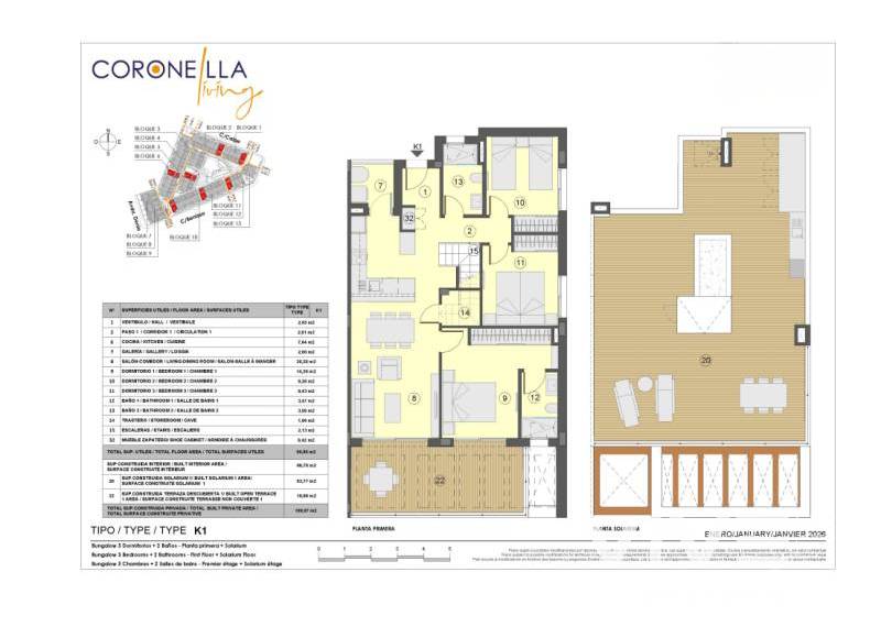 En esta tipología concreta hablamos de un bungalow de 3 dormitorios y 2 baños en planta alta con solárium privado, una opción especialmente valorada por quienes desean privacidad, vistas despejadas y un espacio exterior elevado.