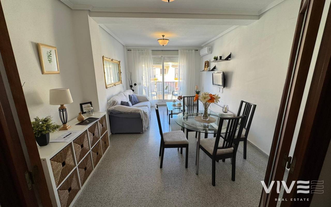 Te presentamos este amplio apartamento de 100 m² en San Miguel de Salinas, una vivienda en buen estado, ideal tanto como residencia habitual como para disfrutar de tus vacaciones. Su orientación noreste garantiza una agradable entrada de luz natural y una temperatura equilibrada durante todo el año, creando espacios confortables y acogedores.La vivienda dispone de 3 habitaciones y 2 baños, una cocina independiente totalmente equipada, y se entrega amueblada con electrodomésticos, lista para entrar a vivir. La terraza de 4 m² se convierte en el espacio perfecto para relajarse al aire libre, mientras que el solárium comunitario aportan un plus de ocio y bienestar.Características principales100 m² construidos3 habitaciones2 bañosCocina independienteTerraza de 4 m²solárium comunitario.Garaje incluidoAmuebladoIBI 157 €Comunidad 45 € trimestrales Precio 139.900 €Su ubicación es uno de sus grandes atractivos rodeado de todo tipo de servicios como bares, restaurantes, farmacias, supermercados y centros comerciales, lo que facilita un estilo de vida cómodo y práctico. Además, cuenta con garaje incluido, un valor añadido imprescindible.El aeropuerto de Alicante-Elche se encuentra aproximadamente a 55 km, lo que permite excelentes conexiones nacionales e internacionales . Agenda tu visita hoy mismo y descubre todo lo que este apartamento te puede recomendar.