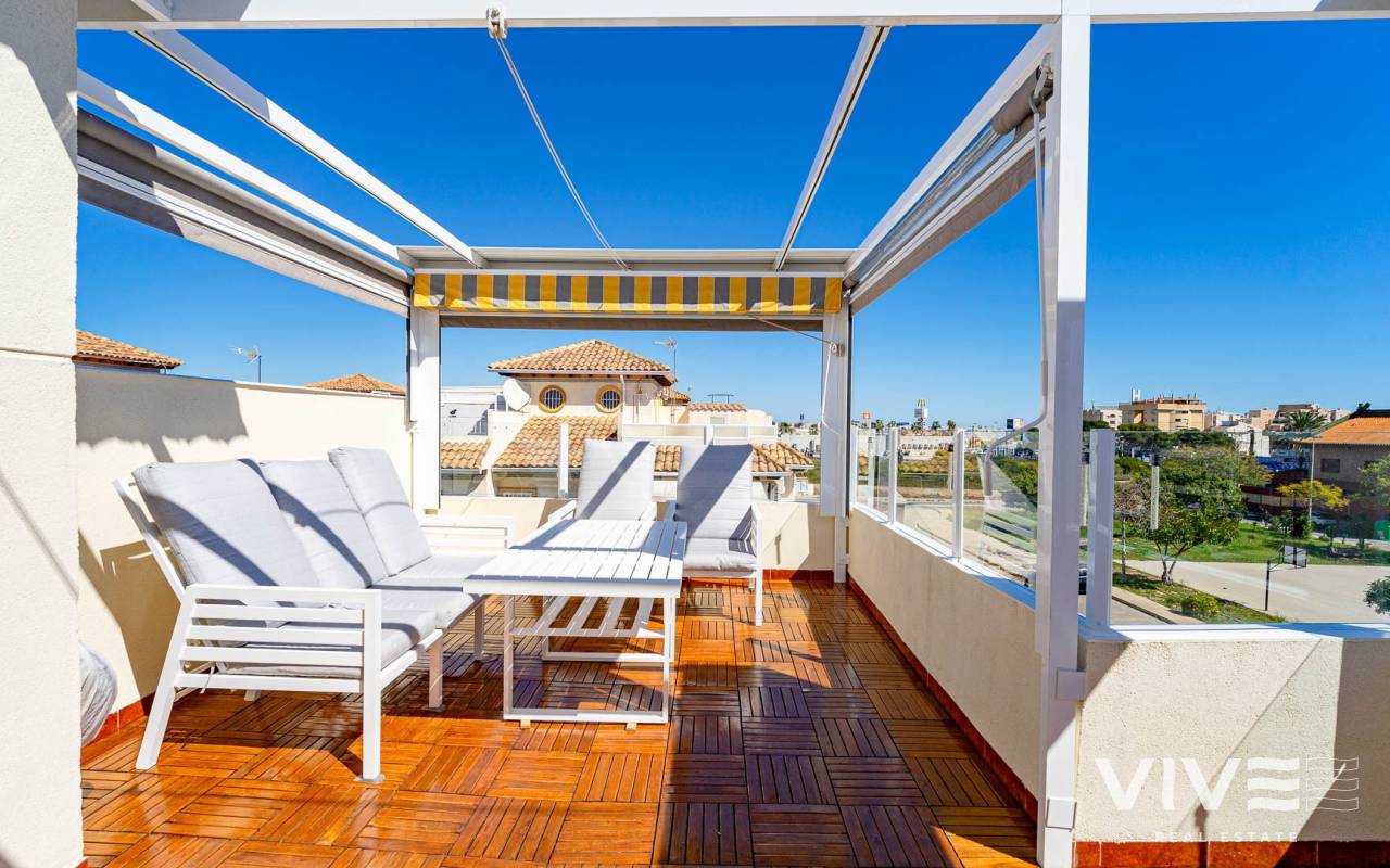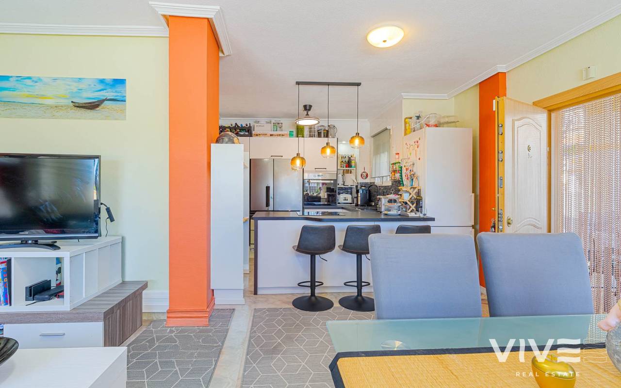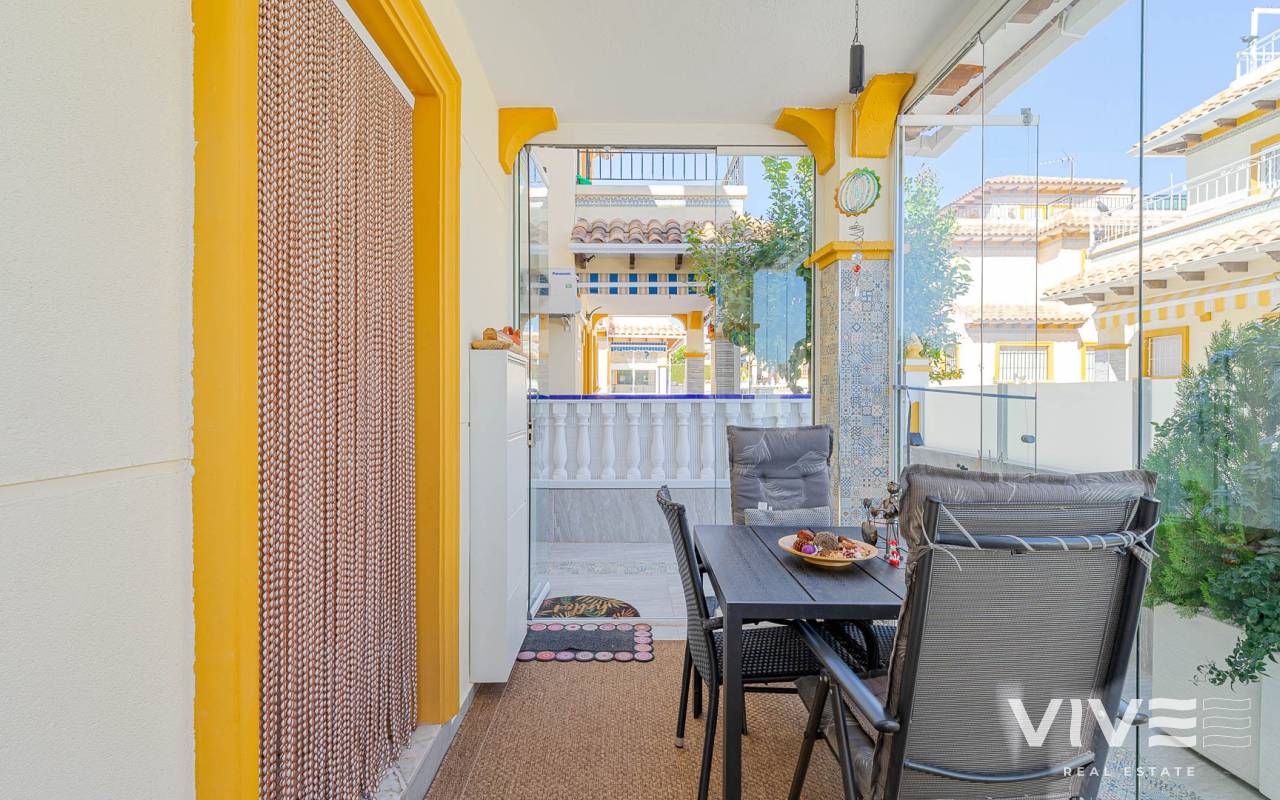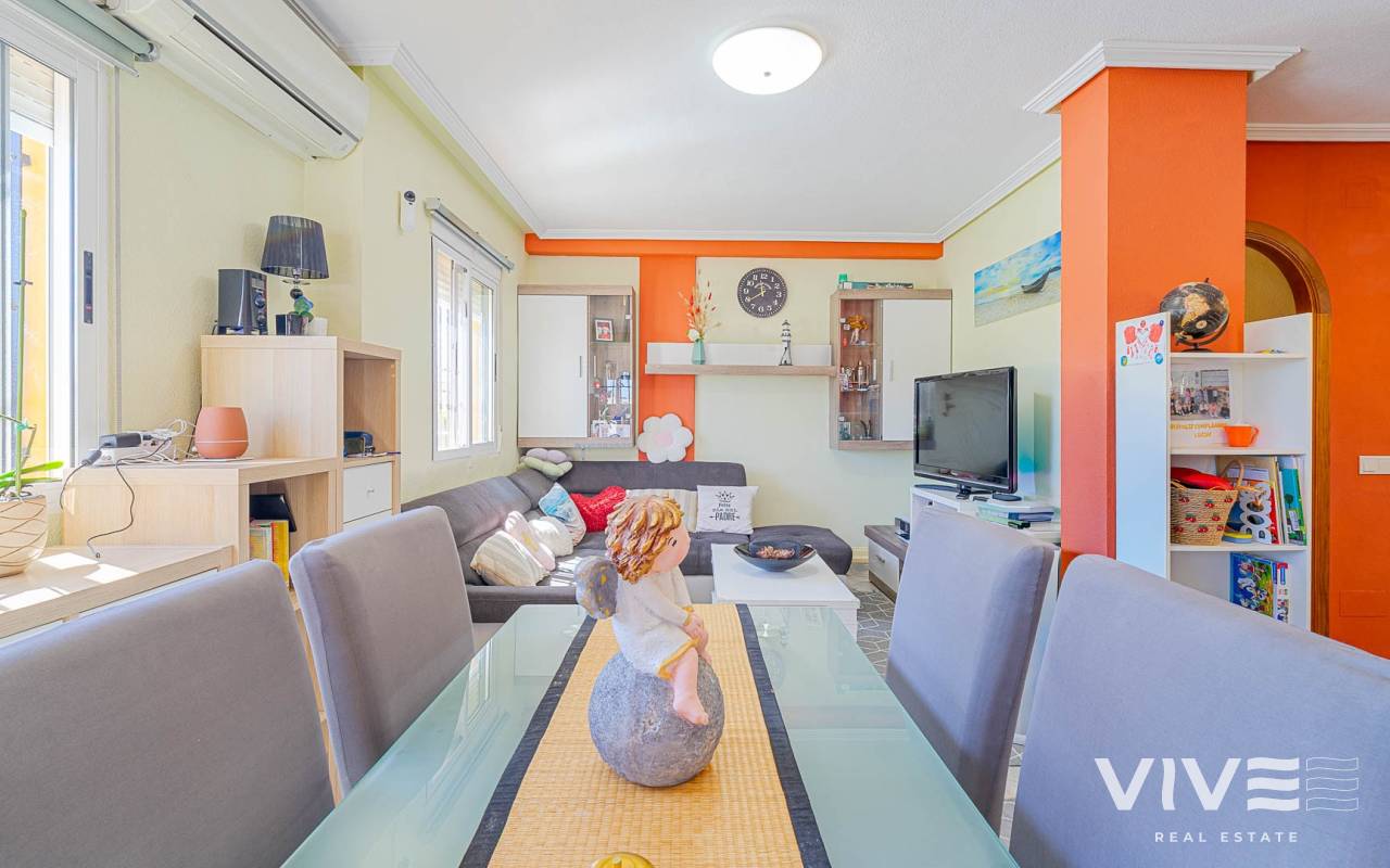 Este elegante adosado con reforma moderna está ubicado en la prestigiosa zona de Punta Prima, en la costa de Costa Blanca, a poca distancia a pie del mar y de las playas de Orihuela Costa. La zona destaca por su infraestructura desarrollada, ambiente acogedor y proximidad a todos los servicios necesarios: restaurantes, tiendas, farmacias y zonas de paseo, lo que la convierte en un lugar ideal tanto para vivir como para disfrutar de las vacaciones. La vivienda ha sido recientemente renovada con materiales de alta calidad, ofreciendo un estilo moderno, elegante y confortable. El adosado cuenta con una amplia parcela con aparcamiento y trastero, así como una distribución funcional en dos plantas. Al entrar, encontrará una terraza acristalada que conduce a un luminoso salón-comedor y una cocina totalmente equipada. Dispone de 2 acogedores dormitorios, un baño moderno y un aseo de invitados. Una de sus mayores ventajas es el solárium privado con vistas al mar, perfecto para disfrutar del sol durante todo el año. Los residentes pueden disfrutar de una gran piscina comunitaria. A tan solo unos minutos en coche se encuentra el mayor centro comercial de la zona, La Zenia Boulevard, con una amplia oferta de tiendas y ocio. Una oportunidad ideal como vivienda habitual, casa de vacaciones o inversión en la soleada costa de España.