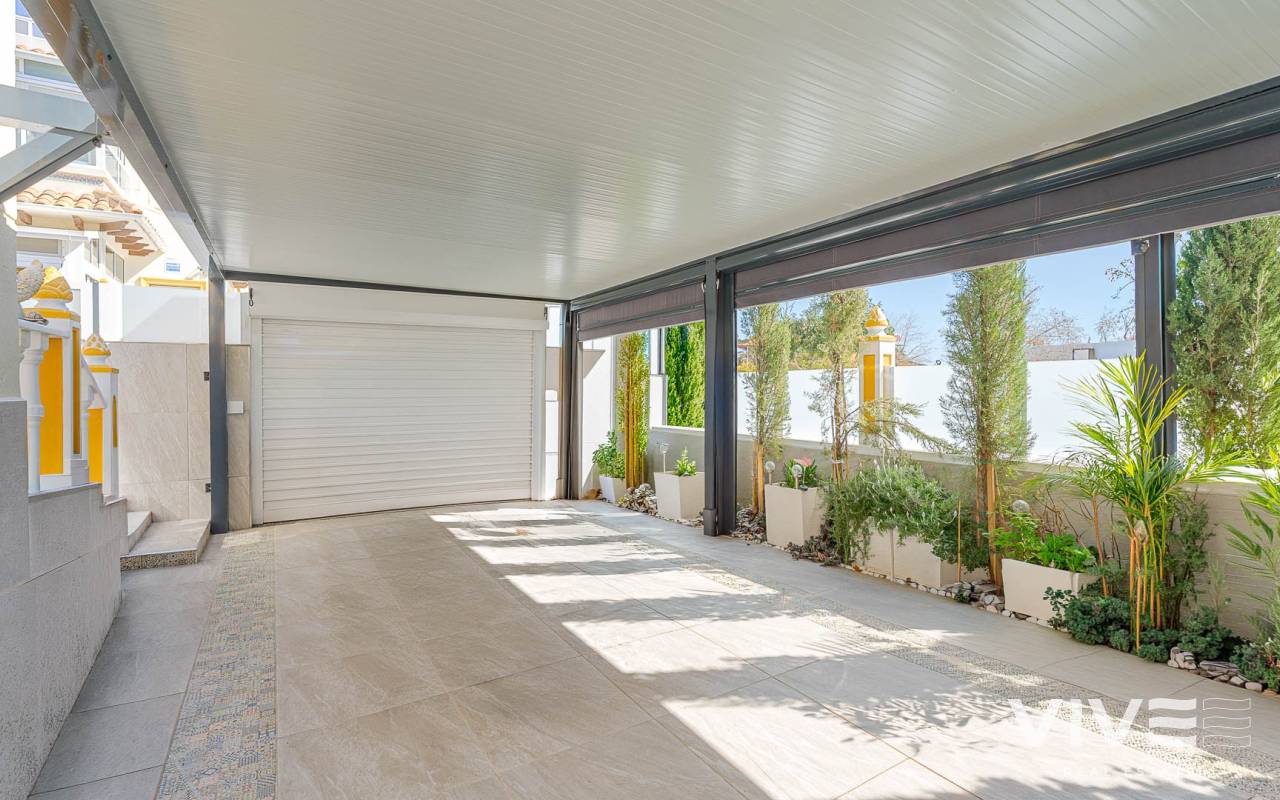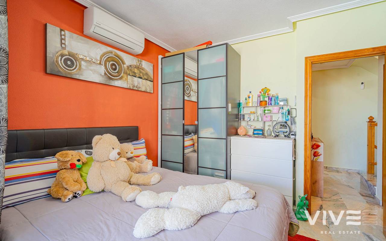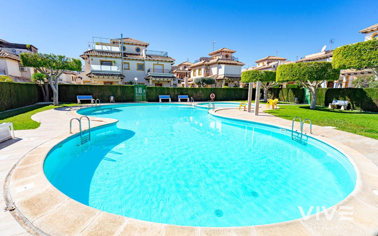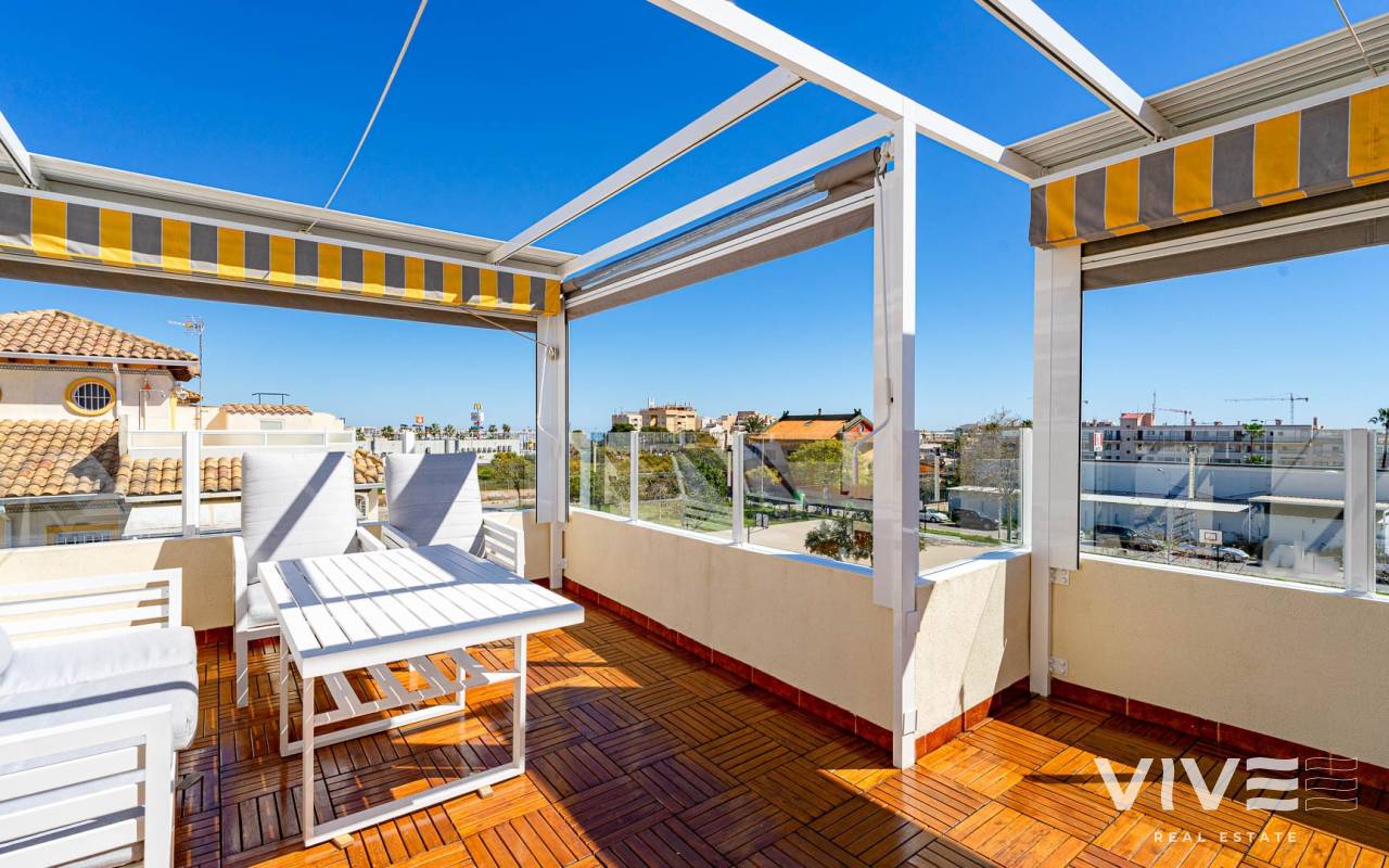 Este elegante adosado con reforma moderna está ubicado en la prestigiosa zona de Punta Prima, en la costa de Costa Blanca, a poca distancia a pie del mar y de las playas de Orihuela Costa. La zona destaca por su infraestructura desarrollada, ambiente acogedor y proximidad a todos los servicios necesarios: restaurantes, tiendas, farmacias y zonas de paseo, lo que la convierte en un lugar ideal tanto para vivir como para disfrutar de las vacaciones. La vivienda ha sido recientemente renovada con materiales de alta calidad, ofreciendo un estilo moderno, elegante y confortable. El adosado cuenta con una amplia parcela con aparcamiento y trastero, así como una distribución funcional en dos plantas. Al entrar, encontrará una terraza acristalada que conduce a un luminoso salón-comedor y una cocina totalmente equipada. Dispone de 2 acogedores dormitorios, un baño moderno y un aseo de invitados. Una de sus mayores ventajas es el solárium privado con vistas al mar, perfecto para disfrutar del sol durante todo el año. Los residentes pueden disfrutar de una gran piscina comunitaria. A tan solo unos minutos en coche se encuentra el mayor centro comercial de la zona, La Zenia Boulevard, con una amplia oferta de tiendas y ocio. Una oportunidad ideal como vivienda habitual, casa de vacaciones o inversión en la soleada costa de España.
