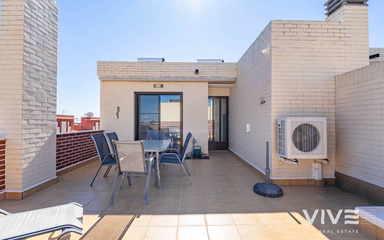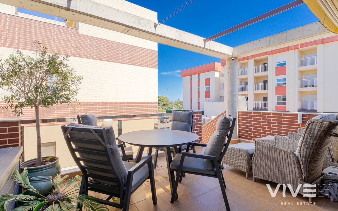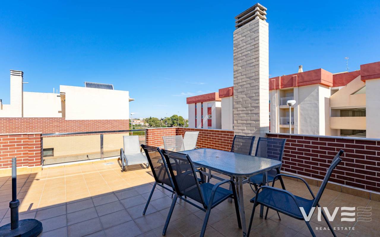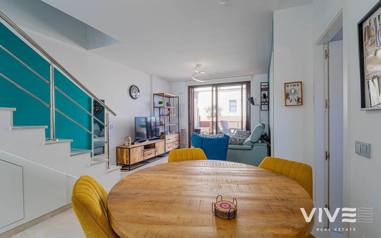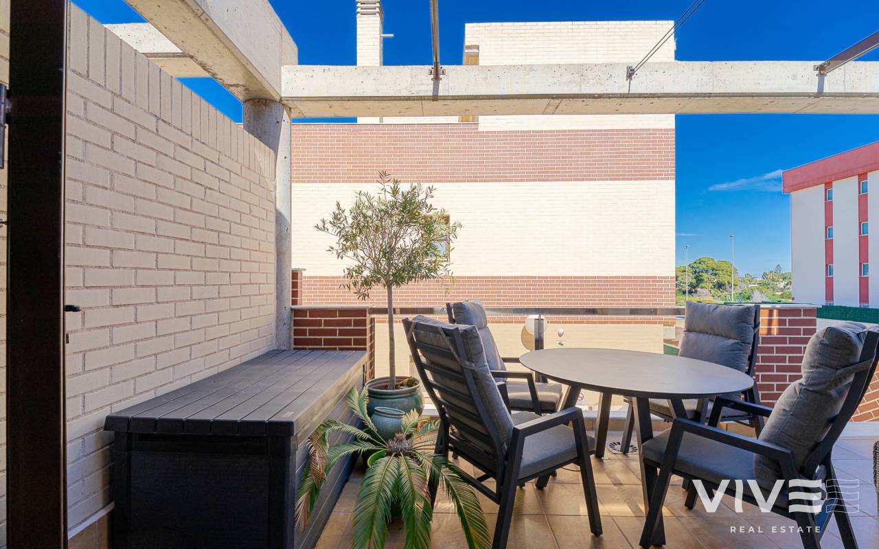Presentamos este moderno dúplex en venta en Lomas de Cabo Roig, Orihuela Costa (Costa Blanca Sur) — una excelente opción tanto para residencia habitual como para vivienda vacacional o inversión para alquiler. La vivienda cuenta con 81,50 m² construidos más aprox. 50 m² de terrazas, incluyendo una amplia terraza principal y un solárium privado. Situada en la segunda y última planta de un residencial moderno construido en 2015, es considerada una de las mejores ubicaciones dentro del complejo ,es considerada una de las mejores ubicaciones dentro del complejo por su orientación soleada y vistas abiertas. Distribución y Características Planta principal: Luminoso salón-comedor con acceso directo a una amplia terraza (sol de mañana y tarde)Cocina totalmente equipada2 dormitorios1 baño con duchaSistema de alarmaMosquiteras en todas las ventanas Planta superior: Amplio dormitorio principal tipo suite con armarios empotradosSegundo baño con duchaAcceso directo a un solárium privado con sol todo el día y vistas abiertas. El solárium es un espacio ideal para zona chill-out, barbacoa o disfrutar del clima mediterráneo con total privacidad. Zonas Comunes del Residencial Gran piscina comunitariaGimnasioSaunaJacuzziZona spaPlaza de garaje subterránea incluida Ubicación – Cabo Roig, Orihuela Costa Ubicado en una de las zonas más demandadas de la Costa Blanca Sur: A 550 metros de un moderno centro comercial con restaurantes, supermercado y rooftop lounge barMuy cerca de La Zenia BoulevardPlayas de Cabo Roig y Campoamor a unos 15 minutos en bicicletaVarios campos de golf a pocos minutos en cocheTodos los servicios diarios a poca distancia
