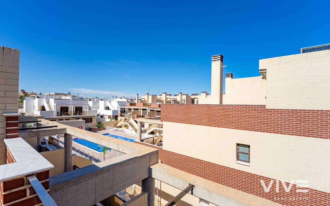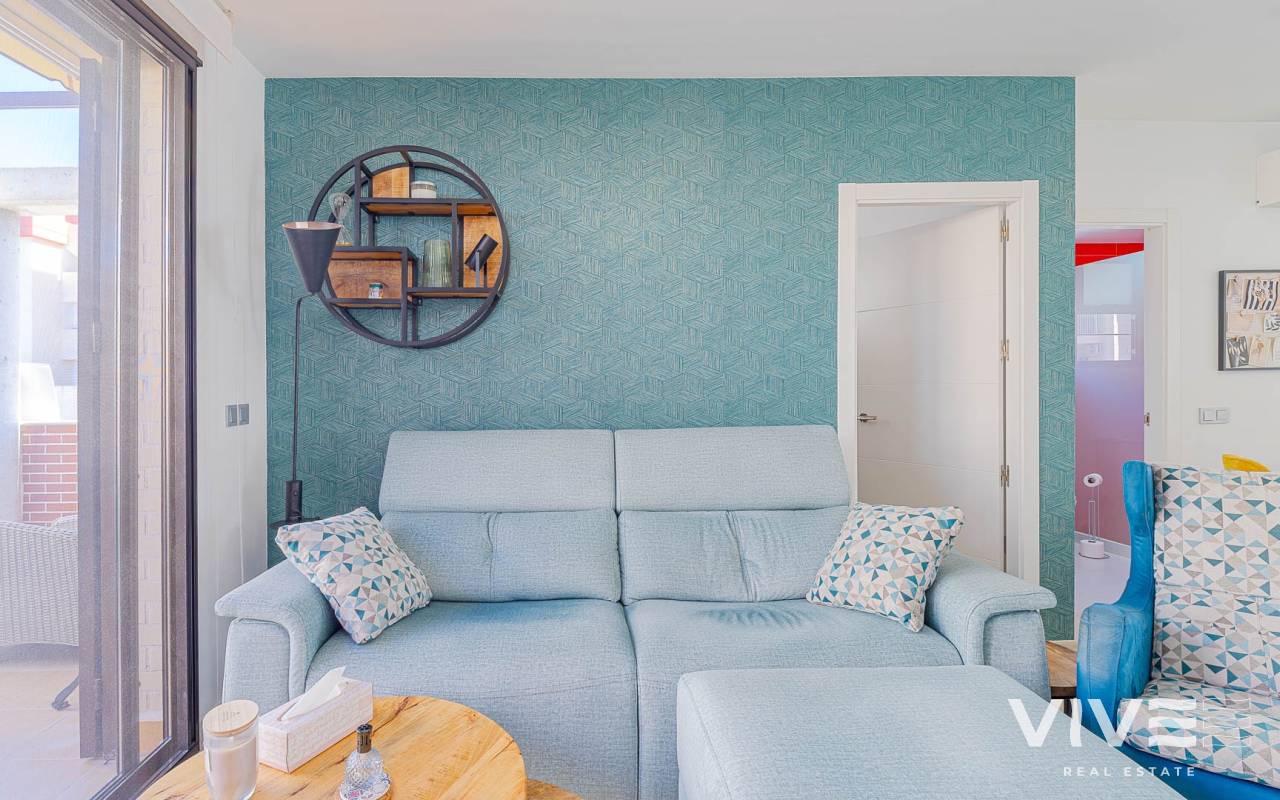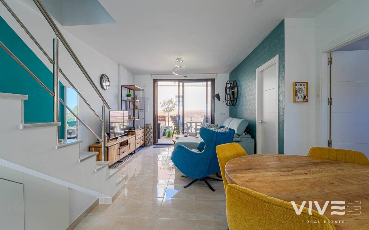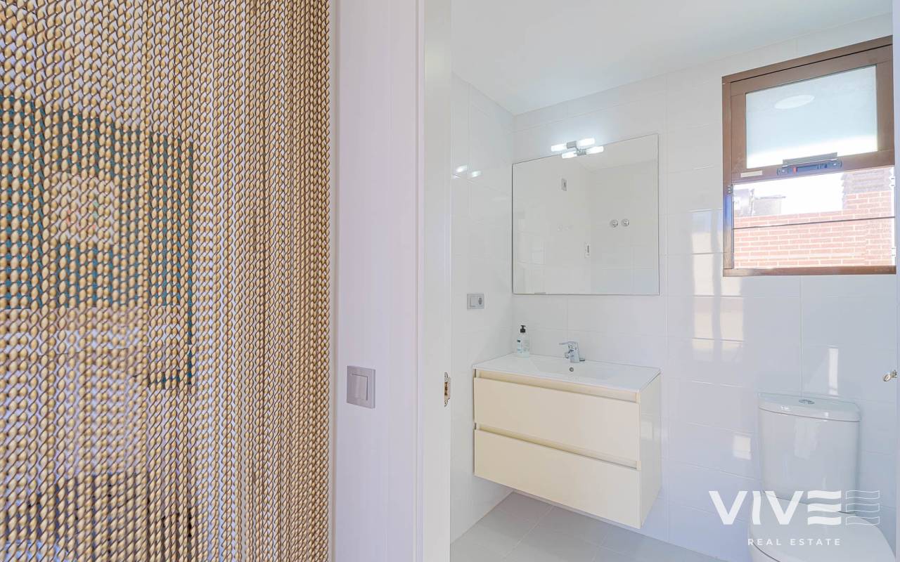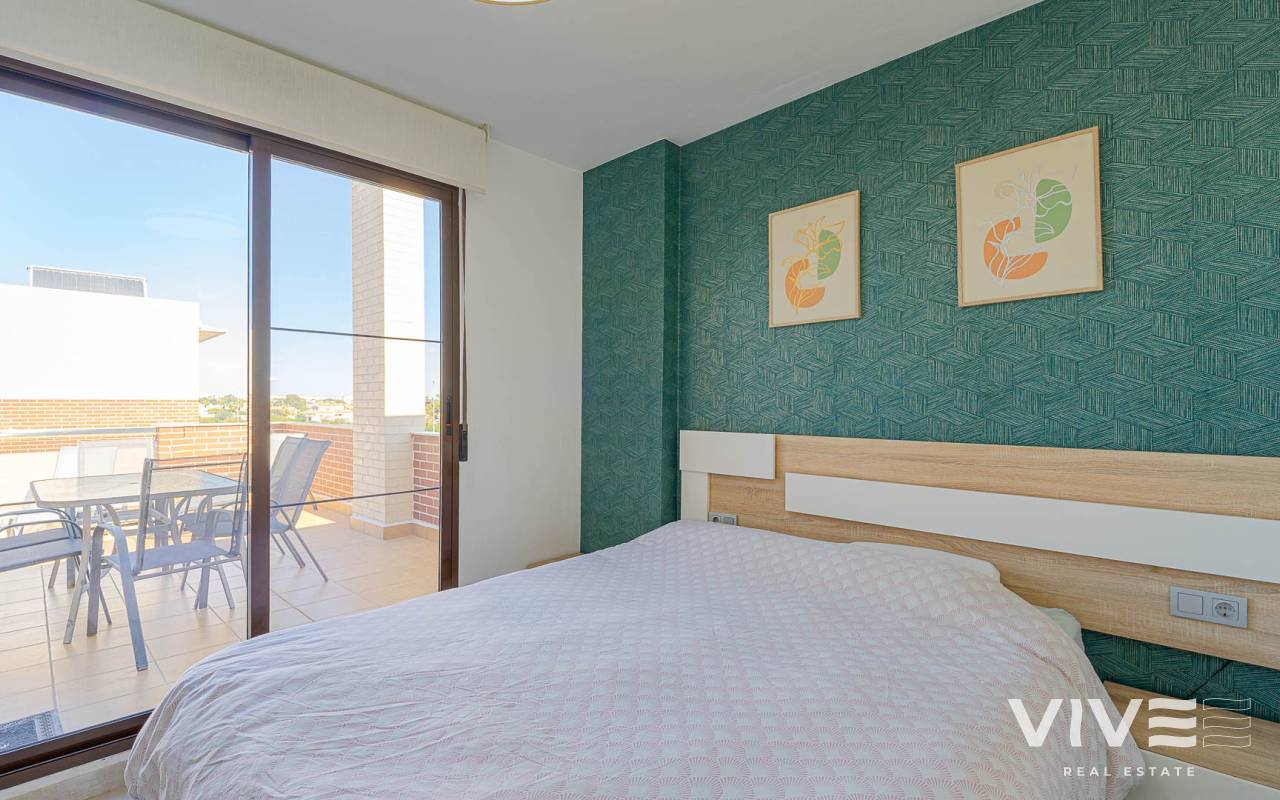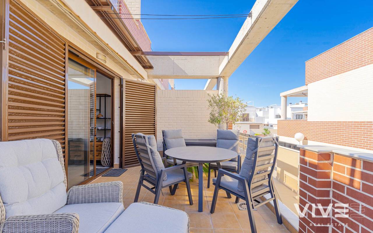 Presentamos este moderno dúplex en venta en Lomas de Cabo Roig, Orihuela Costa (Costa Blanca Sur) — una excelente opción tanto para residencia habitual como para vivienda vacacional o inversión para alquiler. La vivienda cuenta con 81,50 m² construidos más aprox. 50 m² de terrazas, incluyendo una amplia terraza principal y un solárium privado. Situada en la segunda y última planta de un residencial moderno construido en 2015, es considerada una de las mejores ubicaciones dentro del complejo ,es considerada una de las mejores ubicaciones dentro del complejo por su orientación soleada y vistas abiertas. Distribución y Características Planta principal: Luminoso salón-comedor con acceso directo a una amplia terraza (sol de mañana y tarde)Cocina totalmente equipada2 dormitorios1 baño con duchaSistema de alarmaMosquiteras en todas las ventanas Planta superior: Amplio dormitorio principal tipo suite con armarios empotradosSegundo baño con duchaAcceso directo a un solárium privado con sol todo el día y vistas abiertas. El solárium es un espacio ideal para zona chill-out, barbacoa o disfrutar del clima mediterráneo con total privacidad. Zonas Comunes del Residencial Gran piscina comunitariaGimnasioSaunaJacuzziZona spaPlaza de garaje subterránea incluida Ubicación – Cabo Roig, Orihuela Costa Ubicado en una de las zonas más demandadas de la Costa Blanca Sur: A 550 metros de un moderno centro comercial con restaurantes, supermercado y rooftop lounge barMuy cerca de La Zenia BoulevardPlayas de Cabo Roig y Campoamor a unos 15 minutos en bicicletaVarios campos de golf a pocos minutos en cocheTodos los servicios diarios a poca distancia