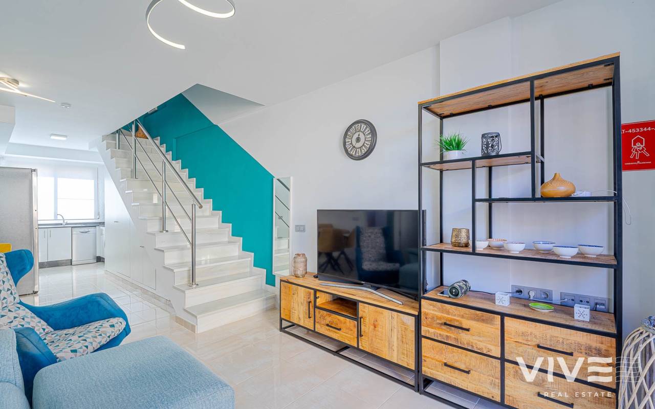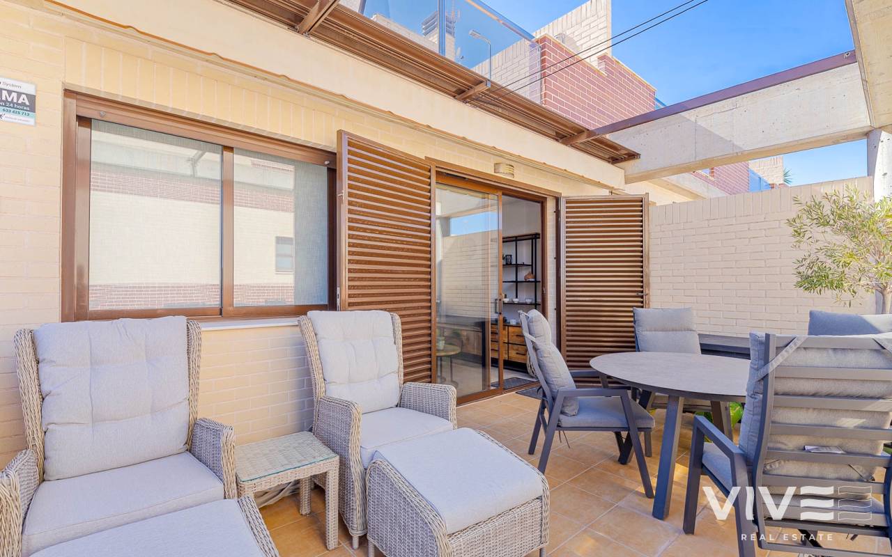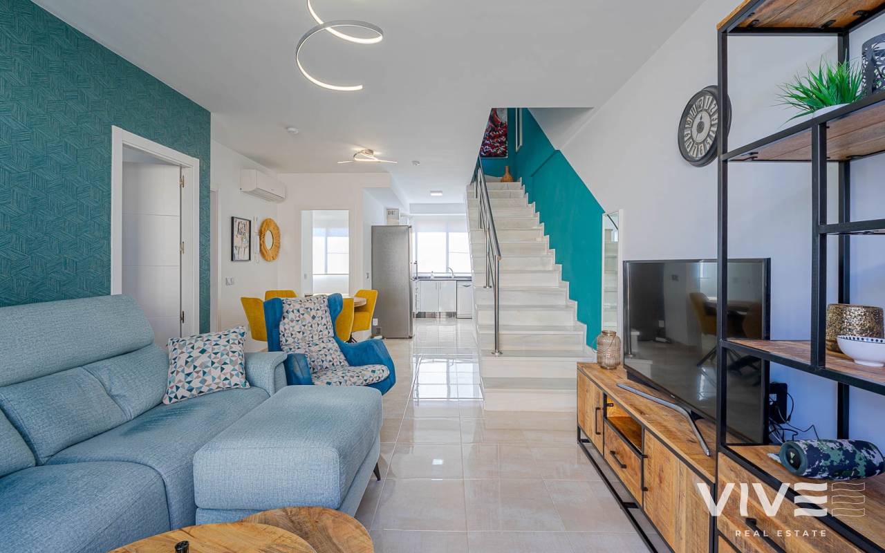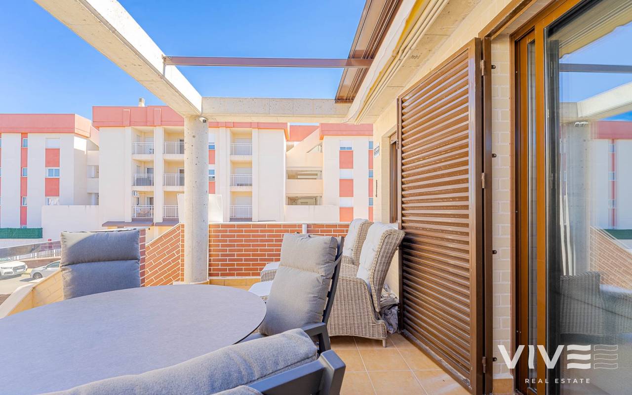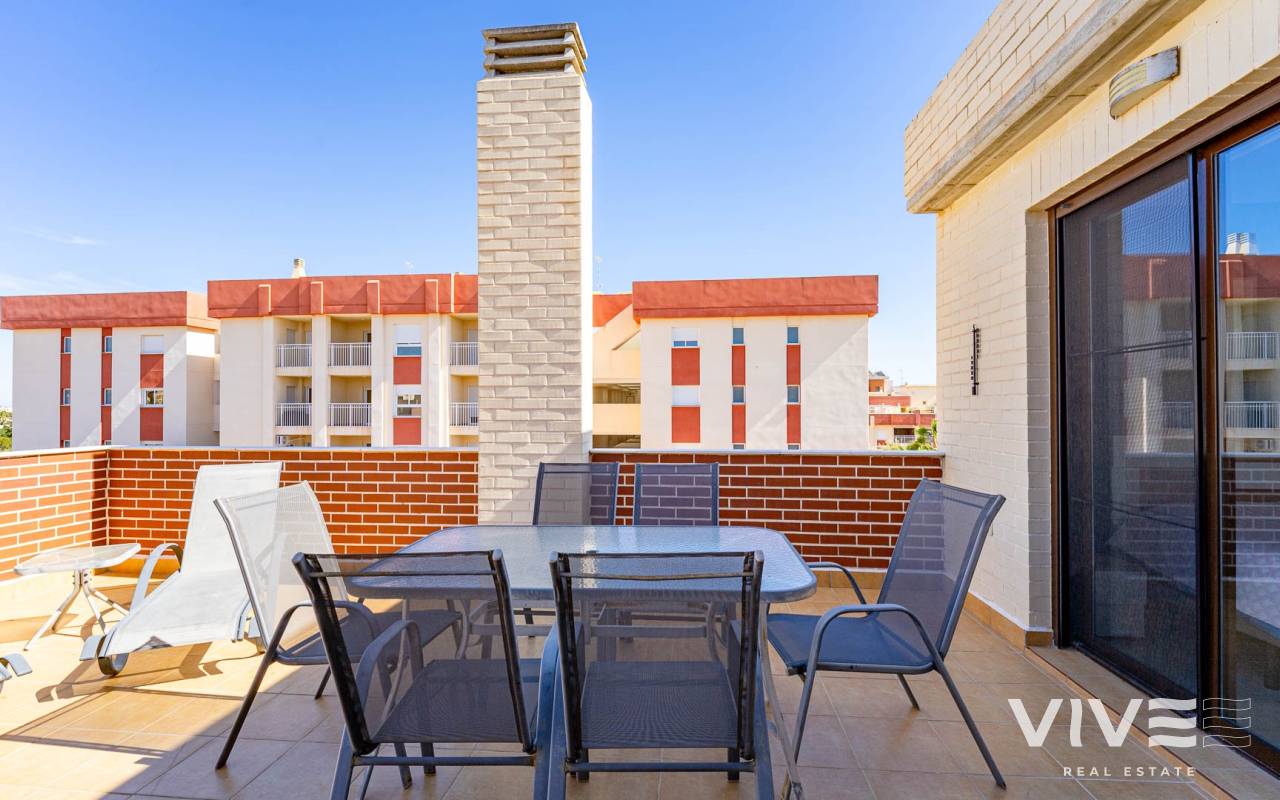 Presentamos este moderno dúplex en venta en Lomas de Cabo Roig, Orihuela Costa (Costa Blanca Sur) — una excelente opción tanto para residencia habitual como para vivienda vacacional o inversión para alquiler. La vivienda cuenta con 81,50 m² construidos más aprox. 50 m² de terrazas, incluyendo una amplia terraza principal y un solárium privado. Situada en la segunda y última planta de un residencial moderno construido en 2015, es considerada una de las mejores ubicaciones dentro del complejo ,es considerada una de las mejores ubicaciones dentro del complejo por su orientación soleada y vistas abiertas. Distribución y Características Planta principal: Luminoso salón-comedor con acceso directo a una amplia terraza (sol de mañana y tarde)Cocina totalmente equipada2 dormitorios1 baño con duchaSistema de alarmaMosquiteras en todas las ventanas Planta superior: Amplio dormitorio principal tipo suite con armarios empotradosSegundo baño con duchaAcceso directo a un solárium privado con sol todo el día y vistas abiertas. El solárium es un espacio ideal para zona chill-out, barbacoa o disfrutar del clima mediterráneo con total privacidad. Zonas Comunes del Residencial Gran piscina comunitariaGimnasioSaunaJacuzziZona spaPlaza de garaje subterránea incluida Ubicación – Cabo Roig, Orihuela Costa Ubicado en una de las zonas más demandadas de la Costa Blanca Sur: A 550 metros de un moderno centro comercial con restaurantes, supermercado y rooftop lounge barMuy cerca de La Zenia BoulevardPlayas de Cabo Roig y Campoamor a unos 15 minutos en bicicletaVarios campos de golf a pocos minutos en cocheTodos los servicios diarios a poca distancia