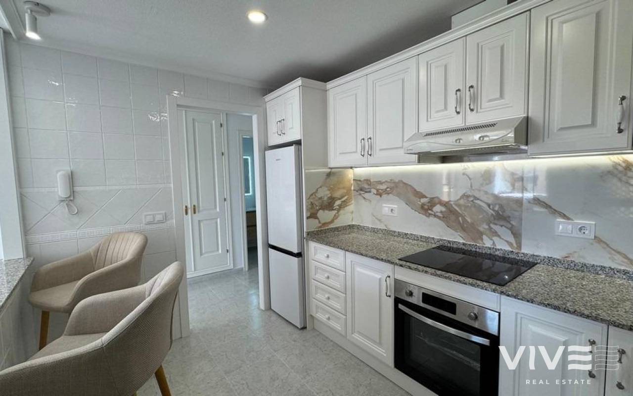 Este excepcional apartamento ubicado en la prestigiosa zona de Lomas de Campoamor ofrece un estilo contemporáneo y comodidad inigualable. Con una superficie construida de 83 m2, esta unidad situada en planta baja elevada cuenta con orientación sur, garantizando vistas despejadas que iluminarán su hogar durante todo el día. La propiedad ha sido completamente reformada e incluye dos amplios dormitorios y dos baños equipados, uno de ellos con ducha a ras del suelo para mayor confort. Su interior destaca por mobiliario de diseño moderno y materiales como piedra natural y baldosas porcelánicas grandes que aportan elegancia al espacio. Aire acondicionado inverter, instalado en todas las estancias, calefacción central a gas así como caldera doble asegurando bienestar climático tanto frío como calor. Aproveche las instalaciones comunitarias que incluyen una piscina bien mantenida rodeada por zonas verdes ajardinadas; además está estratégicamente localizado cerca campos golfísticos. Sin patios interiores ni ruidos molestos gracias a su buen aislamiento acústico. Hogar ideal preparado para disfrutarlo desde el primer momento.~~El precio de venta no incluye el impuesto (ITP- tipo vigente según comunidad autónoma)