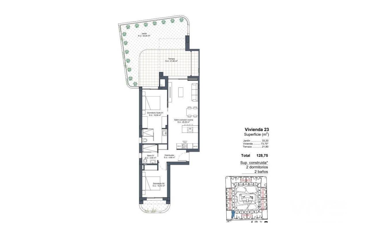 Exclusivas Viviendas de Obra Nueva en Lo Marabú, Ciudad Quesada Diseño Moderno y Máximo Confort en un Entorno Mediterráneo Descubra este espectacular complejo residencial en Lo Marabú, Ciudad Quesada, compuesto por 80 viviendas de 2 y 3 dormitorios con 2 baños. Diseñadas con un enfoque moderno y eficiente, estas propiedades ofrecen amplias terrazas, ventilación cruzada y acabados de alta calidad para maximizar el confort y la eficiencia energética. Las viviendas en planta baja cuentan con jardines privados, mientras que las de la planta alta disponen de soláriums privados con preinstalación para jacuzzi y ducha exterior. Además, el residencial dispone de piscinas comunitarias rodeadas de jardines, creando un ambiente perfecto para el relax y la convivencia. Características de Alta Calidad para un Estilo de Vida Exclusivo Cada vivienda ha sido diseñada para ofrecer el máximo confort, con materiales de primera calidad y un diseño contemporáneo: Amplios ventanales correderos de aluminio con rotura de puente térmico. Persianas motorizadas para mayor comodidad. Cristales Climalit 4+4/14/4+4 para aislamiento térmico y acústico. Puerta de entrada acorazada con cerradura de seguridad. Cocinas totalmente amuebladas con electrodomésticos incluidos. Baños con muebles, espejos y mamparas de ducha. Sistema de aerotermia de 150L para agua caliente. Instalación completa de aire acondicionado por conductos (frío/calor). Iluminación en todas las estancias ya incorporada. Plaza de parking incluida. Gracias a su diseño pasante de doble fachada, las viviendas ofrecen ventilación natural cruzada, proporcionando frescor en verano y reduciendo el consumo energético en climatización. Ubicación Privilegiada en Ciudad Quesada Lo Marabú es una exclusiva zona residencial dentro de Ciudad Quesada (Rojales), rodeada de espacios naturales y con todos los servicios a su alcance. La urbanización se encuentra muy cerca de las Lagunas Saladas de La Mata y Torrevieja, un entorno ideal para disfrutar de la naturaleza y mejorar el bienestar. Desde su nueva vivienda, tendrá acceso rápido a los principales puntos de interés de la zona: Playas de Guardamar del Segura y Torrevieja – 10 km (15 minutos en coche). Aeropuerto de Alicante-Elche (ALC) – 38 km (35 minutos en coche). Aeropuerto de Murcia-Corvera (RMU) – 65 km (50 minutos en coche). Campos de golf de prestigio – A menos de 5 km. Centros comerciales y restaurantes – A pocos minutos. Acceso rápido a las carreteras AP-7 y N-332, conectando con toda la Costa Blanca. Un Hogar Perfecto para Disfrutar del Mediterráneo Con su combinación de diseño moderno, ubicación estratégica y entorno natural excepcional, estas viviendas en Lo Marabú son ideales tanto para residencia permanente, casa de vacaciones o inversión inmobiliaria. No pierda esta oportunidad única. Contáctenos hoy mismo para más información o para concertar una visita a su futura vivienda en Ciudad Quesada.