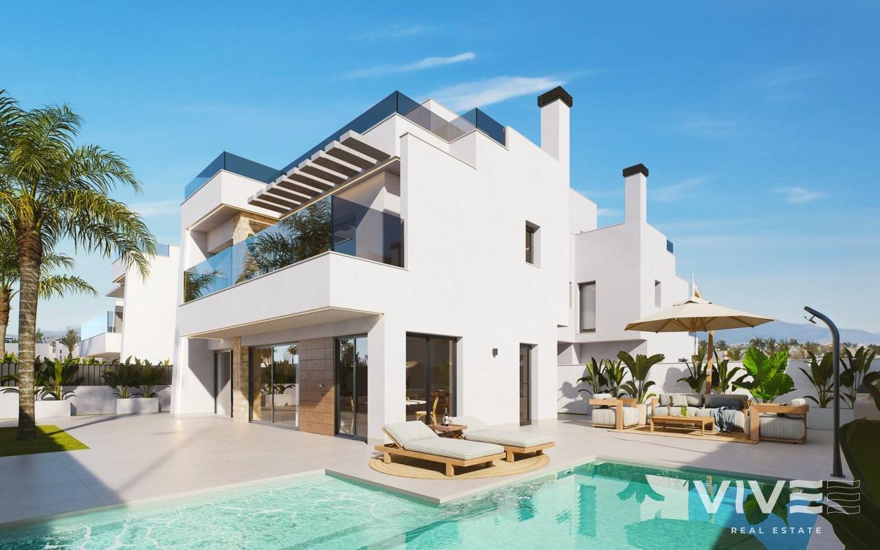 Modernas villas adosadas en Santa Rosalía Lake and Life Resort: un nuevo estándar de lujo mediterráneo Diseño contemporáneo inspirado en el Mediterráneo Descubra estas exclusivas villas adosadas situadas en el prestigioso Santa Rosalía Lake and Life Resort, un destino residencial único en la Costa Cálida. Inspiradas en la arquitectura mediterránea, estas villas combinan líneas limpias, luz natural y comodidad moderna para crear un entorno armonioso y elegante. Cada villa está diseñada para ofrecer un equilibrio perfecto entre lujo y relajación, lo que la hace ideal como residencia permanente, casa de vacaciones u oportunidad de inversión. Distribución espaciosa y acabados de alta gama Cada villa ofrece 220 m² de superficie habitable distribuidos en un sótano, dos plantas principales y un solárium en la azotea, situados en generosas parcelas de 295 m². Las viviendas cuentan con 4 dormitorios y 4 baños (3 en suite), lo que proporciona un amplio espacio para la familia y los invitados. La piscina privada con zona de jacuzzi, las amplias terrazas y el solárium en la azotea con cocina de verano y aseo invitan a disfrutar del excepcional clima de la región durante todo el año. Las especificaciones premium incluyen: Cocina totalmente equipada con electrodomésticos Bosch Baños con muebles, espejos, mamparas de ducha y calentadores de toallas Puerta de entrada blindada y puerta de acceso motorizada para vehículos Focos LED en todo el interior y el exterior Aire acondicionado por conductos (instalado en ambas plantas) Piscina privada con zona de jacuzzi 2 paneles solares fotovoltaicos para la eficiencia energética Cocina de verano en el jardín Planta subterránea con patio inglés para la luz natural y la ventilación Vida estilo resort en Santa Rosalía Santa Rosalía Lake and Life Resort es una comunidad privada y cerrada con seguridad las 24 horas, diseñada en torno a unas impresionantes 126 000 m² de zonas verdes. Los residentes disfrutan de senderos para caminar y montar en bicicleta, instalaciones deportivas, pistas de pádel y tenis, minigolf, jardines, parques para perros y zonas de ocio. La casa club y la pieza central del complejo, una impresionante laguna cristalina de 17 000 m² rodeada de playas de arena blanca y palmeras, ofrecen un auténtico estilo de vida inspirado en el Caribe. La laguna cuenta incluso con dos islas, una de ellas con su propio bar, y varios chiringuitos en la playa para comer de forma relajada. Ubicación privilegiada en la Costa Cálida La promoción goza de una ubicación céntrica dentro del complejo, cerca de la laguna y del club de playa. Se encuentra a menos de 4 km de la playa de Los Alcázares, a 15 minutos de Cartagena y a solo 22 km del aeropuerto internacional de Murcia. Los amantes del golf encontrarán varios campos de primera categoría a poca distancia en coche, mientras que los puertos deportivos, restaurantes y zonas comerciales locales completan la vibrante oferta de estilo de vida. Su exclusivo refugio mediterráneo le espera Experimente la combinación perfecta de lujo, comodidad y bienestar en el corazón de la Costa Cálida. Póngase en contacto con nosotros hoy mismo para concertar una visita y descubrir la villa de sus sueños en Santa Rosalía Lake and Life Resort.