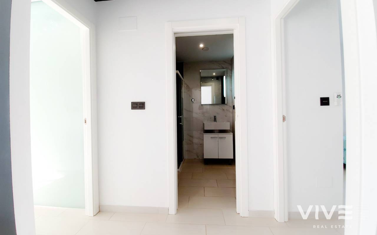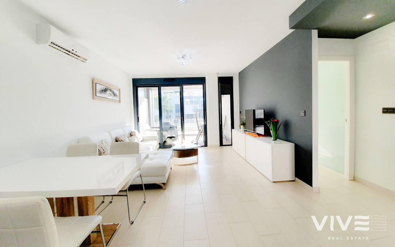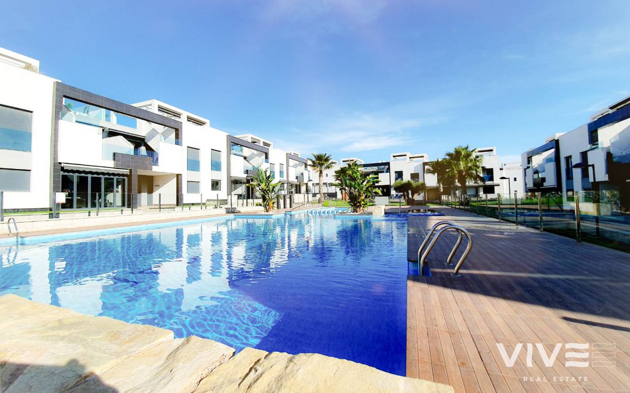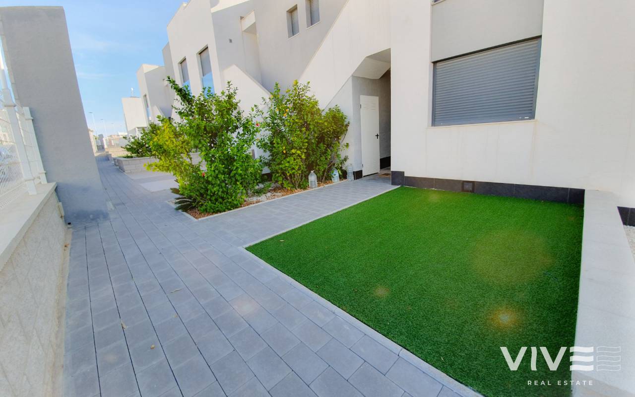Bungalow en planta baja con un pequeño jardin, terraza acristalada con salida a la piscina, dos dormitorios con armarios empotrados, dos baños completos, unpo de ellos en suite, cocina americana totalmente equipada, salon comedor con salida a la terraza. Residencial con piscina, jacuzzi, zonas ajardinadas, parque infantil y parking. Esta situado en la zona de Los Altos ( Torrevieja), al lado de todo tipo de servicios, hospital, colegios, etc y cerca de la playa de Punta Prima.