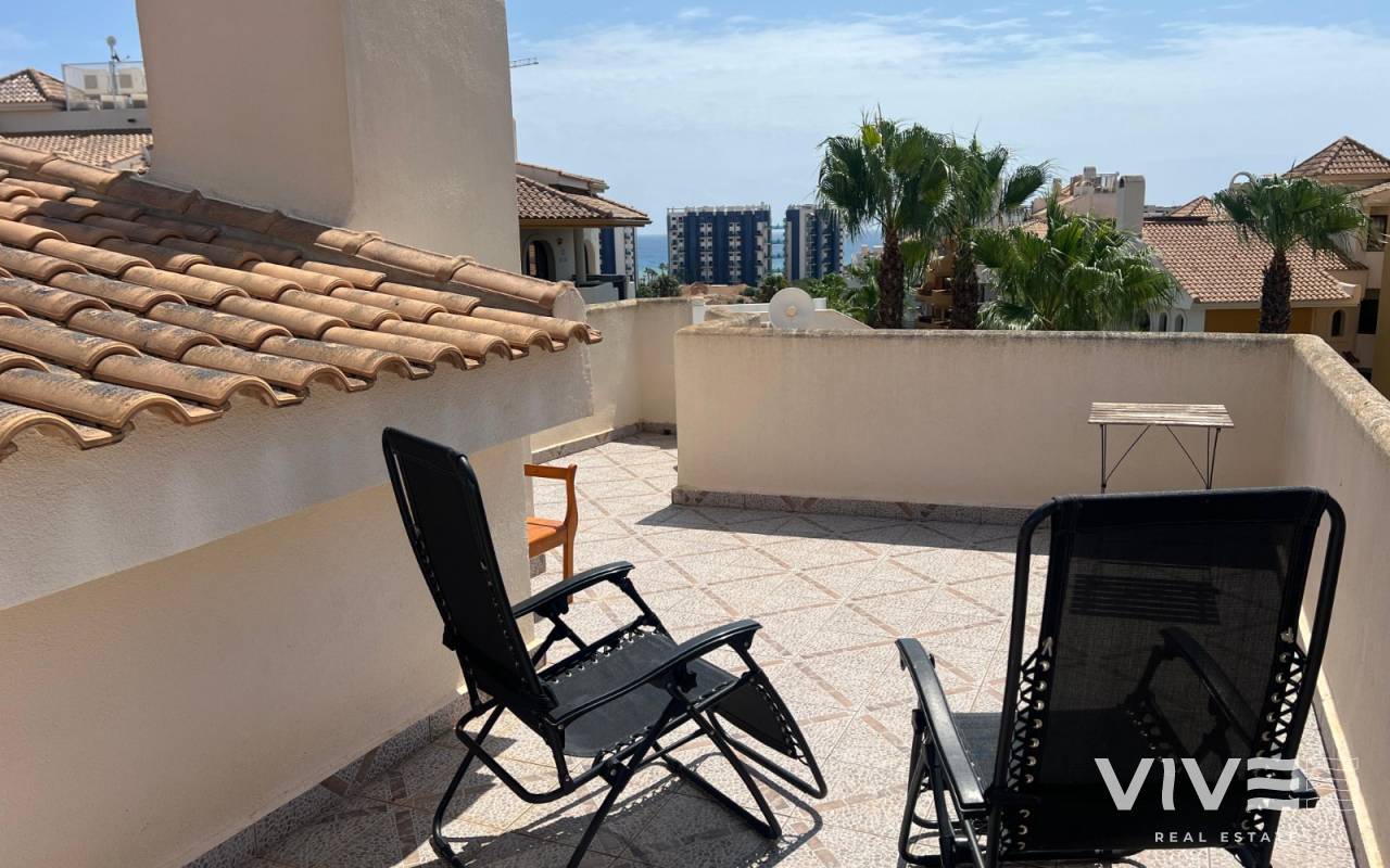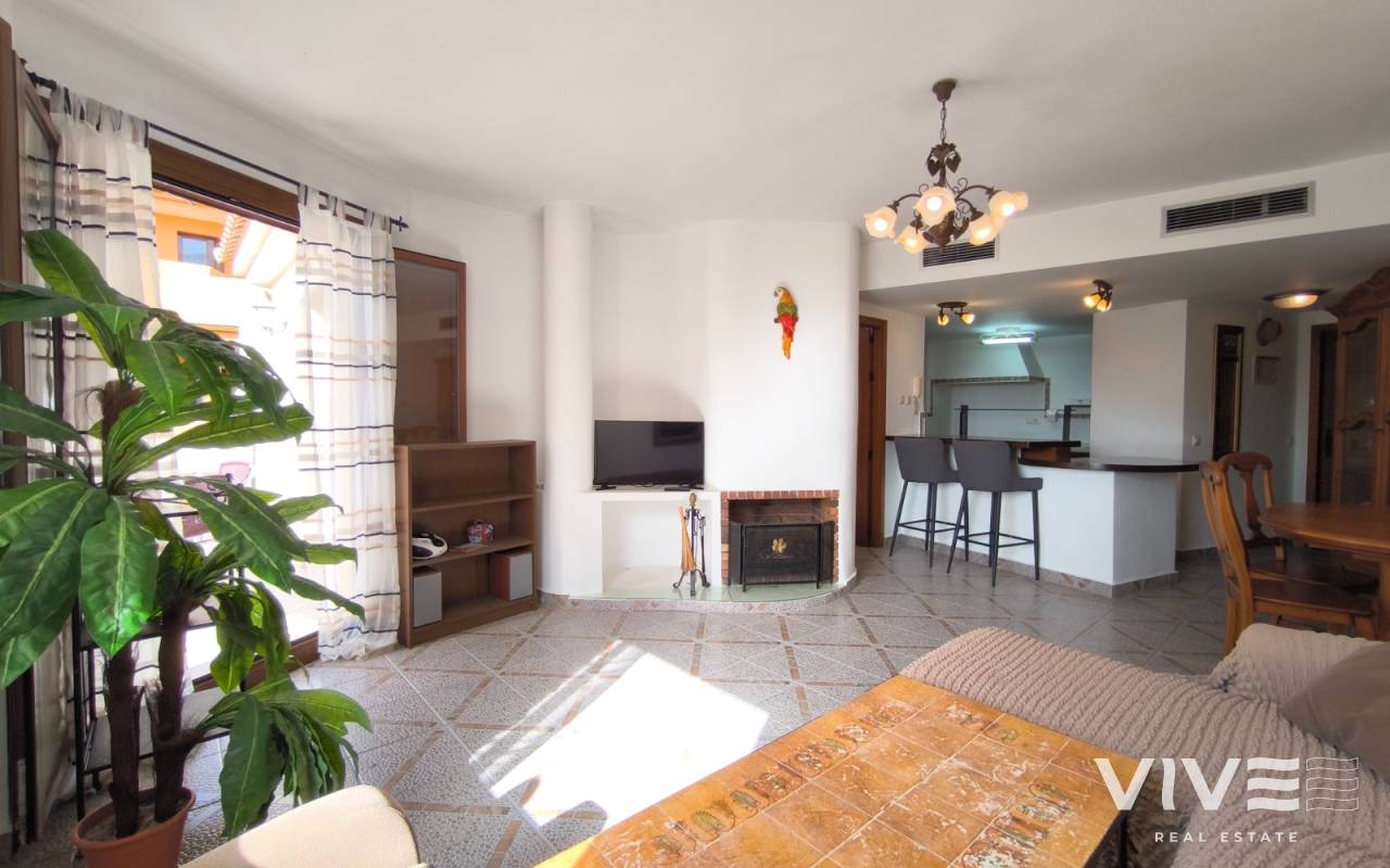 La vivienda se distribuye en 1 dormitorio, 1 baño completo, cocina americana, y un luminoso salón con chimenea que da acceso a una terraza con vistas despejadas ( también se puede acceder a la terraza desde el dormitorio). Desde la terraza, una escalera conduce al solárium privado, un espacio perfecto para relajarse o disfrutar de las vistas al mar, al jardín comunitario con palmeras y a la piscina.