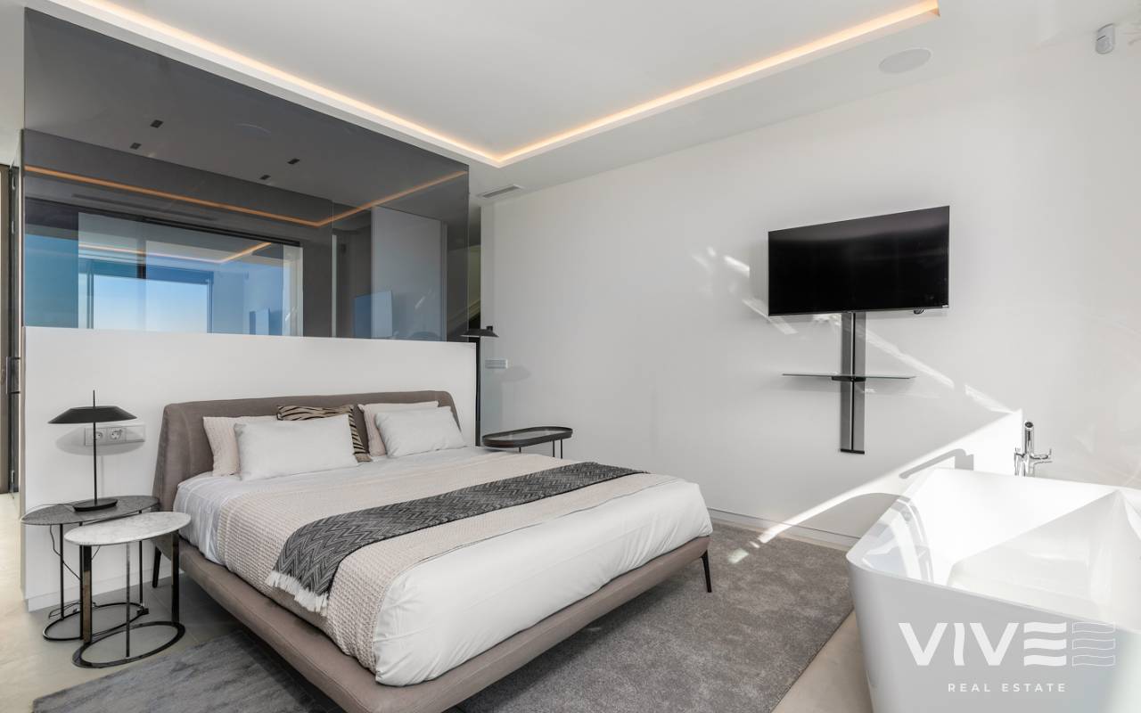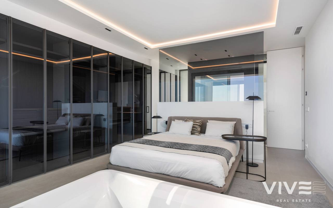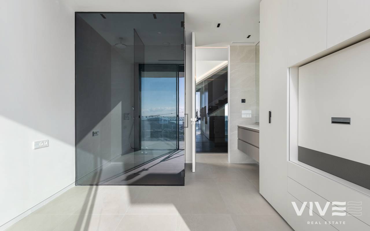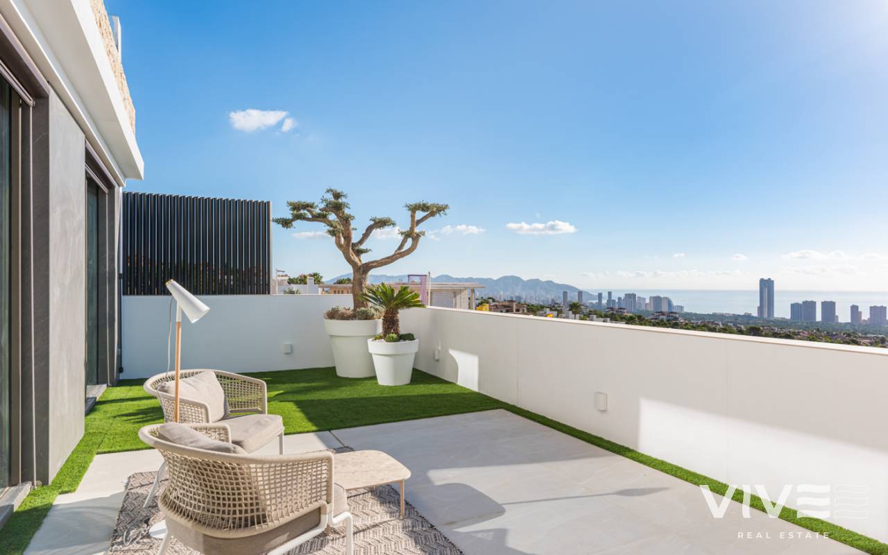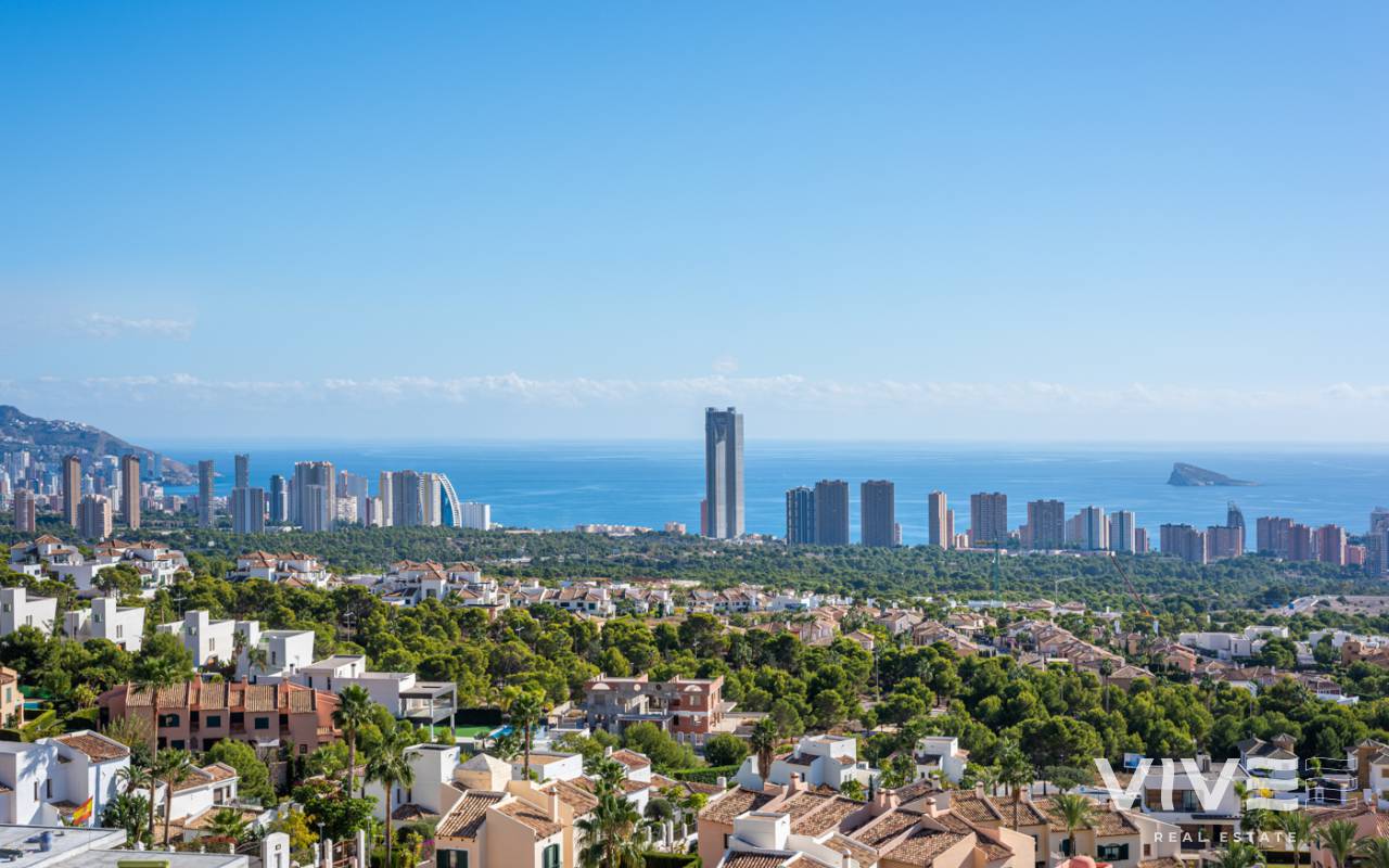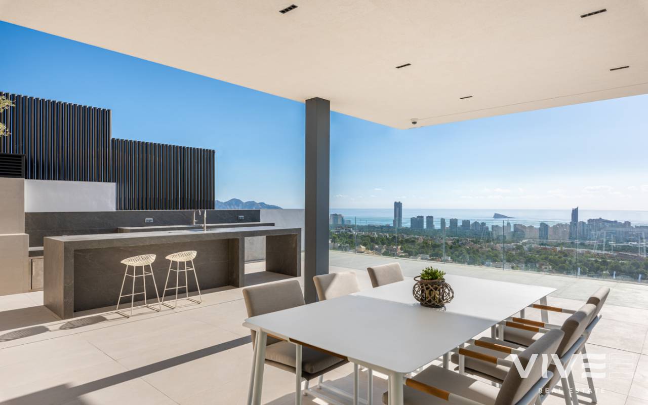 Nueva promoción de 5 villas exclusivas e independientes, de auténtico lujo en la mejor zona de Sierra Cortina. Dada su ubicación en la cima de la montaña le permitirá disfrutar de las mejores vistas a toda la bahía de Benidorm. La planta baja totalmente acristalada cuenta con un amplio espacio de salón-comedor, cocina, lavadero, aseo cortesía y a través de sus enormes ventanales, se consigue una perfecta integración con el exterior, donde una gran terraza, porche, jardín, barbacoa y una maravillosa piscina estilo infinity, le permitirá relajarse y contemplar un paisaje de ensueño. En la planta primera hay 3 dormitorios, todos ellos disponen de baño en suite y armarios hechos a medida totalmente equipados. Las tres habitaciones tienen salida a terrazas con preciosas vistas al mar. En planta superior nos encontramos con una estupenda terraza-solárium de 160m2 con posibilidad de alojar un magnífico jacuzzi, zona relax y dónde podrá disfrutar de momentos inolvidables. Existen además 2 plantas por debajo de la planta baja. Una de ellas, se puede utilizar como casa de invitados. Esta planta también cuenta con una terraza con espectaculares vistas. Y por último una planta situada a nivel de calle desde donde se accede a la vivienda, y con espacio suficiente hasta para 4 vehículos. Para un máximo confort todas las plantas se comunican a través de un ascensor. Se trata de unas villas exclusivas por sus vistas, ubicación, orientación sur –este, con las mejores calidades del mercado, y equipadas con mobiliario de diseño en cocina y baños, electrodomésticos e iluminación led en el exterior. Situadas en el municipio de Finestrat, a 10 minutos de Benidorm, ubicado en el corazón de la Costa Blanca y rodeado de importantes localidades como Alicante, Benidorm, Elche, Altea o Calpe. Además dispone de una fácil conexión por autopista al Aeropuerto Internacional de Elche-Alicante, que le permitirá en 30 minutos acceder a vuelos a todas las grandes capitales europeas. Finestrat es un pintoresco municipio costero y al mismo tiempo montañoso que combina el silencio de la naturaleza rocosa y verde de las elevadas cumbres del Puig Campana, con la atracción cosmopolita de su Cala, cuya playa de arena dorada y aguas cristalinas es un tesoro rodeado de zonas residenciales.