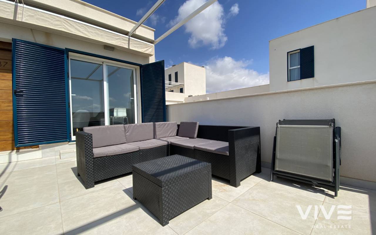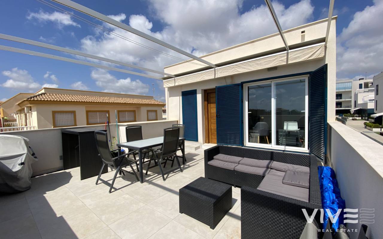 Słoneczny penthouse z tarasem na piętrze ze wspaniałym widokiem na basen i morze, w dzielnicy mieszkalnej Turquesa de Mar, położony w Playa Flamenca, ze wspaniałym basenem dla dzieci i dorosłych, dodatkowo osiedle oferuje mały plac zabaw dla dzieci.