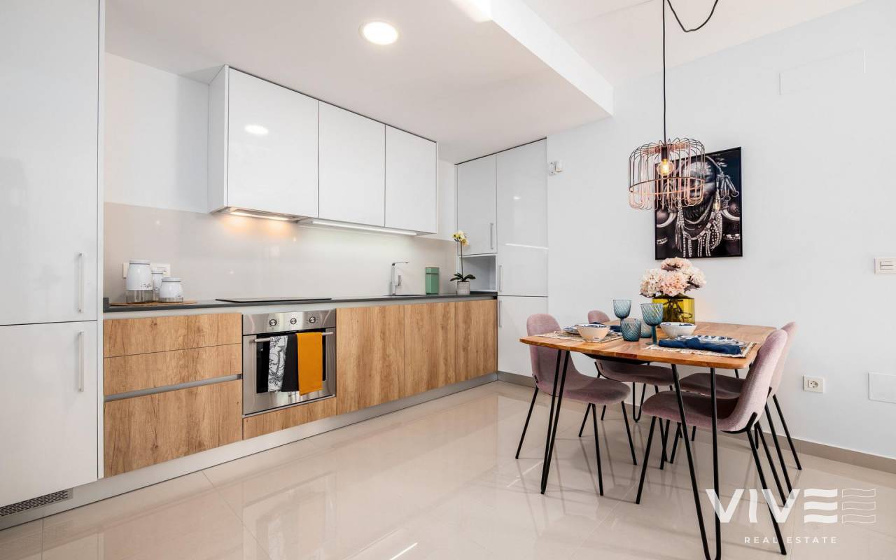 NEW BUILD RESIDENTIAL IN LA FINCA GOLF New Build residential complex of bungalow apartments and townhouses in La Finca golf. Modern bungalows has 2 bedrooms, 2 bathrooms, open plan kitchen integrated with the living area connecting the bedrooms, bathrooms and terrace. Ground floor bungalows has terraces and gardens, top floor bungalows has terraces and solariums on the upper floor. Its south orientation provides natural lighting at any time of the year and natural heating from dawn to sunset, which reduces energy consumption. The opened concept properties with windows and sliding doors that allows cross ventilation and lets the light in. The properties are situated so, that the light can enter everywhere, but at the same time it offers some fresh and cozy corners. New development takes place on an incredible plot where homes have been implemented with a careful design and large spaces to achieve maximum comfort. Its design focuses on the comfort and well-being of its residents and combines contemporary style and Mediterranean character, inheriting traditional morphology with the use of stones on the façade and canopies. Kitchens will be delivered fully furnished with a current design of high-capacity high and low furniture. The base units are in white matte lacquered laminate and the upper units in melamine wood with texture on the columns. Semi-hidden handle profile with gola* system. Countertop in work area and peninsula Quarz Compac Blanco Luna or similar. Armoured main door with white lacquered finish on the interior leaf and brown texture on the exterior. Optical peephole and security lock. White lacquered interior doors, with a three-strip front and rectangular stainless steel handlers. Built-in wardrobes with white sliding doors. Windows and sliding doors in brown aluminium carpentry with a textured finish. Tilt-and-turn windows in bathrooms, with frosted effect glass and manual blinds. Electric and motorized blinds, finished in brown textured aluminium. All blinds are connected to the home automation system and are synchronized to close and open, and can be operated from the App. Special double glazing with solar control and low emissivity, to make the most of natural light and save on energy costs. Optimal aesthetic appearance, exceptional colour and minimal reflection. Energy certification class A Properties offers a high level of energy certification. This is possible thanks to the thermal insulation of roofs and walls, the aluminium joinery with double glazing, and the installation of 5 solar panels by block The homes are equipped with electrical and telecommunications outlets required by the Low Voltage Electrotechnical Regulations. Intercom for communication between the home and the main entrance. We include an advanced home automation system to control the motorized blinds and three light points. Legrand Valena Next series mechanisms that can be connected to the home automation system. Air-conditioning pre-installation: central or split depending of the model. Fully fitted alarm system with one sensor by room, touch panel and siren. New development is located at La Finca Golf. It is placed next to the first line of golf facing the 11th fairway at La Finca Golf course, one of the most emblematic complexes in the southeast of Spain and a common refuge for golf lovers. Located just 4 minutes from Algorfa, in Costa Blanca South, this complex with indoor parking, community pool and garden areas is the perfect place for those who want to enjoy the Mediterranean lifestyle: proximity to the beach, golf and mountains, surrounded by tranquillity, but with access to all types of services and leisure areas. Few minutes away from the most beautiful beaches of the southern Costa Blanca and places of exceptional beauty such as the Laguna Rosa de Torrevieja or the Dunes of Guardamar del Segura. Its proximity and easy access to the AP-7 highway and main national roads connect complex with numerous towns on the Costa Blanca such as Orihuela, Cartagena, Elche, Murcia and Alicante. The airports of Alicante and Murcia are less than 30 minutes driving with connections to the main European capitals.