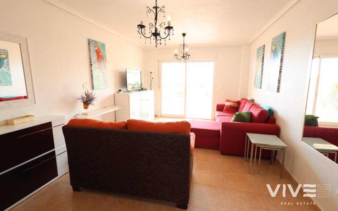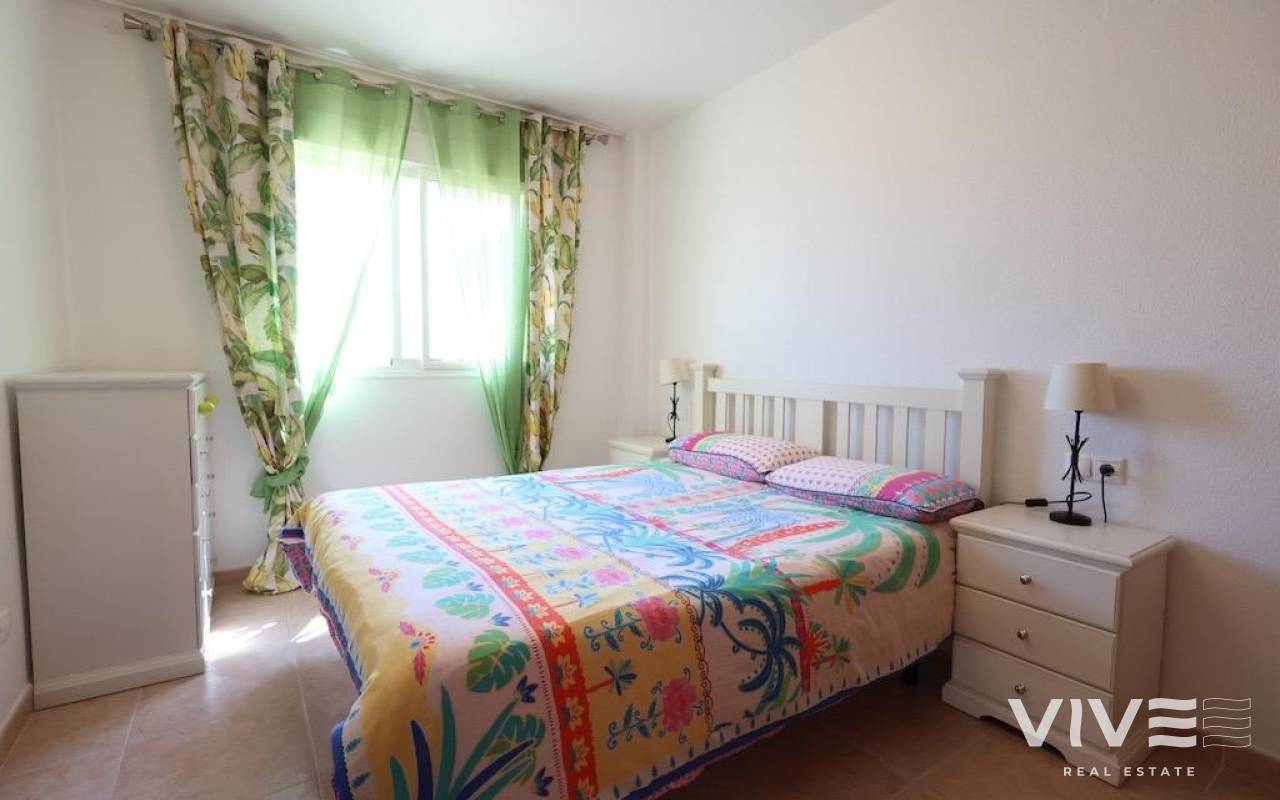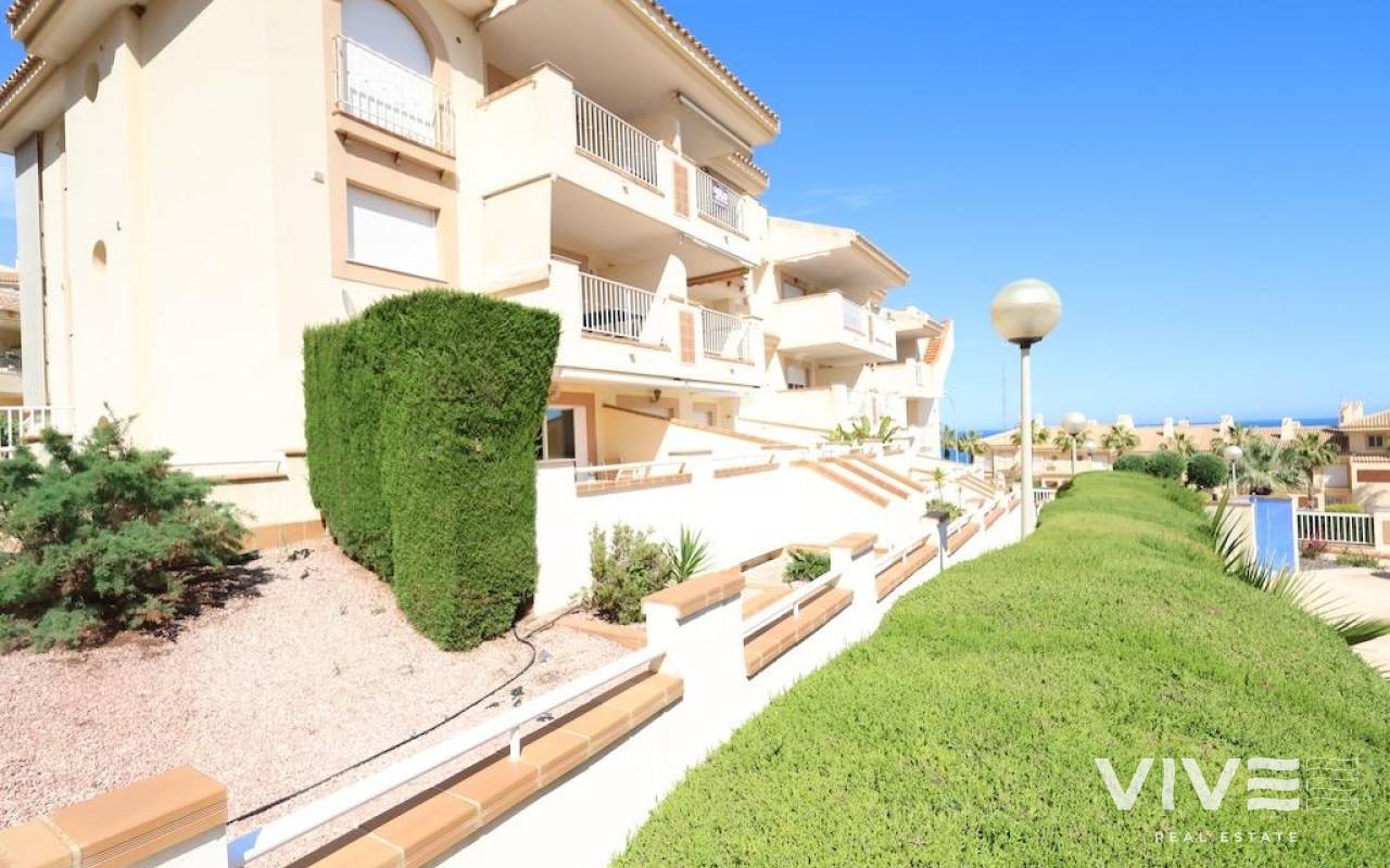 Aguamarina in Campoamor. Corner ground floor apartment , south facing with sea views and facing the communal pool with a large 20 m2 terrace, with direct access to the pool, the house has 70 m2 with 2 bedrooms and 1 bathroom, large independent kitchen with access to the covered patio, the house is sold furnished and with air conditioning and a closed garage, it is located close to all services and a few meters walk to the beach.