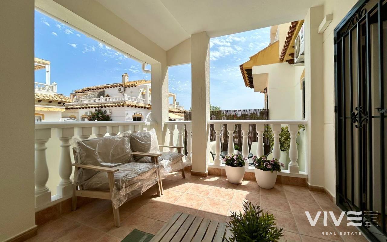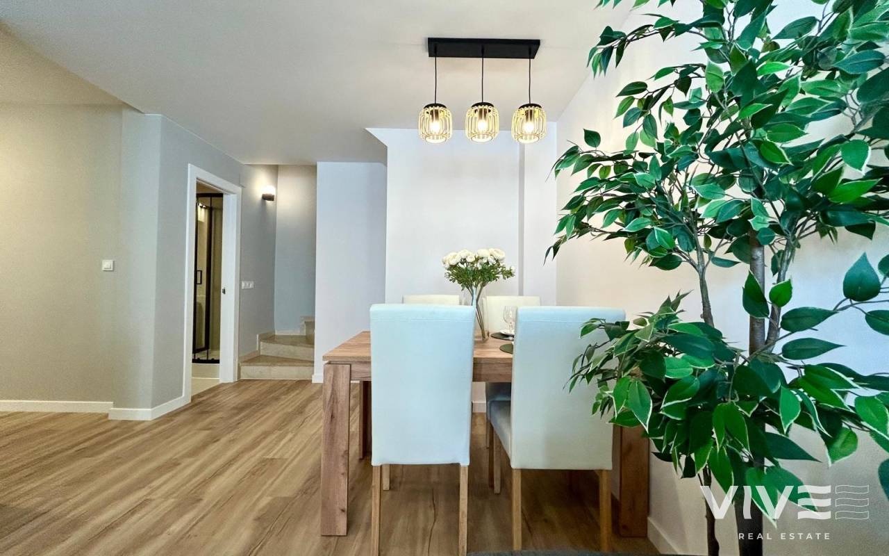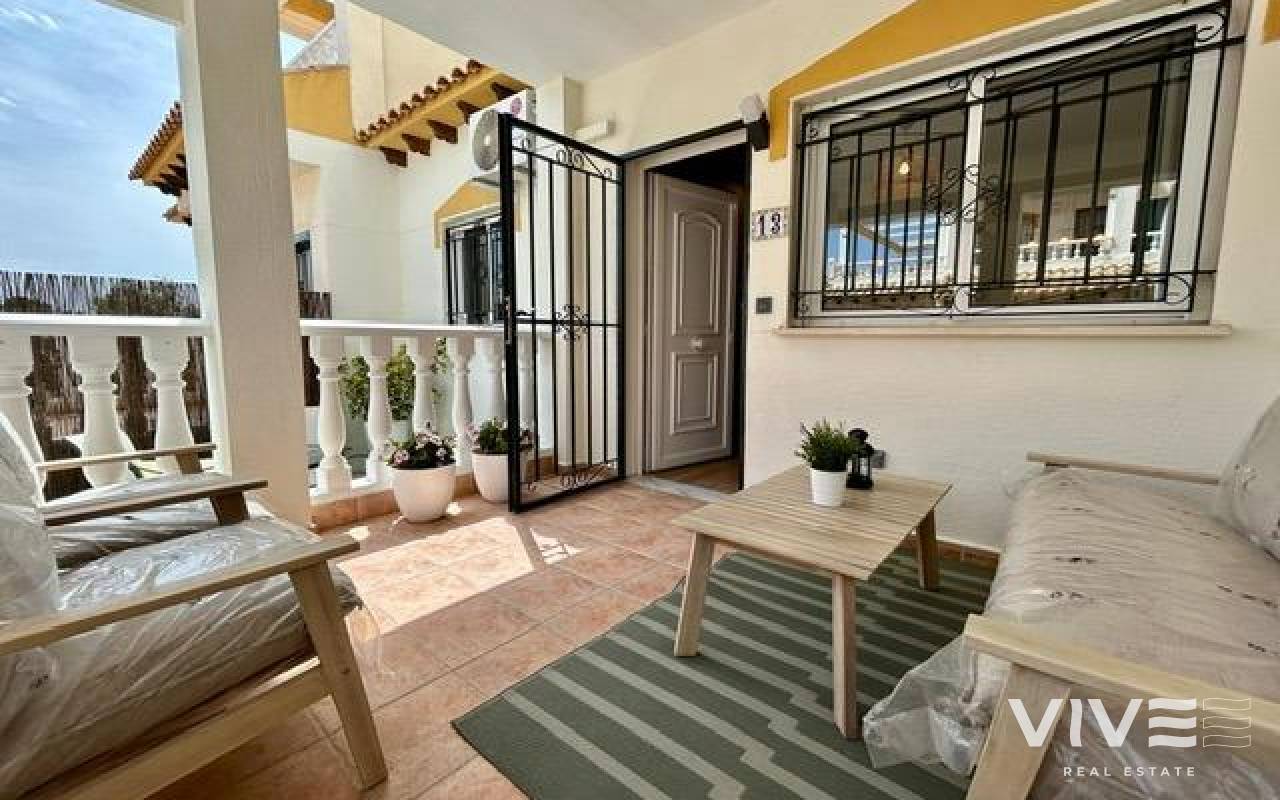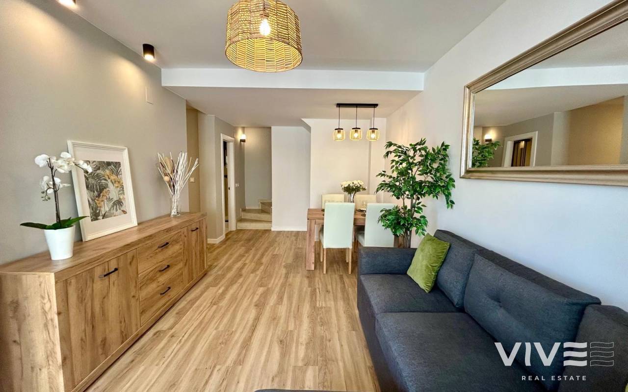 Completely renovated townhouse located in the quiet community of Los Naranjos, in Los Altos. The home has been completely renovated and is in impeccable condition, ready to move into. With a constructed area of 83 m2, it consists of three bedrooms and two full bathrooms, a living-dining room, a separate kitchen, and a covered front porch. The kitchen is equipped with all modern appliances, along with a laundry area. The home is spread over two floors and has a functional and modern design. Access to the home is via a private garden. Upstairs are two large double bedrooms, both with wardrobes, and a second full bathroom with a bathtub. The master bedroom faces south, providing natural light throughout the day. Air conditioning is installed in every room. It is being sold fully furnished, with quality furniture and everything necessary to move into (except personal belongings and decorative items). The residential complex offers a beautiful communal pool, and the home is located on a very quiet street with easy parking and a pleasant setting. The Consum supermarket and several restaurants are just 400 meters away, and the Punta Marina shopping center is a 15-minute walk away. Punta Prima Beach is 2 km away.~~The sale price does not include tax (ITP - current rate according to autonomous community)