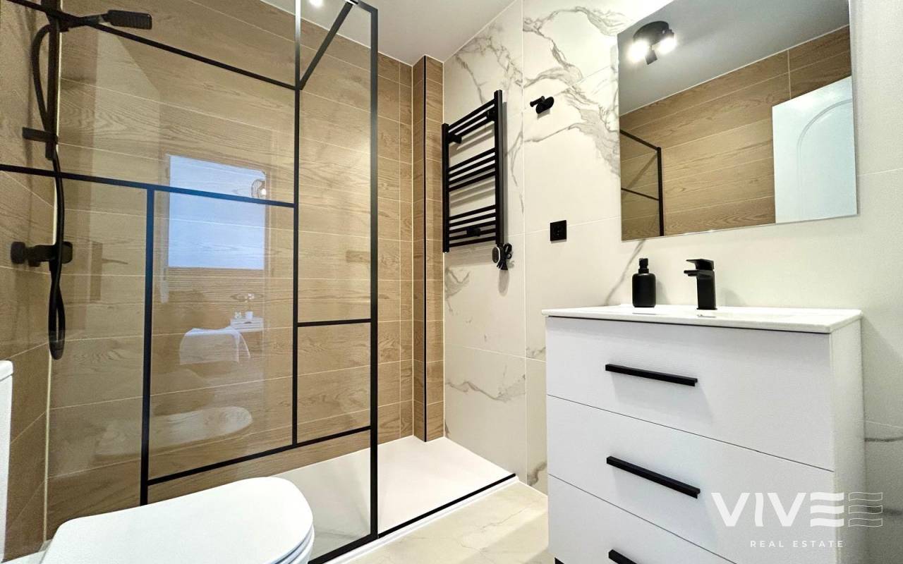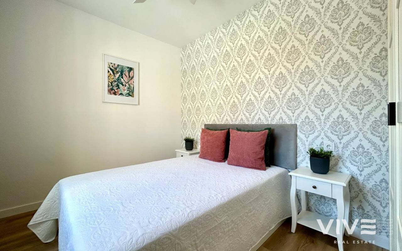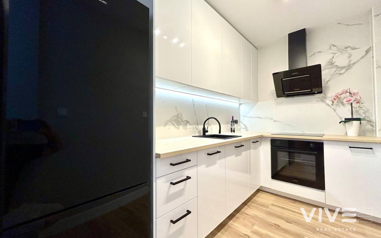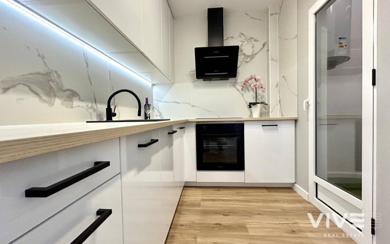 Completely renovated townhouse located in the quiet community of Los Naranjos, in Los Altos. The home has been completely renovated and is in impeccable condition, ready to move into. With a constructed area of 83 m2, it consists of three bedrooms and two full bathrooms, a living-dining room, a separate kitchen, and a covered front porch. The kitchen is equipped with all modern appliances, along with a laundry area. The home is spread over two floors and has a functional and modern design. Access to the home is via a private garden. Upstairs are two large double bedrooms, both with wardrobes, and a second full bathroom with a bathtub. The master bedroom faces south, providing natural light throughout the day. Air conditioning is installed in every room. It is being sold fully furnished, with quality furniture and everything necessary to move into (except personal belongings and decorative items). The residential complex offers a beautiful communal pool, and the home is located on a very quiet street with easy parking and a pleasant setting. The Consum supermarket and several restaurants are just 400 meters away, and the Punta Marina shopping center is a 15-minute walk away. Punta Prima Beach is 2 km away.~~The sale price does not include tax (ITP - current rate according to autonomous community)