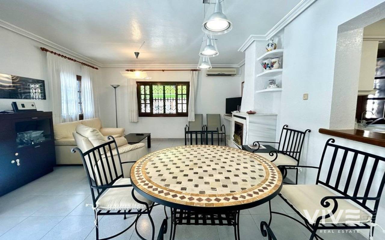 Detached chalet located in one of the most popular areas of Orihuela Costa, La Zenia, just 400m from the beach. Built on a 453m2 plot, the two-story home has approximately 150m2 of living space. On the ground floor, we find a spacious and bright living-dining room with a fireplace, a semi-independent kitchen, two double bedrooms, one bathroom, and a laundry room. There is a spacious front porch. On the first floor, there are two more bedrooms and another bathroom. From the master bedroom, there is access to the approximately 20m2 terrace. The home faces south. It has a 28m2 private saltwater pool. The basement includes a closed garage. Sold furnished. Close to all necessary services, a wide variety of bars and restaurants, it is an ideal location for year-round living or a wonderful holiday. La Zenia Beach is less than a 10-minute walk away. La Zenia Boulevard Shopping Center is a 5-minute drive away.
