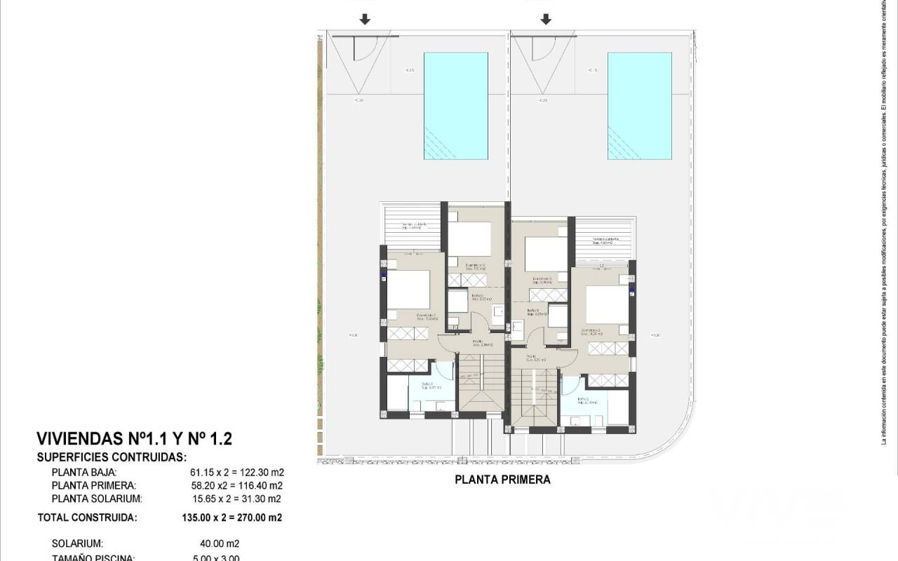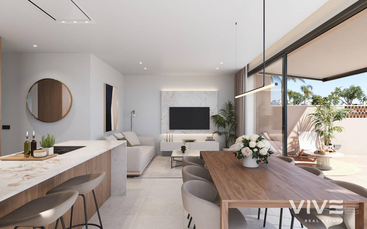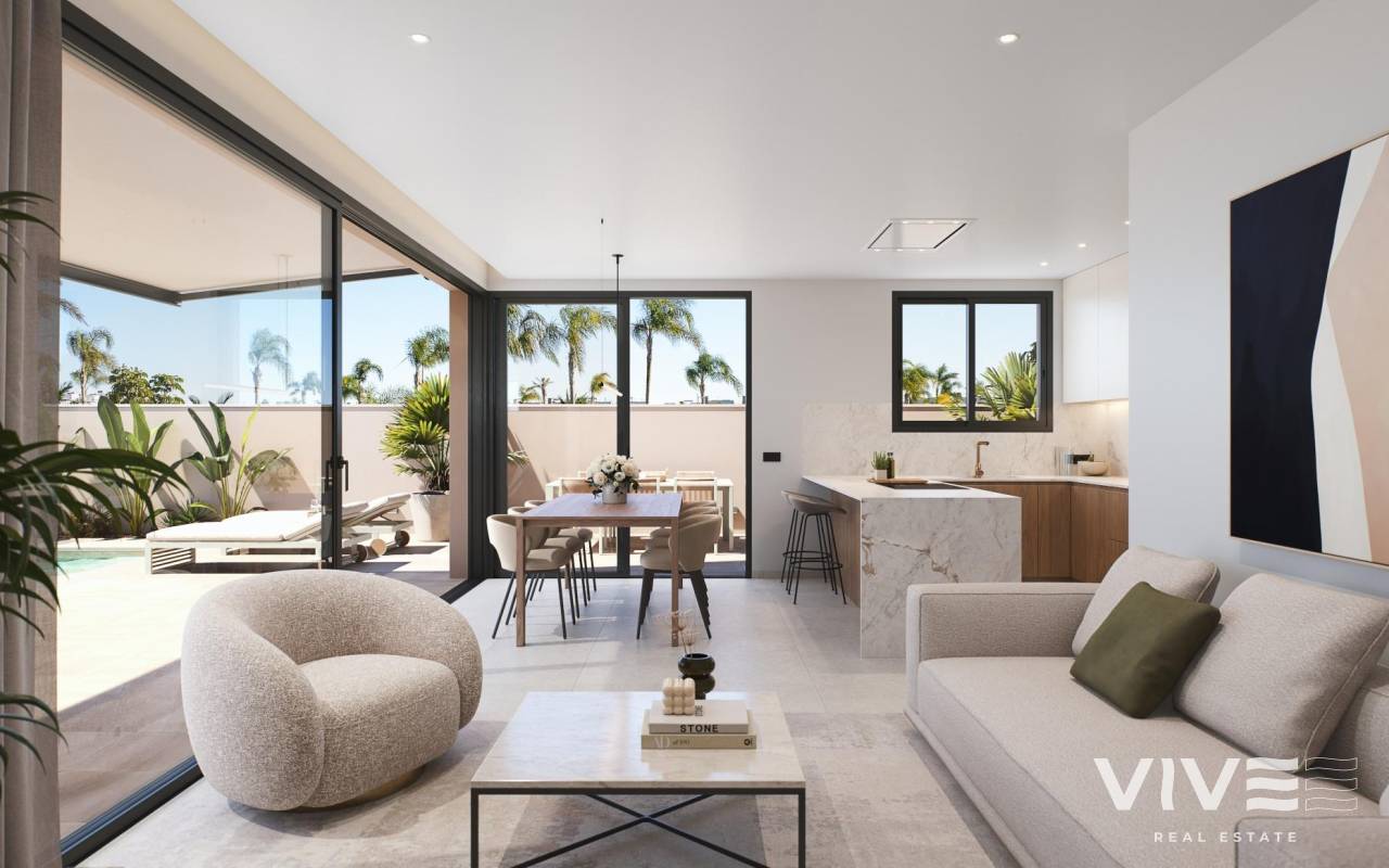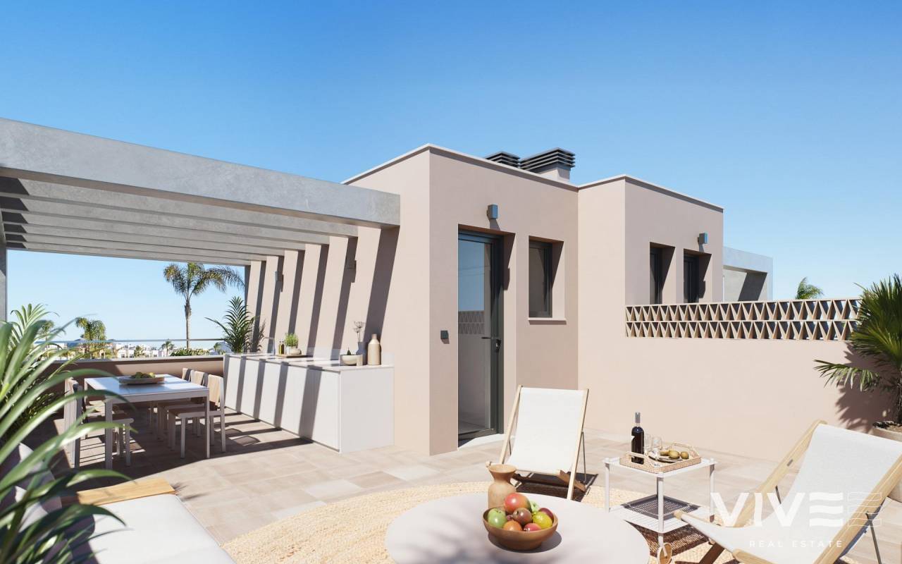 Exclusive residential development of 2 luxury semi-detached villas with sea views on Las Higuericas beach, Torre de la Horadada. Discover these impressive semi-detached homes located in Torre de la Horadada, on the second line of Las Higuericas beach. With a modern and elegant design, spacious rooms and top quality materials, these properties have been designed to offer maximum comfort and exclusivity. With a 5×3m private pool, parking on the plot and a 40 m2 solarium: a spectacular open space ideal for a chill-out area, barbecue or enjoying the sun and unobstructed views. Each villa has independent access from the surrounding streets, as there are no adjacent buildings. With quiet streets and large green areas around the residential complex, these properties are ideal for young families. The villas have a plot of 170 m2 and a built area of 135 m2. The villas are built with three bedrooms and three bathrooms (two of them en-suite) on two floors. The kitchen is fully fitted with the possibility of customisation and includes appliances. Following an open-plan concept, the dining room is surrounded by large windows, providing a pleasant source of natural light, with direct access to the pool and gardens finished with lighting, irrigation and local vegetation. The selected finishes, with top quality materials, the customised luxury design and maximum comfort, together with ducted air conditioning and heating included in all areas, make the villa enjoyable in the hot summers and also in the mild winters, making it possible to live here all year round. Located in one of the best areas of the Costa Blanca, these properties offer a peaceful environment, yet with all amenities nearby: restaurants, supermarkets, golf and shopping centres. The two semi-detached villas are located on the second line of the beach in Las Higuericas, in Torre de la Horadada, a paradise in every way, where you can enjoy the seafront, the immensity of the Mediterranean Sea, the promenade, refreshing swims in the sea, water sports, sailing, surfing, snorkelling and only 8 km from Lo Romero Golf, one of the 21 golf courses on the Costa Blanca. It is 5 minutes from the marina of La Torre de la Horadada and 10 minutes from the marinas of San Pedro del Pinatar, and the best restaurants where you can sample the finest Mediterranean cuisine. Not to mention the proximity of the AP7 motorway, which connects our residential area with two airports with international destinations, Corvera, 44 km away, and Altet, Alicante, 75 km away. The nearest town to the development is Pilar de la Horadada, 1 km away, a quiet village with all kinds of services, schools, health centres, police, pharmacies, etc. There are also two shopping areas nearby, the Dos Mares Shopping Centre in San Javier, 5 minutes away by car, and La Zenia Boulevard in Orihuela Costa, 15 minutes away by car.