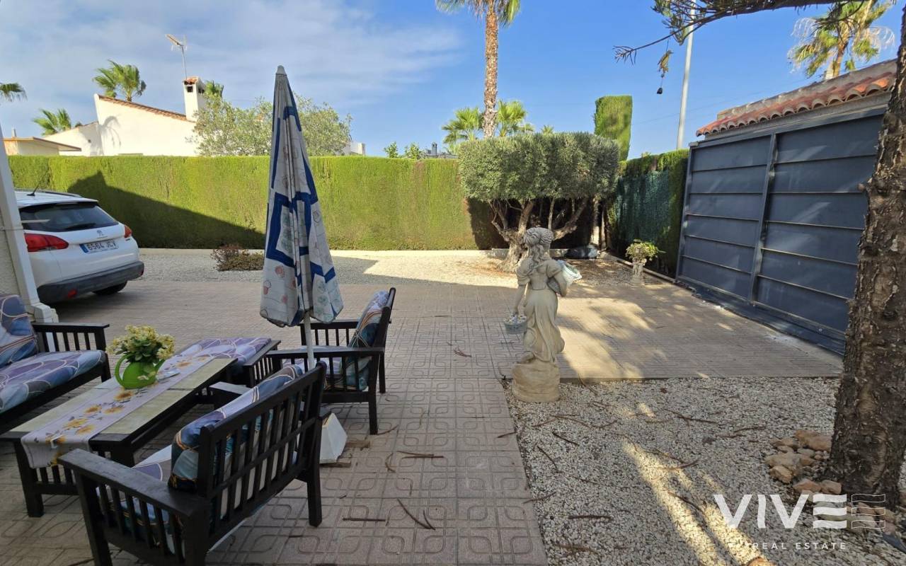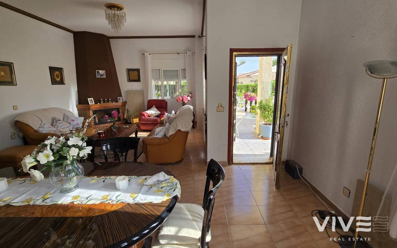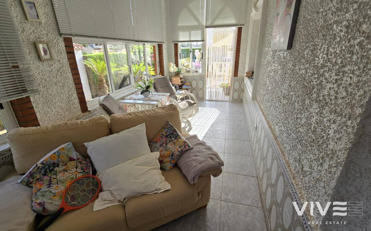 El Chaparral – Detached Villa on One Level with Large Plot and Private Pool. . Located in the peaceful area of El Chaparral, this charming detached villa sits on a generous 800 m² plot and offers a comfortable layout all on one level, with a built area of 188 m².. . The property features 3 spacious bedrooms, one of them with an en-suite bathroom, and a total of 2 bathrooms. It boasts a bright and spacious living-dining room with a fireplace, a large fully equipped independent kitchen, and a wide glazed terrace ideal for year-round enjoyment.. . Outside, you’ll find a fantastic private pool (4x8 m), an additional bathroom, a barbecue area, solarium, and a practical garage — all surrounded by landscaped areas that ensure privacy and comfort.. . A perfect home for those seeking space, peace, and quality of life, close to all amenities.