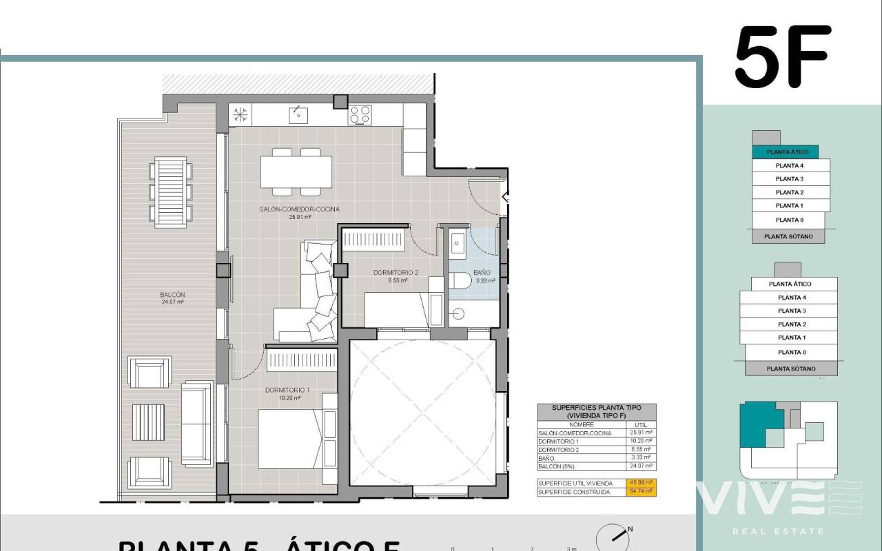 Stylish Residential Building 60 m away from El Acequion Beach at Torrevieja 23 Functional Homes with a selection of 1, 2 and 3 bedroom apartments, and penthouses with large private terraces. Optional parking spaces at underground for additional convenience. Enjoy life just steps from the Mediterranean. Surrounded by everything you need — supermarkets, schools, restaurants, parks, and beach bars — making it the perfect place to live year-round or enjoy as a second home. Each unit is thoughtfully designed to maximize natural light, space, and functionality — with some houses with private terraces or laundry rooms. On the rooftop, residents can enjoy a communal solarium with a relaxing lounge area and a swimming pool, perfect for soaking up the sun and sea breeze all year round. Distances to key points: Acequión Beach: 60 m Torrevieja town centre: 500 m Marina Salinas marina: 1.5 km Torrevieja University Hospital: 5.5 km Villamartín golf course: 10 km Habaneras Shopping Centre: 3 km Alicante Airport: 45 km High-end finishes in every home The homes have been built with top-quality materials and contemporary design: Exterior carpentry in aluminium with thermal break and double glazing Motorised blinds at bedrooms. Armoured entrance door Kitchen equipped with wall and base units Hot water produced by aerothermal system Air conditioning pre installation Baths with furnitures, mirrors and fixed glass at showers. Lift in the building Live a stone's throw from the sea and the town centre Torrevieja is one of the most dynamic and growing coastal towns on the Costa Blanca, famous for its climate, beaches, salt flats and cultural life. This development is ideal as a permanent residence, investment or second home for holidays. Contact us today for more information or to arrange a viewing and secure your home by the sea in Torrevieja.