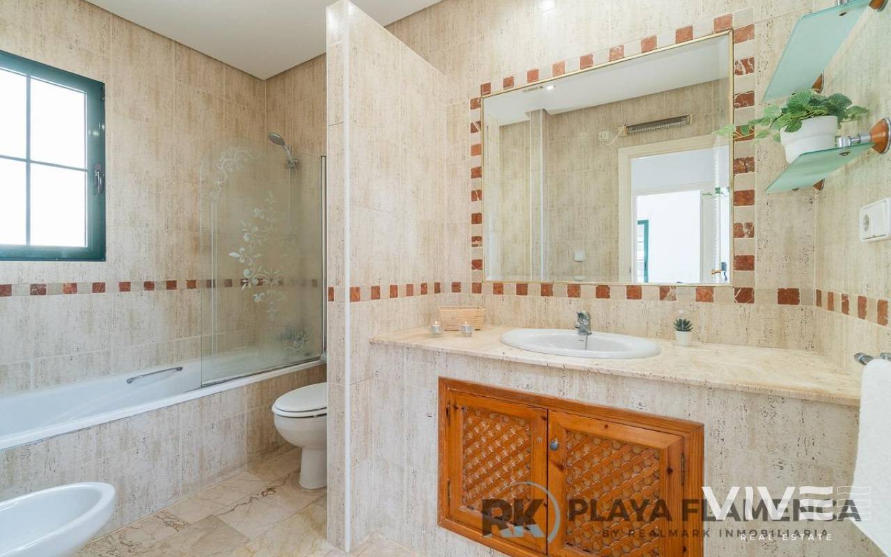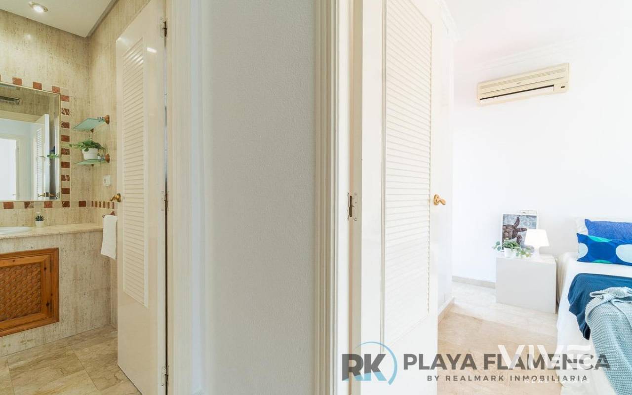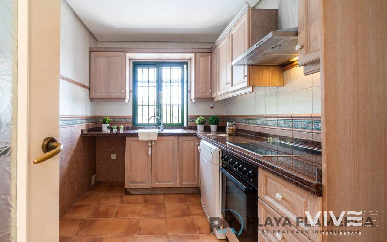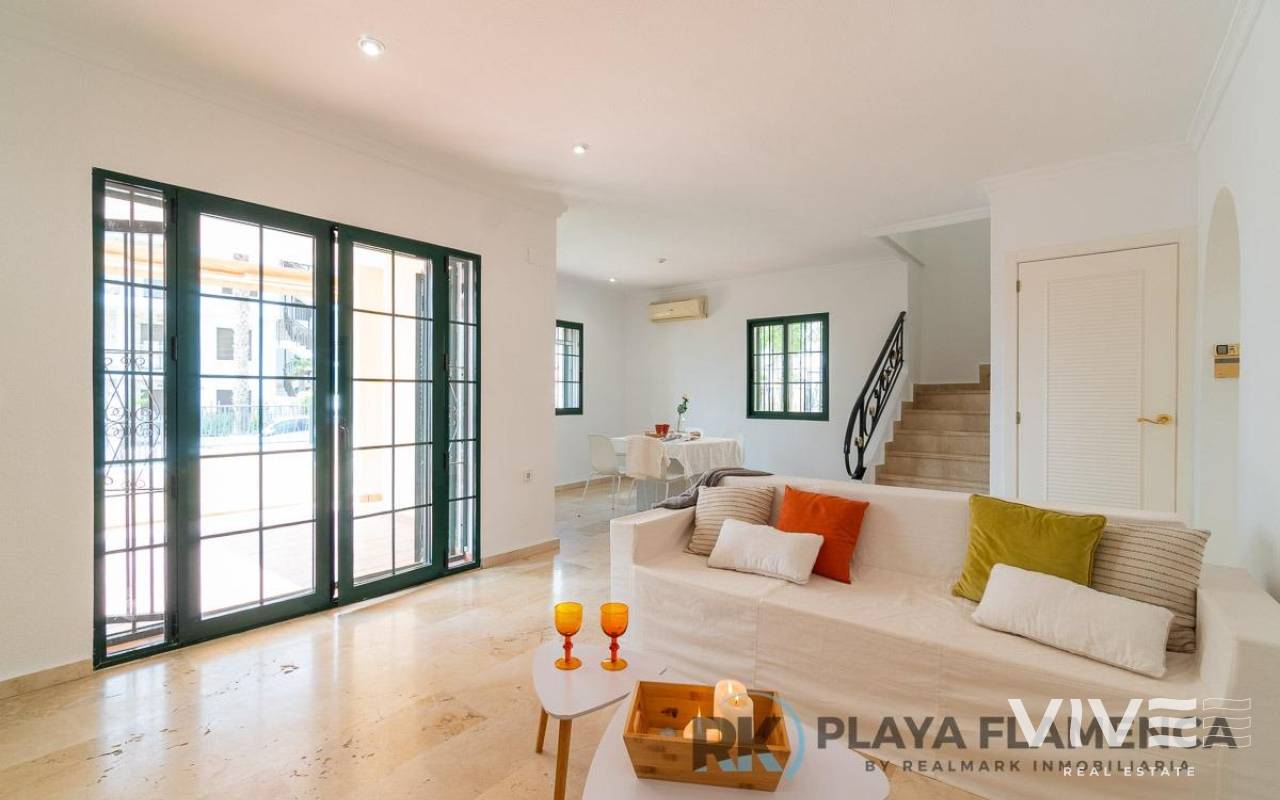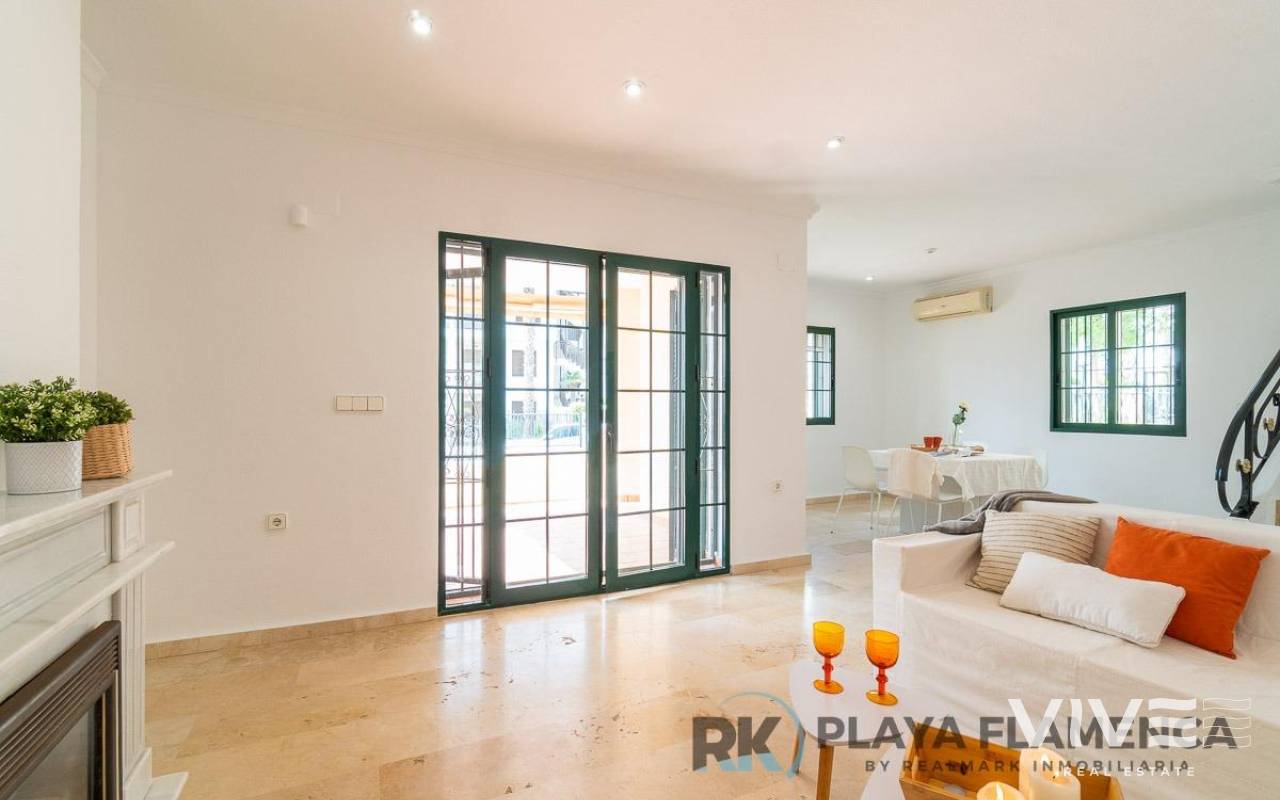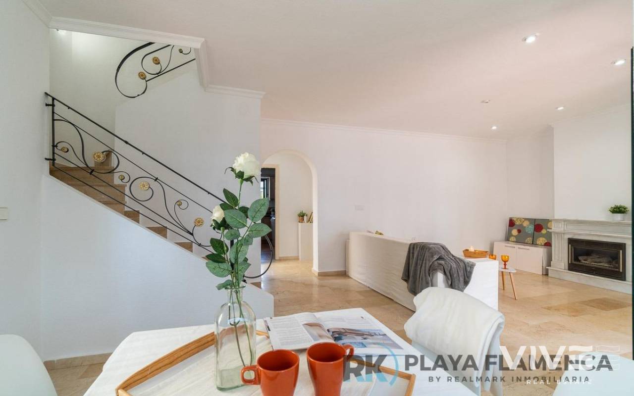 In one of the quietest and most exclusive areas of the VillaMartin development, very close to three golf courses and with its own garden and pool, lies this beautiful villa overlooking green areas, perfect for a large family.. The property is located near three golf courses: Las Ramblas, Campoamor, and Villamartín. It also has easy access to the AP-7 motorway exit, with direct connections to the airports of Alicante (approx. 40 km) and Murcia (approx. 40 km).. It features a communal pool with gardens, where you can enjoy sunbathing and swimming with the rest of the neighbors. It also has its own garden and tiled terraces, and a pool in need of renovation.. The villa's size is ideal for those looking for space, or for entertaining guests and friends; with its 3 bedrooms, 2 bathrooms, and a good-sized plot and garden area.. The 410-square-meter plot is perfect for having space and a sense of independence, with its paved front garden with a vehicle entrance and a paved rear garden with unobstructed views. However, since it's paved and doesn't have many trees and plants, it doesn't require much maintenance or work. The villa faces south on its main facade, terraces, and solarium, so it has sun practically all day. This villa is undoubtedly the dream of many.. And the layout of the home: accessed from the garden, as mentioned, is the first terrace, facing south-southwest. It has sun all day long, but at the same time, being open to the garden and the street, it lets in a full breeze. This spacious terrace, with room for sofas and tables, leads to the main entrance of the home with a security door, which opens onto the spacious and bright living and dining area with a fireplace. It also has a separate kitchen with its own door and window, allowing you to cook without having to worry about odors and grease entering the rest of the home.. Also on the ground floor is a spacious bedroom with a built-in wardrobe and a bathroom with a walk-in shower. This means that if the family has an elderly person or someone with mobility issues, they can live on this floor alone without having to go up and down stairs.. The first floor, accessible via the two-flight interior staircase with easy access, leads to the other two bedrooms with built-in wardrobes and direct access to the large solarium and balcony. This floor also features a second bathroom, this time with a bathtub for relaxing soaks and built-in furniture.. This means that each floor has its own bathroom, bedrooms, and space to enjoy both the outdoors and indoors, with terraces, making it the perfect home for a large family.. . The home is worth a visit for its spaciousness, its light, its proximity to all amenities and the golf course, and its tranquility.