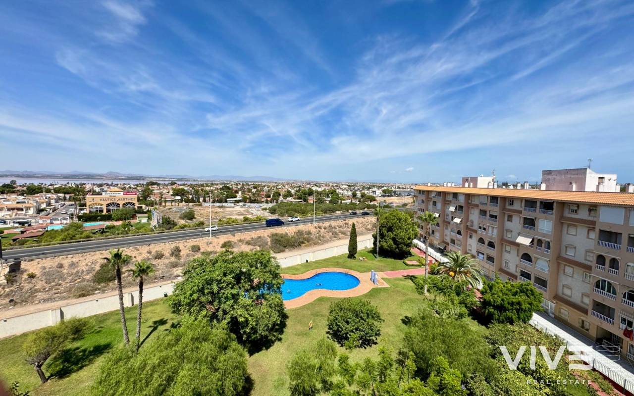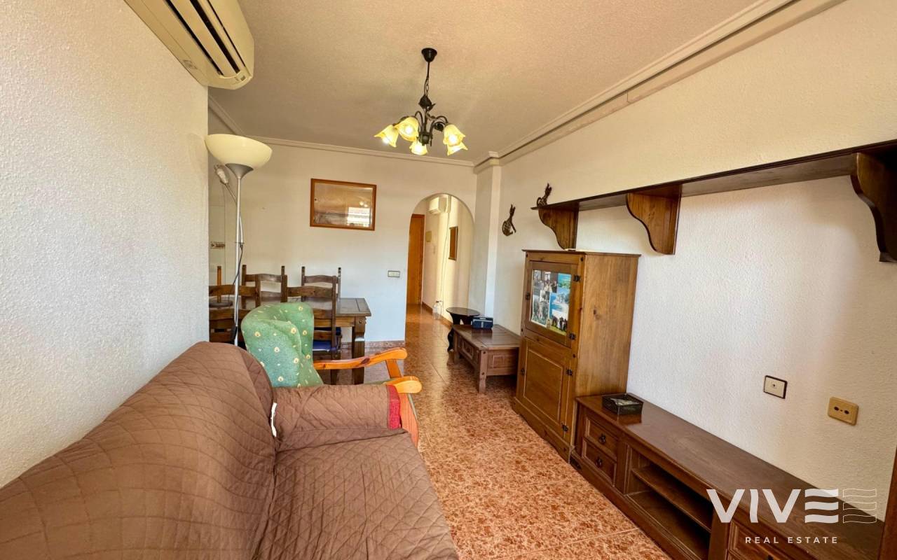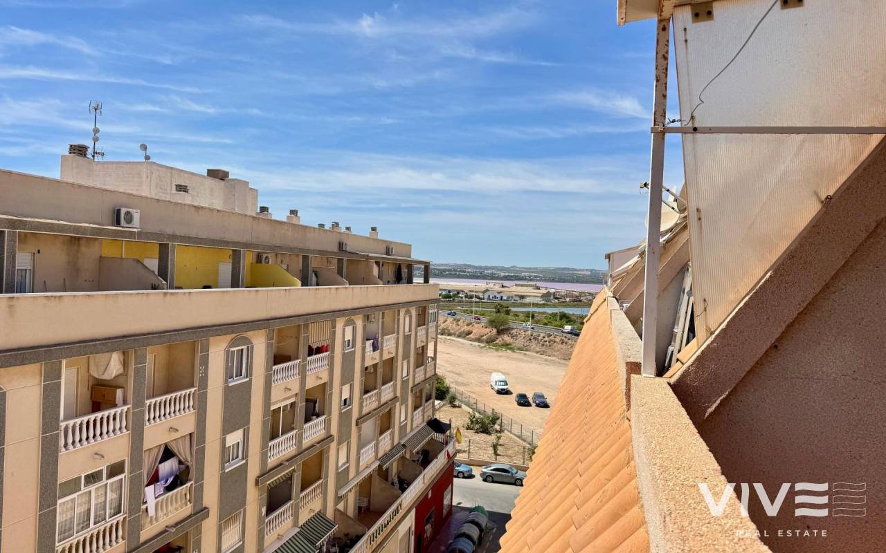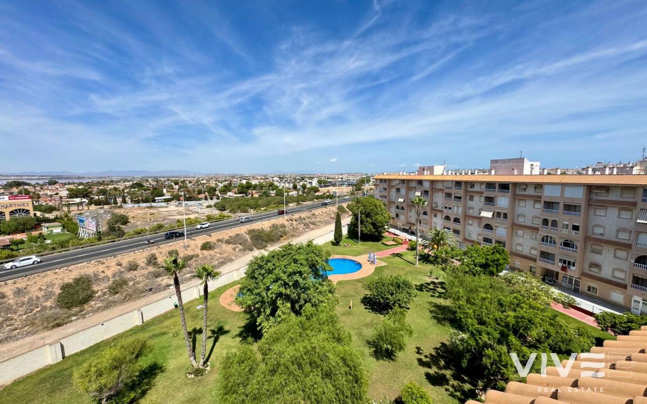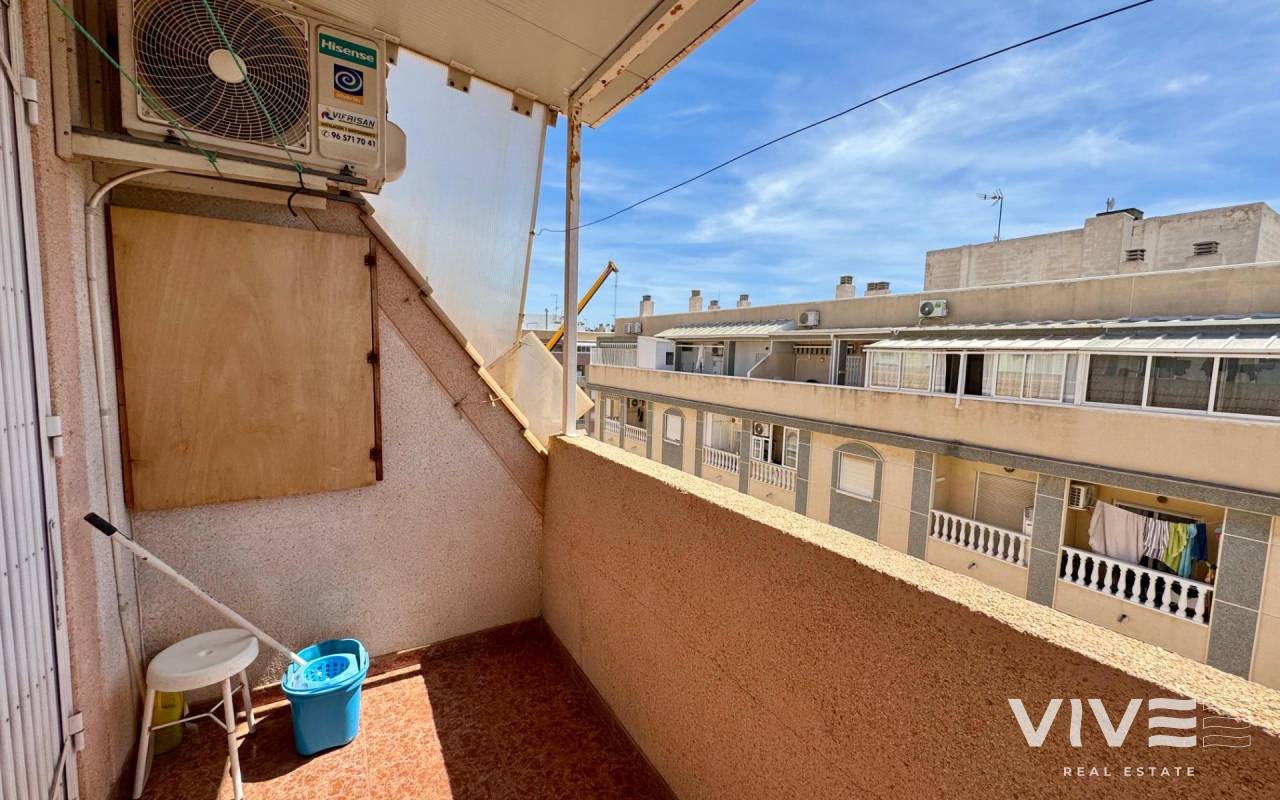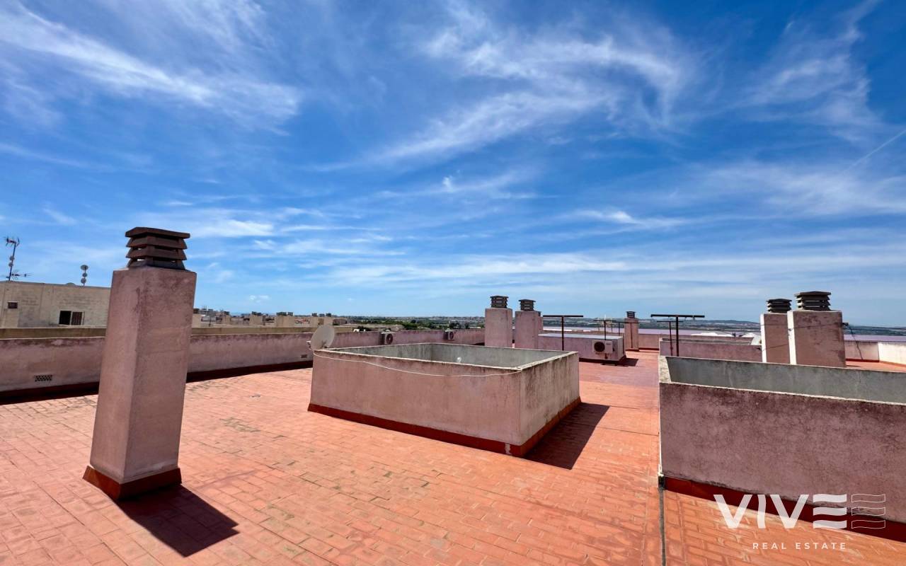 . Discover this fantastic penthouse in Torrevieja, perfectly oriented to the south to enjoy the best natural light all day long and located just a few minutes from the sea.. . Main features:. . 2 spacious bedrooms. . 1 full bathroom. . Bright living-dining room. . Fully equipped independent kitchen. . Large terrace, ideal for relaxing or outdoor gatherings. . Sold furnished and with air conditioning. . Optional garage. . Communal areas:. . Swimming pool. . Green areas to walk and enjoy with the family. . Prime location:. Surrounded by all services (supermarkets, restaurants, transport, shops, etc.) and within walking distance to the sea.. . A unique opportunity to live in a privileged environment with all the comforts, perfect both as a permanent residence and as a holiday home.
