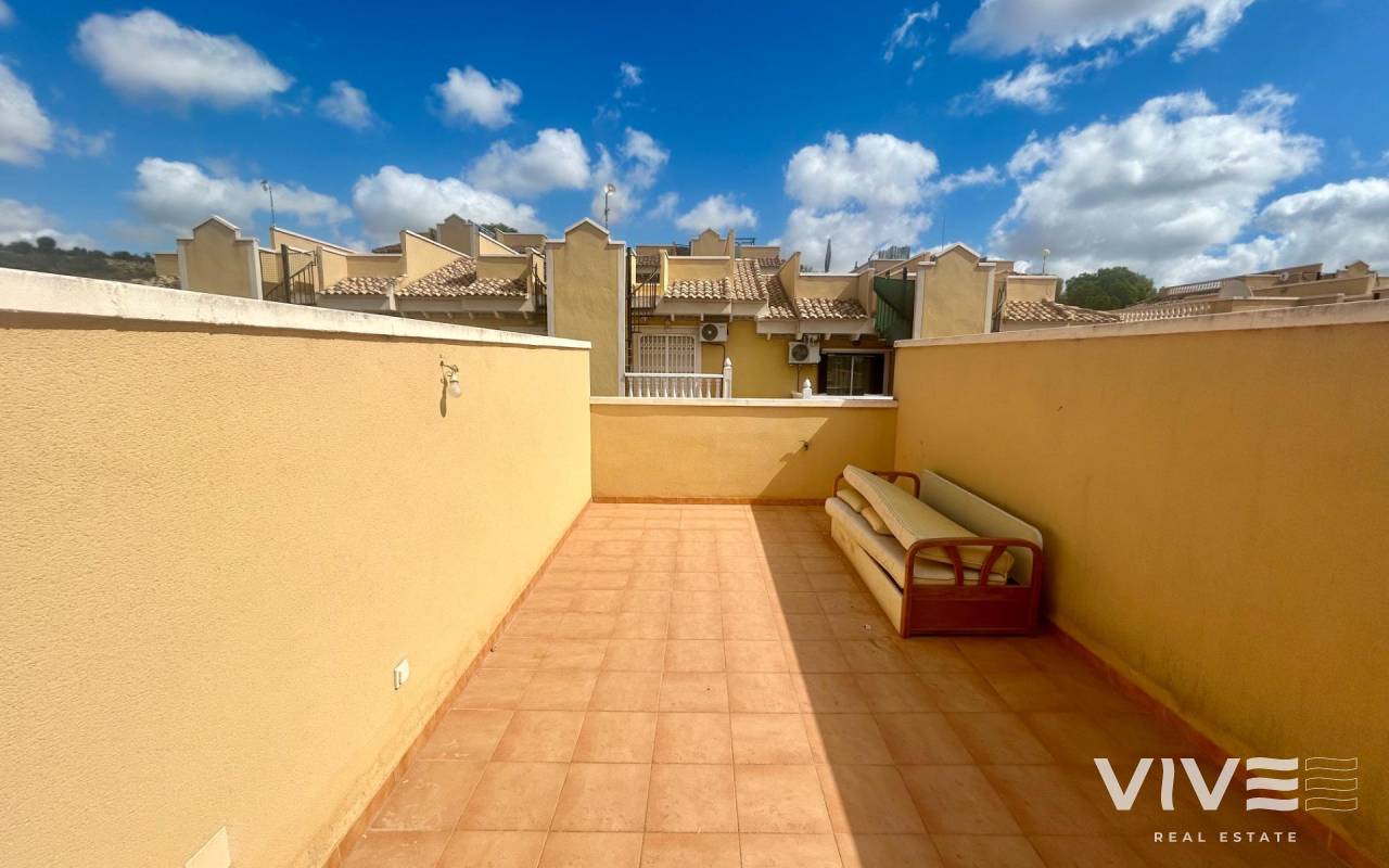Townhouse Triplex for Sale in Montemar Urbanization, next to La Finca Golf in Algorfa (Costa Blanca)~Discover this beautiful triplex townhouse for sale in Algorfa, located in the exclusive Montemar urbanization, just a short walk from the prestigious La Finca Golf Resort. A privileged location on the Costa Blanca, perfect both for holidays and for year-round living.~The property is distributed over several levels:~Ground floor: spacious private garage with direct internal access to the house.~First floor: bright living-dining room, open-plan kitchen, bathroom, and two terraces, one of them with lovely views of the green area.~Second floor: two bedrooms, a complete bathroom, and another terrace with open views.~Top floor: large and sunny private solarium, ideal for relaxing and enjoying the Mediterranean climate with beautiful views of the natural surroundings.~The residential complex offers a communal swimming pool and is set in a peaceful area, close to all amenities, shops, and only a short drive to the beaches of Guardamar del Segura and Torrevieja.~This triplex for sale in Montemar – Algorfa combines comfort, a great location, and an unbeatable environment to enjoy the Mediterranean lifestyle.