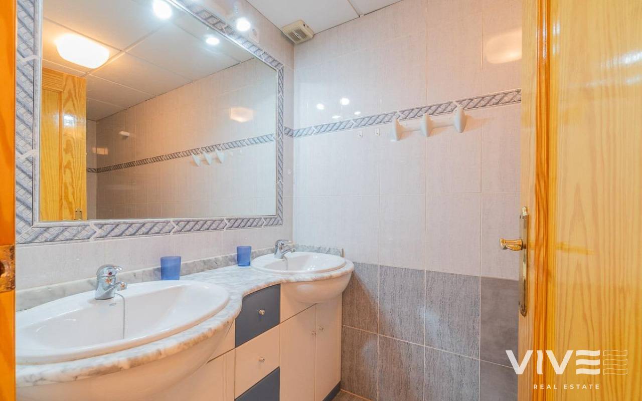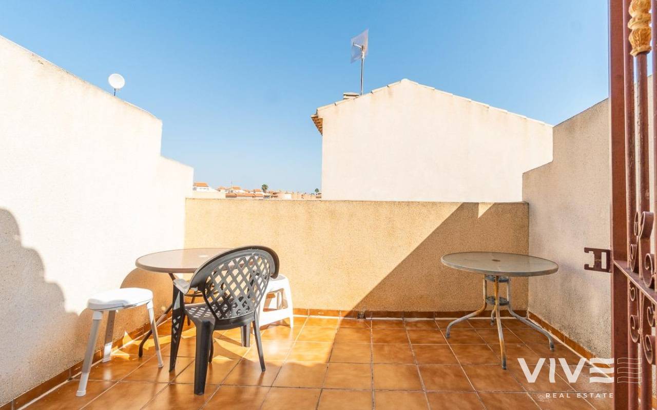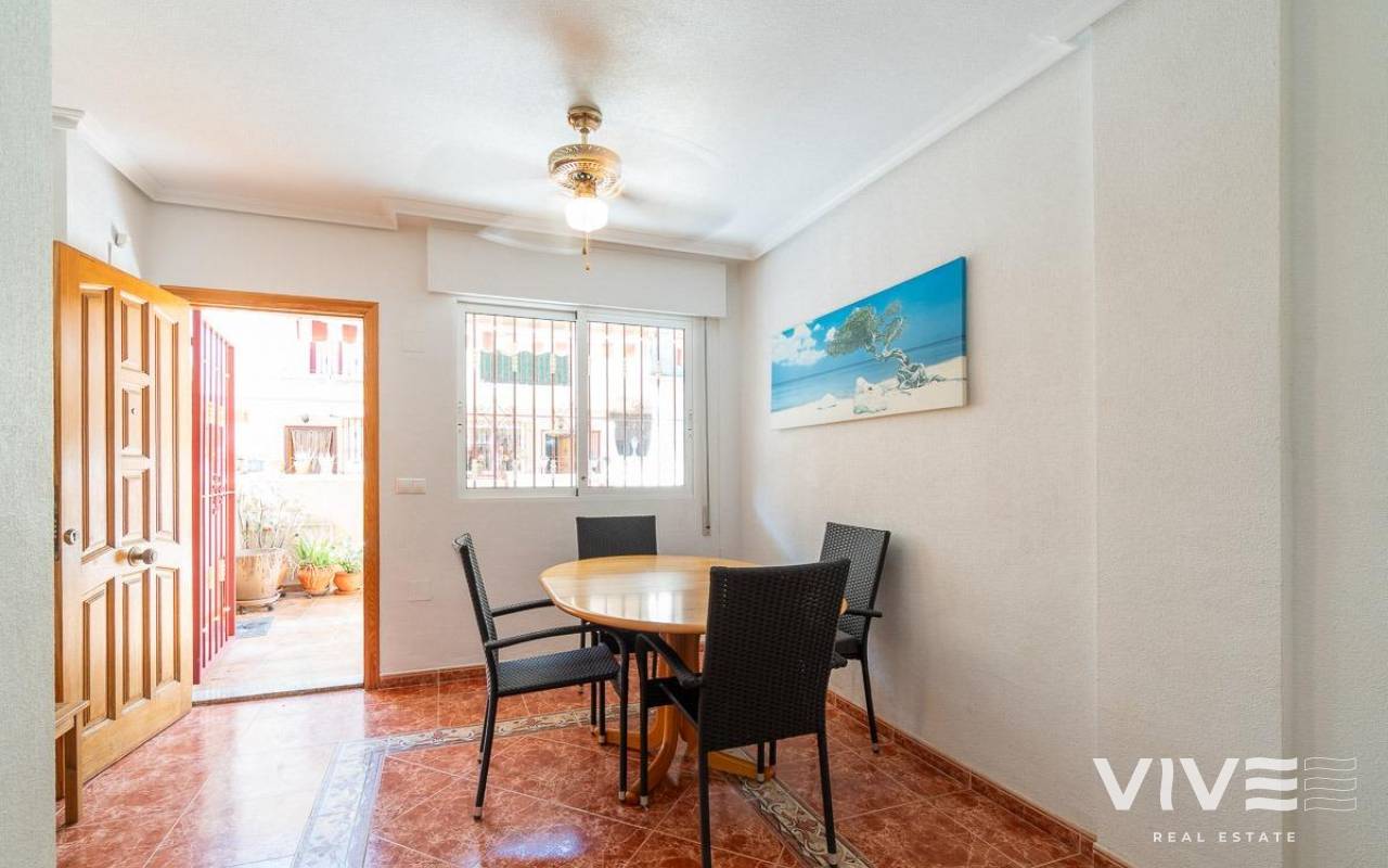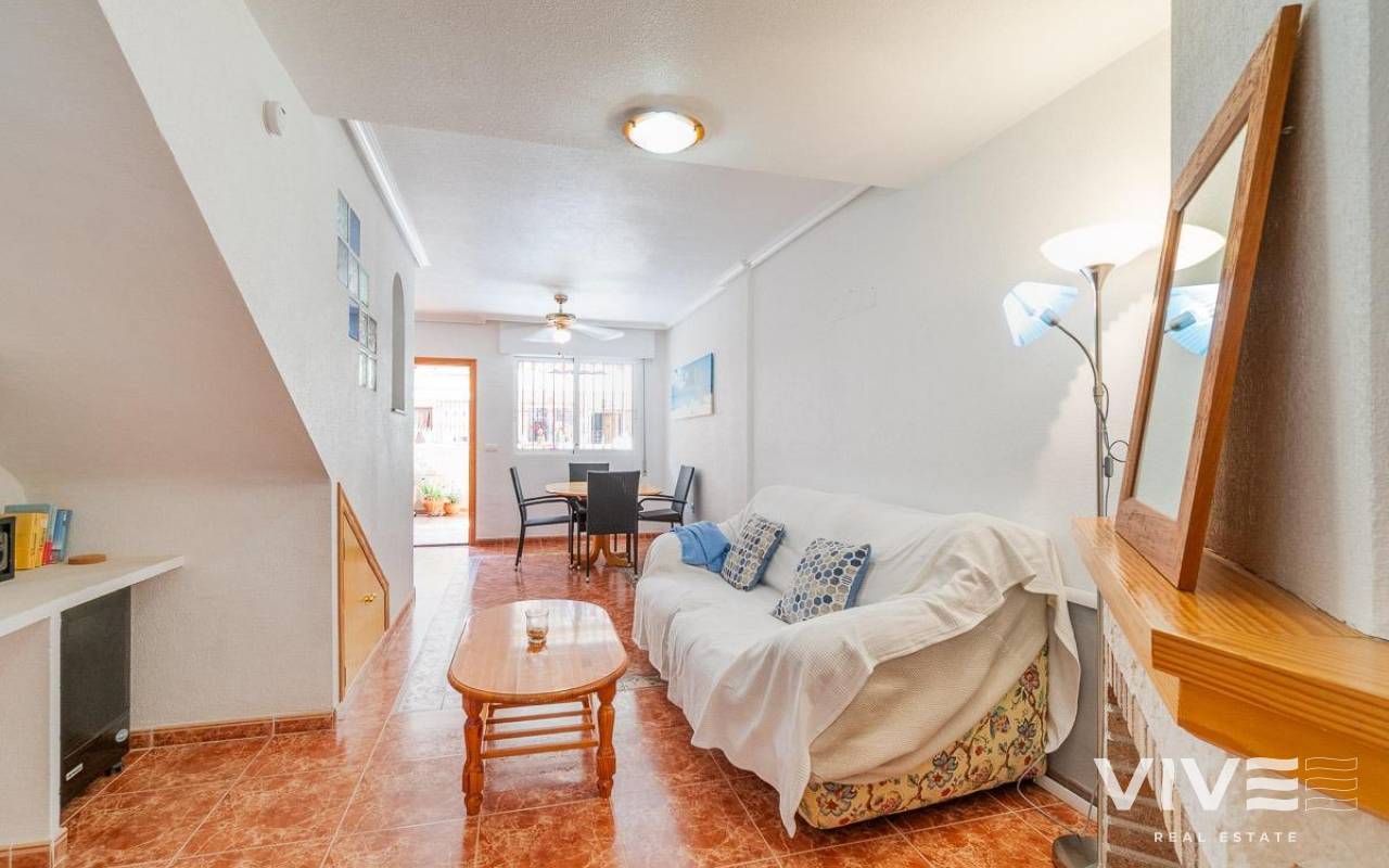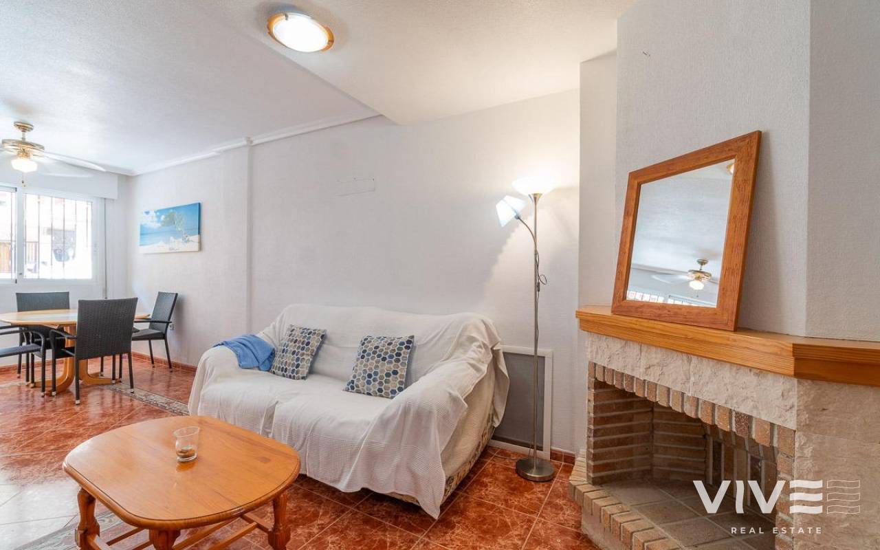 . 1.997 / 5.000. In the heart of Playa Flamenca, just a short walk from the Zenia Boulevard shopping center, beaches, sports facilities, leisure areas, and schools, you'll find this beautiful and bright south-facing semi-detached triplex.. . The property is located within a gated community with automatic gates, ample parking on the access streets, and a central communal pool area, offering privacy and peace from noise and traffic. Its south-facing orientation ensures sunshine practically all day long, and it also features a solarium at the rear, providing shade during the summer months when the front of the house is too hot. A terrace at the front entrance offers year-round sun enjoyment. The house features a living-dining room with a fireplace, a separate kitchen allowing for cooking with the door closed and preventing cooking smells and grease from spreading to the rest of the house, and direct access from the kitchen to a covered patio with an aluminum and glass roof. This patio can be used as a second living room, a laundry room, or even a bedroom for those who cannot access the upper floors, as it includes a bathroom with a shower. The first floor, accessed via an internal staircase, comprises two bedrooms with built-in wardrobes, one of which has a balcony, and a full bathroom with a walk-in shower. The third and top floor offers a third attic bedroom with an en-suite bathroom and shower, perfect for children or teenagers, as it features a solarium-terrace accessible only from this level. The house is furnished, includes all kitchen appliances, and is in perfect working order, ready for immediate occupancy. Whether as a holiday home or for year-round living, it's worth a visit to discover its many advantages and uses.