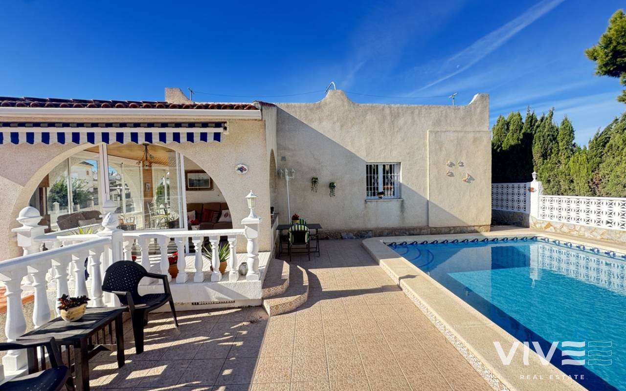 Stunning detached villa with private pool, located in the sought-after Blue Lagoon area of Orihuela Costa. This beautifully presented property boasts breathtaking views of the Torrevieja coastline and Orihuela mountains. Main Floor: - 2 spacious bedrooms with en-suite bathrooms - Large lounge with open-plan kitchen - Wrap-around glazed terrace with seating areas, perfect for alfresco dining and relaxation - Natural piped gas central heating and gas boiler Downstairs: - Self-contained 1-bedroom apartment with bathroom - Various store rooms and covered outdoor kitchen area Additional Features: - Large rooftop solarium with stunning views - Private pool - 2 outside storage cupboards Ideal Location: - Blue Lagoon is a tranquil and exclusive area, known for its beautiful beaches and crystal-clear waters - Close proximity to golf courses, sports facilities, and scenic walking routes - Easy access to the main road, with links to nearby towns and cities A Rare Find: This lovely villa offers a perfect blend of comfort, convenience, and relaxation. Don't miss the opportunity to make it your home or holiday retreat! Viewing Recommended: Contact us to arrange a viewing and make this stunning villa your own.