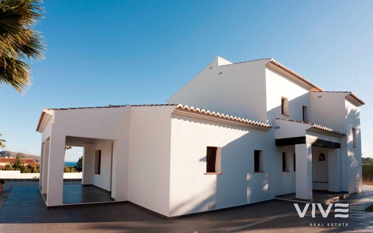 Mediterranean Style Villa with Sea Views for Sale in Moraira, Costa Blanca Elegant Villa with Panoramic Sea Views This beautiful Mediterranean-style villa for sale in Moraira (Costa Blanca, Alicante) offers breathtaking open views of Cape Moraira, the sea and the surrounding coastline. Set on a hilltop, the property enjoys total privacy and tranquility while remaining just 2 km from the vibrant center of Moraira, its golden beaches, supermarkets, restaurants and cafés. Built on a nearly flat plot of 897 m2, the villa provides exceptional comfort, beautiful outdoor spaces and stunning views from all main rooms. Spacious Layout Over Two Floors The villa is distributed over two levels designed to maximize natural light and sea views. On the ground floor, there is a bright living-dining room with a fireplace, a space ready for the installation of a modern kitchen and laundry area (pre-installed plumbing and electricity), and a complete bathroom with a shower. This floor also features a connected yet independent guest apartment with its own entrance, consisting of a living-dining area that could serve as a master suite, a bedroom, a bathroom and an additional space pre-fitted for a dressing room or en-suite bath. The apartment’s entrance showcases a beautifully restored solid wood door, adding authentic Mediterranean charm. On the upper floor, accessed by internal stairs, you will find two comfortable bedrooms, a bathroom and a large solarium terrace with spectacular sea views—perfect for relaxing or enjoying the sunset. Outdoor Living and Mediterranean Charm The villa’s exterior is designed for enjoying the Mediterranean lifestyle to the fullest, featuring spacious terraces, a uniquely shaped private pool with an outdoor shower and an easy-to-maintain garden with automatic irrigation. There is ample space for outdoor dining, sunbathing and entertaining family and friends. High Quality Features and Finishes This property offers modern comfort combined with Mediterranean character, including Aluminum carpentry with wood effect finish and double glazing Motorized blinds and mosquito nets in bedrooms Built-in wardrobes with sliding doors Central heating by radiators Adjustable interior lighting Motorized sliding vehicle gate and pedestrian access Private parking within the plot Prime Location Near Key Amenities Moraira town center and beaches: 2 km La Sella Golf Course: 15 km Port of Moraira: 2 km Shopping centers: 5 km Alicante International Airport: 90 km Experience Mediterranean Living at Its Best This exceptional villa combines privacy, elegance and stunning sea views in one of Costa Blanca’s most desirable locations. Contact us today to arrange a viewing or to request more information about this beautiful home in Moraira.