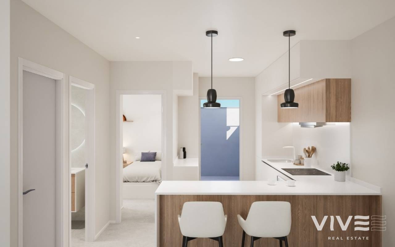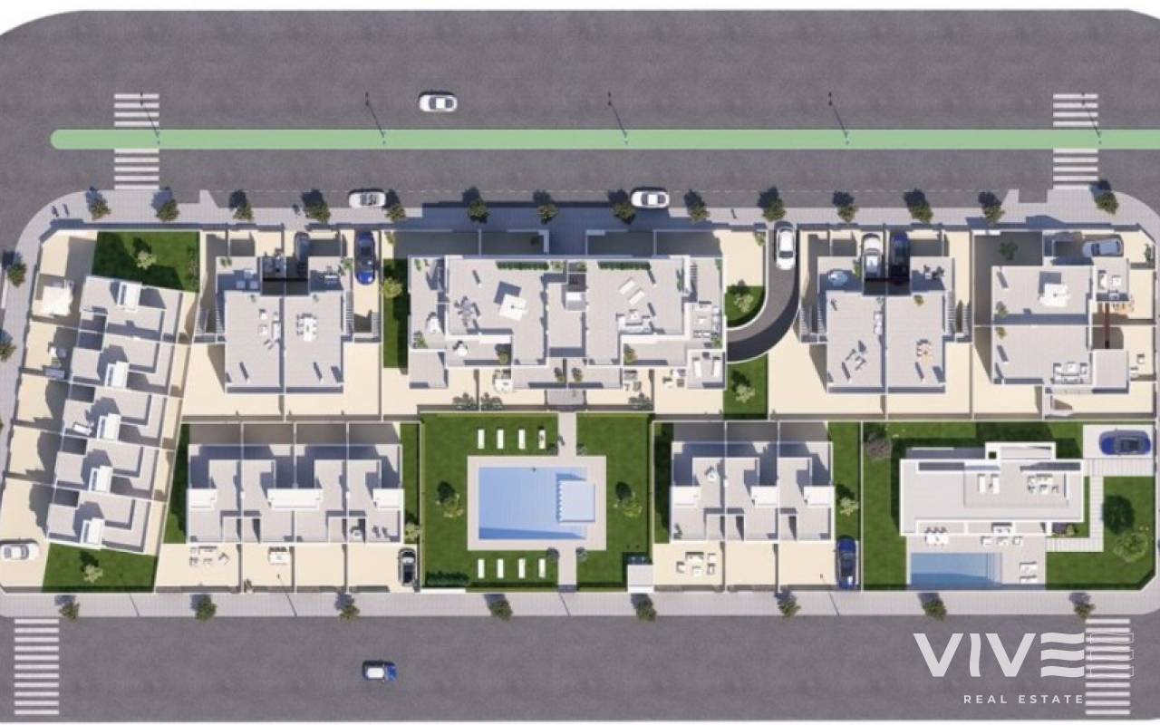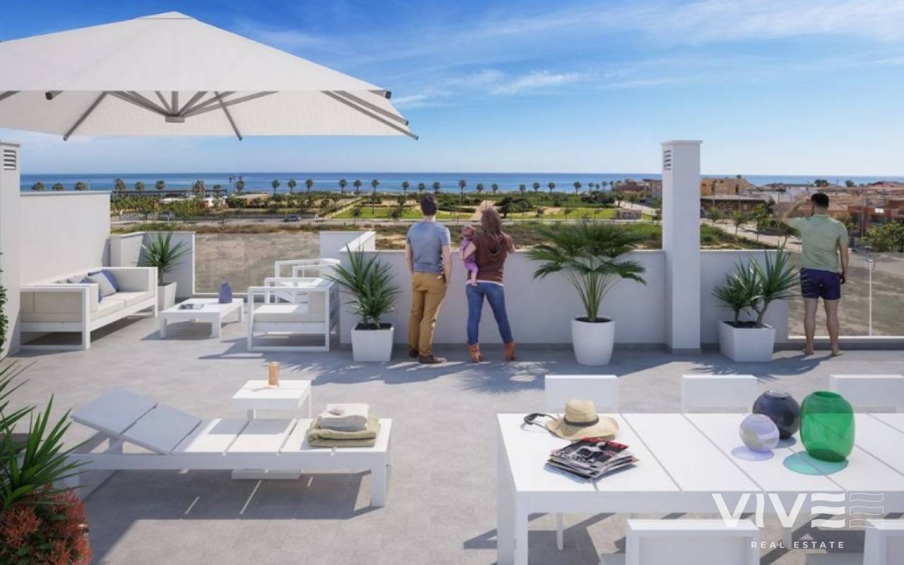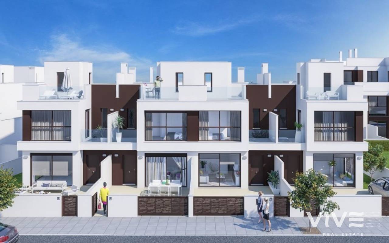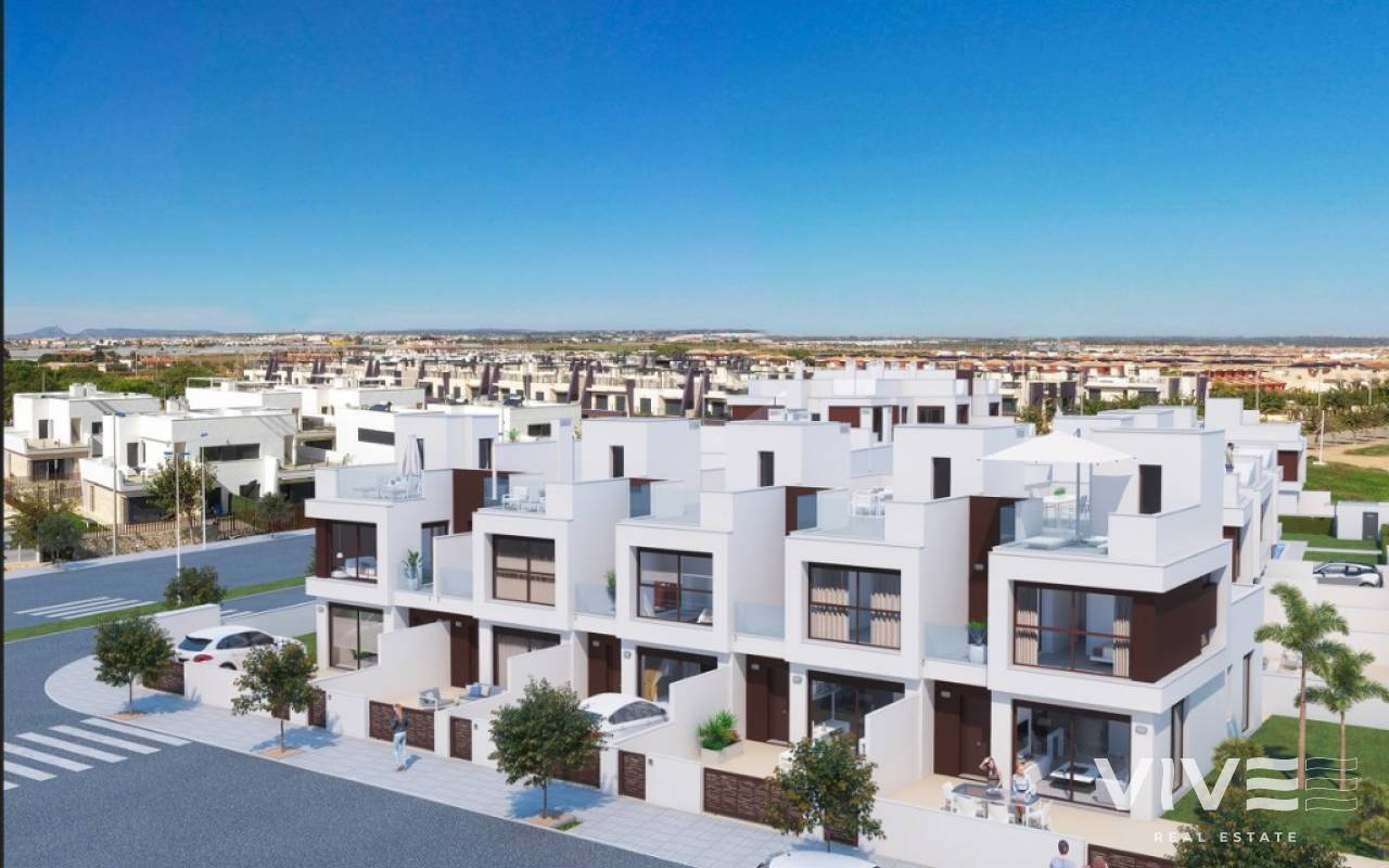 New build townhouses close to the beach in Torre de HoradadaNew townhouses is located only 600 meters from the magnificent sandy beach, in excellent peaceful area.Townhouses have 3 bedrooms, 2 bathrooms, living room, kitchen, spacious solarium and terrace.The nearest sandy beaches just a few minutes walk away. The houses is located in the beautiful town of Torre de Horadada, in a short walking distance to amenities, shops, cafes, restaurants, banks.10 minutes drive to the prestigious golf courses of Campoamor, Villamartín, Las Ramblas and 45 minutes to La Manga Golf Club.